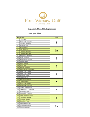 Captain's Day 28th September shot gun 10:00 No 1 2 3 4 5 6 7 8 9 10 11 12 13 14 15 16 17 18 19 20 21 22 23 24 25 26 27 28 29 30 31 32 33 34 35 Name Carey Bill Zawada Grzegorz Jesionek Andrzej Musiolik Jan Bailey David Jeff Peterson Grzesiak Monika Grzesiak Kacper Knigawka Andrzej Bejm Tomasz Koperski Wojciech Burdzy Jerzy Sowa Marek Sklar Bob Kilian Tadeusz Stańczak Włodzimierz Tran Van Thuan John Van Kannel Minfold Levis Butchel Jeff Stefański Marcin Orzech Jacek Miszczak Maciej Miszczak Wojciech Fedorczuk Roman Aleksandra Tymińska Tymiński Marek Litwiniuk Tomasz Zabielski Krzysztof Niewczas Leszek Gonicki Marek Robełek Piotr Staszowski Jerzy Przybylski Paweł Dyzio Andrzej Hole 1 1a 2 3 4 5 6 7 7a 7a 36 37 38 39 40 41 42 43 44 45 Górski Andrzej Paterson Brian Tavi Nimrod Elżbieta Panas Sebastian Fronc Kwon Dong Seok Seo Jong Hak Kwon Yon Kwon Jeon Chol Su Strzelecki Andrzej 46 Strzelecki Antoni 47 Sobczyńska Joanna 48 Guz Adam 8 9 10 49 Wygonowska Bożena 50 Czarnoba Justyna 51 Daniel Raemy 52 Simon Boyd 11 53 Nguyen Duc Huy 54 Bui Dang Hien 55 Vu Hai Son 56 Nguyen Duy Dan 12 57 Czykieta Agnieszka 58 59 60 61 62 63 64 65 66 67 68 69 70 71 72 73 74 75 76 77 78 79 80 81 82 83 84 Bartkowiak Krzysztof Słowik Agnieszka Drzewiecki Sebastian Lipka Janusz Nguyen Khac Sinh Rakowski Sławomir Nguyen Tien Minh Tran Van Binh Hoang Tuan Viet Hoang Van Hiep Tran Anh Tuan Jung Mi - Shin Lee Sang Wong Bejm Paweł Banaśkiewicz Sławomir Vu Xuan Bach Nguyen Quang Vinh Nguyen Dinh Ha Quang Dien Klejment Mirosław Pham Duong Quoc Tuan Chejdys Grzegorz Ruciński Marcin Ambasador Tajwanu Cooper Hwang Kevin Kvo Drożdż Jerzy 12a 13 13b 14 15 16 17 85 86 87 88 89 90 90 92 93 94 95 96 97 Chambers Mark Chambers Nick Cowen Paul Guen Yann Bury Krzysztof Bury Elżbieta Budner Ewa Budner Marek Macygon Andrzej Martyniak Szymon Oleszkiewicz Marcin Maciąga Rafał Vu Cao Son 18 18a
