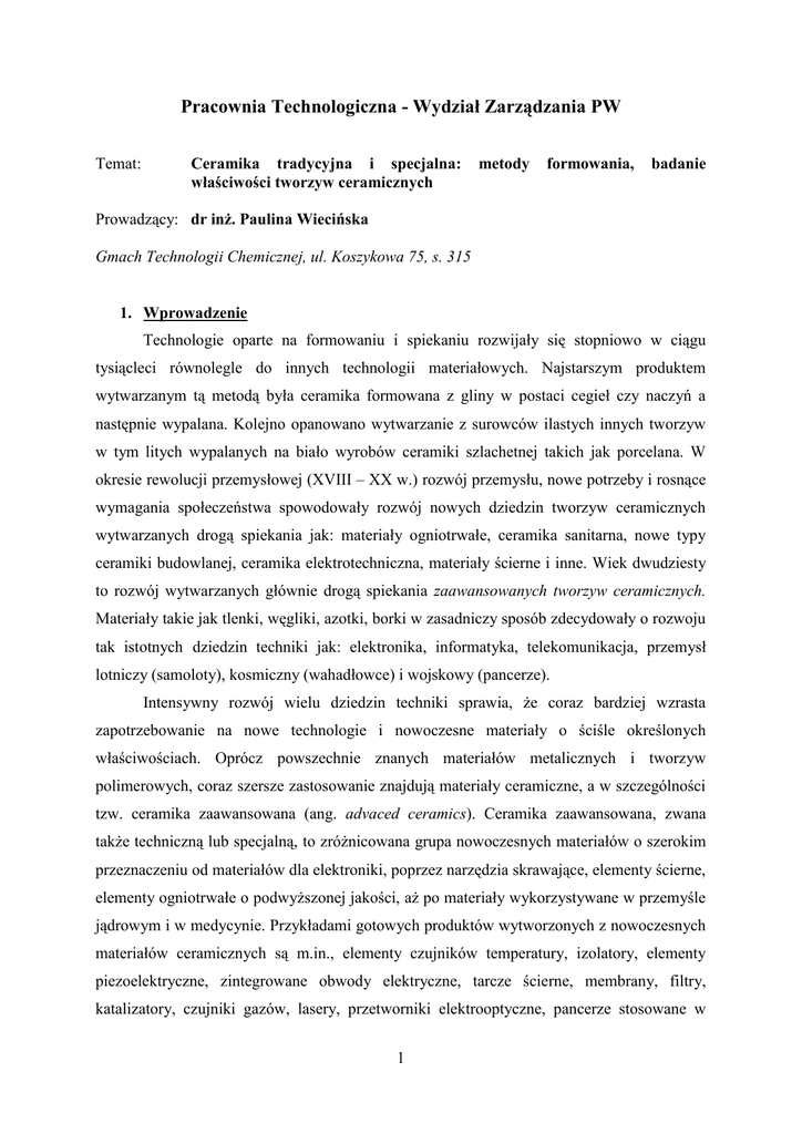 Pracownia Technologiczna - Wydział Zarządzania PW Temat: Ceramika tradycyjna i specjalna: właściwości tworzyw ceramicznych metody formowania, badanie Prowadzący: dr inż. Paulina Wiecińska Gmach Technologii Chemicznej, ul. Koszykowa 75, s. 315 1. Wprowadzenie Technologie oparte na formowaniu i spiekaniu rozwijały się stopniowo w ciągu tysiącleci równolegle do innych technologii materiałowych. Najstarszym produktem wytwarzanym tą metodą była ceramika formowana z gliny w postaci cegieł czy naczyń a następnie wypalana. Kolejno opanowano wytwarzanie z surowców ilastych innych tworzyw w tym litych wypalanych na biało wyrobów ceramiki szlachetnej takich jak porcelana. W okresie rewolucji przemysłowej (XVIII – XX w.) rozwój przemysłu, nowe potrzeby i rosnące wymagania społeczeństwa spowodowały rozwój nowych dziedzin tworzyw ceramicznych wytwarzanych drogą spiekania jak: materiały ogniotrwałe, ceramika sanitarna, nowe typy ceramiki budowlanej, ceramika elektrotechniczna, materiały ścierne i inne. Wiek dwudziesty to rozwój wytwarzanych głównie drogą spiekania zaawansowanych tworzyw ceramicznych. Materiały takie jak tlenki, węgliki, azotki, borki w zasadniczy sposób zdecydowały o rozwoju tak istotnych dziedzin techniki jak: elektronika, informatyka, telekomunikacja, przemysł lotniczy (samoloty), kosmiczny (wahadłowce) i wojskowy (pancerze). Intensywny rozwój wielu dziedzin techniki sprawia, że coraz bardziej wzrasta zapotrzebowanie na nowe technologie i nowoczesne materiały o ściśle określonych właściwościach. Oprócz powszechnie znanych materiałów metalicznych i tworzyw polimerowych, coraz szersze zastosowanie znajdują materiały ceramiczne, a w szczególności tzw. ceramika zaawansowana (ang. advaced ceramics). Ceramika zaawansowana, zwana także techniczną lub specjalną, to zróżnicowana grupa nowoczesnych materiałów o szerokim przeznaczeniu od materiałów dla elektroniki, poprzez narzędzia skrawające, elementy ścierne, elementy ogniotrwałe o podwyższonej jakości, aż po materiały wykorzystywane w przemyśle jądrowym i w medycynie. Przykładami gotowych produktów wytworzonych z nowoczesnych materiałów ceramicznych są m.in., elementy czujników temperatury, izolatory, elementy piezoelektryczne, zintegrowane obwody elektryczne, tarcze ścierne, membrany, filtry, katalizatory, czujniki gazów, lasery, przetworniki elektrooptyczne, pancerze stosowane w 1 przemyśle zbrojeniowym, elementy osłon silników odrzutowych i rakietowych, elementy osłon samolotów, rakiet i pojazdów kosmicznych, protezy medyczne, sztuczne zastawki serca, sztuczne korzenie zębów i wiele innych. W celu wytworzenia powyższych elementów konieczne jest zastosowania surowców ceramicznych o odpowiednich właściwościach. Kolejnym istotnym etapem produkcyjnym jest uformowanie materiału, czyli nadanie mu kształtu jak najbardziej zbliżonego do kształtu finalnego produktu. 2. Formowanie proszków ceramicznych Formowanie jest jednym z najważniejszych etapów procesu wytwarzania wyrobów ceramicznych, w którym nieskonsolidowany ceramiczny materiał wyjściowy zostaje przekształcony w zwarty, zagęszczony półprodukt o określonej geometrii i mikrostrukturze. Uformowany element jest następnie poddawany procesowi spiekania w wysokich temperaturach, pod wpływem którego uzyskuje on właściwości typowe dla tworzyw ceramicznych. Obróbka mechaniczna wyrobów ceramicznych po procesie spiekania jest skomplikowana i kosztowna. Konieczne jest więc odpowiednie dobranie metody formowania tak, aby uformowany półprodukt po spiekaniu był możliwie najbliższy gotowemu wyrobowi pod względem kształtu i wymiarów. W przemyśle ceramicznym stosuje się wiele metod formowania, a o wyborze sposobu formowania decydują m.in. takie kryteria jak: geometria, wielkość partii formowanego wyrobu, jakość materiału czy zaplecze techniczne. W obrębie formowania wyrobów tzw. ceramiki specjalnej lub ceramiki zaawansowanej można wyróżnić następujące, najbardziej rozpowszechnione metody formowania ujęte w trzy grupy technologiczne: formowanie przez prasowanie formowanie plastyczne formowanie przez odlewanie. 2.1. Formowanie przez prasowanie Jest to jedna z najprostszych i najbardziej rozpowszechnionych metod otrzymywania wyrobów ceramicznych i metalurgicznych. Formowanie przez prasowanie można zdefiniować jako zagęszczanie ziarnistego granulatu proszku ceramicznego bądź metalicznego za pomocą działania jednokierunkowych lub wielokierunkowych sił zewnętrznych w sztywnych formach, najczęściej stalowych. Proszek musi być jednak odpowiednio przygotowany. Skład granulometryczny i fazowy proszku decyduje o 2 parametrach otrzymanej kształtki. Prasowanie może odbywać się na zimno z następnym spiekaniem lub metodą prasowania na gorąco i spiekania. Metodę prasowania można używać do otrzymania elementów o niewielkich rozmiarach i nieskomplikowanych kształtach. Wynika to ze specyfiki procesu, w którym ciśnienie działa z jednej lub dwóch stron formowanego elementu, ale w obu przypadkach w jednej osi. Niemożliwe jest otrzymanie elementu o takim kształcie, który wymagałby przyłożenia siły w innej osi. Schemat formowanie metodą prasowanie przedstawiono na Rysunku 1. Rysunek 1. Schemat formowania metodą prasowania 2.2. Formowanie przez odlewanie Proces odlewania z gęstwy (ang. slip casting) składa się z kilku etapów. W pierwszym etapie ceramiczna masa lejna jest wylewana do porowatej, wieloczęściowej formy, przeważnie gipsowej. Masę lejną stanowi wodna zawiesina proszku lub mieszaniny proszków ceramicznych o odpowiedniej wielkości ziaren wraz z dodatkami, takimi jak środki upłynniające, zwilżające, substancje przeciwpienne itp. Następnie, w wyniku działania sił kapilarnych w porach formy (podciśnienie) z zawiesiny usuwana jest woda, przez co następuje zagęszczenie cząstek stałych, począwszy od powierzchni g