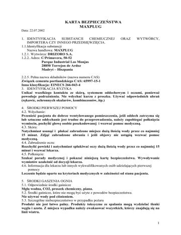 KARTA BEZPIECZEŃSTWA MAXPLUG Data: 22.07.2002 1. IDENTYFIKACJA SUBSTANCJI CHEMIUCZNEJ IMPORTERA CZY INNEGO PRZEDSIĘWZIĘCIA. 1.1.Identyfikacja substancji Nazwa handlowa: MAXPLUG 1.2.1. Wytwórca: DRIZORO S.A. 1.2.2. Adres: C/Primavera, 50-52 Parque Industrial Las Monjas 28850 Torrejon de Ardoz Madryt – Hiszpania ORAZ WYTWÓRCY, 2.2.5. Pełna nazwa składników (nazwa numeru CAS) Związek cementu portlandzkiego CAS: 65997-15-1 Inna klasyfikacja: EINECS 266-043-4 3. IDENTYFIKACJA RYZYKA Unikać wszelkiego kontaktu ze skórą, systemem oddechowym i oczami, poniewaŜ powoduje podraŜnienia. Nie wdychać kurzu z proszku. UŜywać odpowiednich ubrań (rękawic, ochronnych okularów, kombinezonów, itp.) 4. ŚRODKI PIERWSZEJ POMOCY 4.2. Wdychanie: Przenieść pacjenta do dobrze wentylowanego pomieszczenia, jeśli oddech zatrzyma się lub sztuczne oddychanie jest trudne do przeprowadzenia, naleŜy zapobiegać połknięcia wymiocin, pochylić głowę osobie poszkodowanej i wezwać pomoc medyczną. 4.3. Skóra: Natychmiast usunąć i płukać zabrudzone miejsce duŜą ilością wody przez co najmniej 15 minut. Zdjąć zabrudzone ubrania i jeśli objawy nie ustąpią wezwać pomoc medyczną. 4.4. Zabrudzenie oczu: Rozchylić powieki i natychmiast spłukiwać oczy duŜą ilością wody przez co najmniej 15 minut i wezwać lekarza. 4.5. Połknięcie: Szukać porady medycznej i pokazać niniejszą kartę bezpieczeństwa. Wywoływanie wymiotów uzaleŜnić od decyzji lekarza. 4.6. Informacja dla lekarza lub innych wykwalifikowanych osób udzielających pierwszej pomocy Leczenie będzie oparte na kryteriach medycznych w zaleŜności od stanu pacjenta. 5. ŚRODKI GASZENIA OGNIA 5.1. Odpowiednie środki gaśnicze Mgła wodna, CO2, proszek chemiczny, piana. 5.2. Środki gaśnicze, które nie mogą być uŜyte z powodów bezpieczeństwa. Nie uŜywać wody pod ciśnieniem. 5.3. Szczególne niebezpieczeństwo w przypadku poŜaru Produkt nie jest łatwo palny. Produkty toksyczne ze spalania mogą wydzielać tlenki węgla i azotu. Z miejsca wypadku naleŜy ewakuować wszystkich, którzy znajdują się na linii wiatru. 1 KARTA BEZPIECZEŃSTWA MAXPLUG 5.4. Specjalny przeciwpoŜarowy sprzęt ochronny Jak zwykle w takich sytuacjach: nosić przeciwpoŜarowe kombinezony oraz niezaleŜny sprzęt do oddychania. 5.5. Inne instrukcje Ciecze stosowane do gaszenia ognia naleŜy trzymać w celu późniejszego usunięcia. 6. ŚRODKI OSTROśNOŚCI 6.1. Indywidualne środki ostroŜności Unikać rozproszenia się proszku. Nie palić. Próbować zapewnić odpowiednią wentylację. Nie wdychać kurzu z proszku i unikać kontaktu z oczami i ze skórą. Nosić ubranie ochronne, rękawice, buty oraz ochronę na oczy (okulary z bocznymi wkładkami). UŜywać maski przeciwpyłowej. 6.2. Środki ostroŜności względem środowiska Zapobiegać przedostaniu się produktu do ziemi, kanalizacji, czy do jakichkolwiek wód. 6.3. Metody czyszczenia Produkt usuwać z budowy po rozlaniu (ryzyko rozpylenia proszku). Nie uŜywać wody. Zbierać za pomocą urządzeń mechanicznych. Usuwać zgodnie z obowiązującym prawem. 7. PRZENOSZENIE I PRZECHOWYWANIE 7.1. Przenoszenie Nie wdychać. Nosić odpowiednie ubranie i uŜywać maski przeciw pyłowej. Pamiętać o obowiązującym prawie. 7.2. Przechowywanie Opakowania przechowywać szczelnie zamknięte w suchym i dobrze wentylowanym pomieszczeniu. Chronić przed wilgocią. 8. KONTROLA PRACY/OCHRONA OSOBISTA 8.2.1. Wartości HTP Krzemionka kwarcowa TLV - TWA: 0.1 mg / m3 Cement portlandzki TLV-TWA: 10 mg / m3 8.3.1. Specjalne instrukcje dotyczące ochrony i higieny Zapewnić dobrą wentylację w miejscu przechowywania, przenoszenia i stosowania. 8.3.2. Ochrona układu oddechowego Maska przeciw pyłowa. 8.3.3. Ochrona rąk UŜywać rękawic wodoodpornych. 8.3.4. Ochrona oczu Gogle z bocznymi osłonami. 8.3.5. Ochrona skóry Nosić wodoodporne ochronne ubranie i wysokie buty. 9. WŁŚCIWOŚCI FIZYCZNE I CHEMICZNE 9.1. Stan fizyczny, kolor i zapach Bezwonny proszek. 9.2. pH: 11 - 13,5. 9.3.2. Punkt wrzenia/zakres wrzenia: > 10000C 9.4. Temperatura zapłonu: Niepalny 2 KARTA BEZPIECZEŃSTWA MAXPLUG 10. STABILNOŚĆ I ODDZAIŁYWANIE 10.1. Warunki, których naleŜy unikać Nie są znane niebezpieczne reakcje podczas składowania i przenoszenia zgodnie z powszechnymi praktykami stosowanymi w przemyśle. Chronić przed wilgocią. 10.2. Materiały, których naleŜy unikać N.A. 10.3. Niebezpieczne produkty rozkładu Produkt wchodzi w reakcję z wodą, przyspiesza stabilne nawodnienie. 11. INFORMACJA TOKSYKOLOGICZNA 11.1. Ostra toksyczność Unikać wdychania proszku. 11.2. PodraŜnienia W przypadku kontaktu ze skórą, oczami czy systemem oddechowym moŜe powodować podraŜnienia. 11.3. Uczulenia Małe prawdopodobieństwo 11.4. Ostra, chroniczna i przedłuŜona toksyczność N.A. 12. INFORMACJA EKOLOGICZNA 12.1.1. Biodegradacja Produkt nie ulega biodegradacji. 12.1.2. Chemiczna degradacja Produkt ten rozkładany jest pod wpływem CO2. 12.2. Bioakumulacja Nie ulega bioakumulacji. 12.3. Zmienność Produkt jest stabilny. 12.4.1. Toksyczność w stosunku do wody Zapobiegać przedostaniu się produktu do kanalizacji. 13. USUWANIE PRODUKTU Usuwać zgodnie z obowiązującym mechanicznych. prawem. Zbierać za pomocą urządzeń 14. INFORMACJE DOTYCZĄCE TRANSPORTU Produkt nie jest sklasyfikowany jako niebezpieczny. 15. INFORMACJE O PRZEPISACH 15.1.1. Kod literowy symbolu ostrzegawczego oraz wskazówki przygotowawcze w przypadku niebezpieczeństwa : Naklejka nie jest wymagana 15.1.4. WyraŜenia S S22 Nie wdychać S7/8 Trzymać opakowanie dobrze zamknięte. Przechowywać w suchym miejscu. S36/37/39 Nosić odpowiednie ubrania i rękawice ochronne. 3 KARTA BEZPIECZEŃSTWA MAXPLUG 16. INNE INFORMACJE 16.3. Inne informacje: Produkt ten musi być przechowywany, przenoszony i uŜywany zgodnie z zasadami higieny pracy zgodnie z obowiązującym prawem. Informacje przedstawione w tej karcie bezpieczeństwa opierają się na