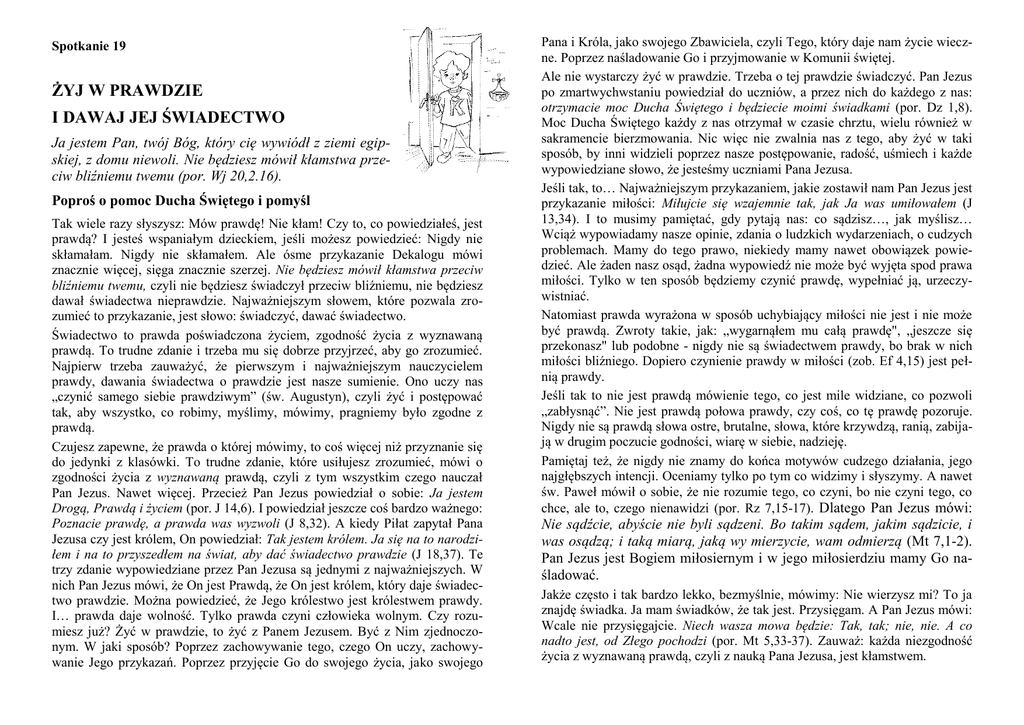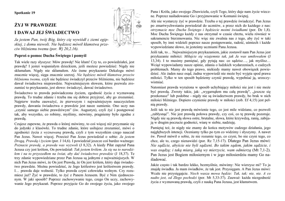 Spotkanie 19 ŻYJ W PRAWDZIE I DAWAJ JEJ ŚWIADECTWO Ja jestem Pan, twój Bóg, który cię wywiódł z ziemi egipskiej, z domu niewoli. Nie będziesz mówił kłamstwa przeciw bliźniemu twemu (por. Wj 20,2.16). Poproś o pomoc Ducha Świętego i pomyśl Tak wiele razy słyszysz: Mów prawdę! Nie kłam! Czy to, co powiedziałeś, jest prawdą? I jesteś wspaniałym dzieckiem, jeśli możesz powiedzieć: Nigdy nie skłamałam. Nigdy nie skłamałem. Ale ósme przykazanie Dekalogu mówi znacznie więcej, sięga znacznie szerzej. Nie będziesz mówił kłamstwa przeciw bliźniemu twemu, czyli nie będziesz świadczył przeciw bliźniemu, nie będziesz dawał świadectwa nieprawdzie. Najważniejszym słowem, które pozwala zrozumieć to przykazanie, jest słowo: świadczyć, dawać świadectwo. Świadectwo to prawda poświadczona życiem, zgodność życia z wyznawaną prawdą. To trudne zdanie i trzeba mu się dobrze przyjrzeć, aby go zrozumieć. Najpierw trzeba zauważyć, że pierwszym i najważniejszym nauczycielem prawdy, dawania świadectwa o prawdzie jest nasze sumienie. Ono uczy nas „czynić samego siebie prawdziwym” (św. Augustyn), czyli żyć i postępować tak, aby wszystko, co robimy, myślimy, mówimy, pragniemy było zgodne z prawdą. Czujesz zapewne, że prawda o której mówimy, to coś więcej niż przyznanie się do jedynki z klasówki. To trudne zdanie, które usiłujesz zrozumieć, mówi o zgodności życia z wyznawaną prawdą, czyli z tym wszystkim czego nauczał Pan Jezus. Nawet więcej. Przecież Pan Jezus powiedział o sobie: Ja jestem Drogą, Prawdą i życiem (por. J 14,6). I powiedział jeszcze coś bardzo ważnego: Poznacie prawdę, a prawda was wyzwoli (J 8,32). A kiedy Piłat zapytał Pana Jezusa czy jest królem, On powiedział: Tak jestem królem. Ja się na to narodziłem i na to przyszedłem na świat, aby dać świadectwo prawdzie (J 18,37). Te trzy zdanie wypowiedziane przez Pan Jezusa są jednymi z najważniejszych. W nich Pan Jezus mówi, że On jest Prawdą, że On jest królem, który daje świadectwo prawdzie. Można powiedzieć, że Jego królestwo jest królestwem prawdy. I… prawda daje wolność. Tylko prawda czyni człowieka wolnym. Czy rozumiesz już? Żyć w prawdzie, to żyć z Panem Jezusem. Być z Nim zjednoczonym. W jaki sposób? Poprzez zachowywanie tego, czego On uczy, zachowywanie Jego przykazań. Poprzez przyjęcie Go do swojego życia, jako swojego Pana i Króla, jako swojego Zbawiciela, czyli Tego, który daje nam życie wieczne. Poprzez naśladowanie Go i przyjmowanie w Komunii świętej. Ale nie wystarczy żyć w prawdzie. Trzeba o tej prawdzie świadczyć. Pan Jezus po zmartwychwstaniu powiedział do uczniów, a przez nich do każdego z nas: otrzymacie moc Ducha Świętego i będziecie moimi świadkami (por. Dz 1,8). Moc Ducha Świętego każdy z nas otrzymał w czasie chrztu, wielu również w sakramencie bierzmowania. Nic więc nie zwalnia nas z tego, aby żyć w taki sposób, by inni widzieli poprzez nasze postępowanie, radość, uśmiech i każde wypowiedziane słowo, że jesteśmy uczniami Pana Jezusa. Jeśli tak, to… Najważniejszym przykazaniem, jakie zostawił nam Pan Jezus jest przykazanie miłości: Miłujcie się wzajemnie tak, jak Ja was umiłowałem (J 13,34). I to musimy pamiętać, gdy pytają nas: co sądzisz…, jak myślisz… Wciąż wypowiadamy nasze opinie, zdania o ludzkich wydarzeniach, o cudzych problemach. Mamy do tego prawo, niekiedy mamy nawet obowiązek powiedzieć. Ale żaden nasz osąd, żadna wypowiedź nie może być wyjęta spod prawa miłości. Tylko w ten sposób będziemy czynić prawdę, wypełniać ją, urzeczywistniać. Natomiast prawda wyrażona w sposób uchybiający miłości nie jest i nie może być prawdą. Zwroty takie, jak: „wygarnąłem mu całą prawdę", „jeszcze się przekonasz" lub podobne - nigdy nie są świadectwem prawdy, bo brak w nich miłości bliźniego. Dopiero czynienie prawdy w miłości (zob. Ef 4,15) jest pełnią prawdy. Jeśli tak to nie jest prawdą mówienie tego, co jest mile widziane, co pozwoli „zabłysnąć”. Nie jest prawdą połowa prawdy, czy coś, co tę prawdę pozoruje. Nigdy nie są prawdą słowa ostre, brutalne, słowa, które krzywdzą, ranią, zabijają w drugim poczucie godności, wiarę w siebie, nadzieję. Pamiętaj też, że nigdy nie znamy do końca motywów cudzego działania, jego najgłębszych intencji. Oceniamy tylko po tym co widzimy i słyszymy. A nawet św. Paweł mówił o sobie, że nie rozumie tego, co czyni, bo nie czyni tego, co chce, ale to, czego nienawidzi (por. Rz 7,15-17). Dlatego Pan Jezus mówi: Nie sądźcie, abyście nie byli sądzeni. Bo takim sądem, jakim sądzicie, i was osądzą; i taką miarą, jaką wy mierzycie, wam odmierzą (Mt 7,1-2). Pan Jezus jest Bogiem miłosiernym i w jego miłosierdziu mamy Go naśladować. Jakże często i tak bardzo lekko, bezmyślnie, mówimy: Nie wierzysz mi? To ja znajdę świadka. Ja mam świadków, że tak jest. Przysięgam. A Pan Jezus mówi: Wcale nie przysięgajcie. Niech wasza mowa będzie: Tak, tak; nie, nie. A co nadto jest, od Złego pochodzi (por. Mt 5,33-37). Zauważ: każda niezgodność życia z wyznawaną prawdą, czyli z nauką Pana Jezusa, jest kłamstwem. I jeszcze jedno. Nie da się żyć prawdą, dawać świadectwo prawdzie, jeśli nie poznajemy prawdy, nie poznajemy Pan Jezusa i nie jednoczymy się z Nim na modlitwie. Czy życie w prawdzie i dawanie jej świadectwa jest łatwe? Wiesz już, że nie. Dlatego potrzebujesz pomocy. Najpierw Pana Jezusa, który czeka na Ciebie w sakramencie pokuty. A później tych, którzy swoim życiem dali jej świadectwo w sposób doskonały, czyli świętych. W tym spotkaniu proponuję, abyś zaprzyjaźnił się z tymi, którzy bronili prawdy, aż do oddania życia: z ks. Jerzym Popiełuszką i z chorwackim kapłanem, ks. Miroslavem Bulešićem. Ks. Jerzego doskonale pamiętają Twoi dziadkowie, może nawet rodz