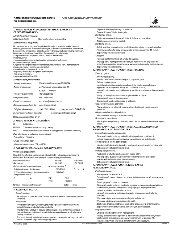 Klej epoksydowy uniwersalny Karta charakterystyki preparatu niebezpiecznego. Zapewnić dostęp świeŜego powietrza. Zapewnić spokój i ciepłe okrycie. Kontakt ze skórą. 1. IDENTYFIKACJA PREPARATU. IDENTYFIKACJA PRZEDSIĘBIORSTWA. Identyfikacja preparatu. Nazwa produktu: Zanieczyszczoną skórę zmyć duŜą ilością wody z mydłem. Zdjąć zanieczyszczoną odzieŜ. Kontakt z okiem. Klej epoksydowy uniwersalny Zastosowanie preparatu. Do łączenia ze sobą i w róŜnych kombinacjach: metalu, szkła, ceramiki, drewna, porcelany, minerałów skalnych, kamieni szlachetnych, elementów betonowych, styropianu, azbestu, gumy i tworzyw sztucznych (np. laminaty, tworzywa poliestrowe, bakelity). Szczególnie przydatny do: - klejenia reklam, napisów, blend i innych elementów dekoracyjnych, - trwałego zabezpieczania układów elektronicznych przed wpływami zewnętrznymi. Klejenie naleŜy prowadzić w temperaturze powyŜej +5°C (temperatura otoczenia, kleju i klejonego elementu). -przyklejania uchwytów do szyb, -naprawy armatury i urządzeń sanitarnych, -naprawy mebli itp., -naprawy biŜuterii i ozdób, Identyfikacja producenta: Nazwa producenta: Wytwórnia Chemiczna DRAGON Adres producenta: ul. Powstania Listopadowego 14 30-298 Kraków Telefony producenta: +48126238080 Fax producenta: +48126377930 E-mail producenta: [email protected] Strona www producenta: www.dragon.biz.pl Telefon alarmowy: +48126238080 E-mail osoby odpow. za kartę: czynny w godz. 7.00-15.00 [email protected] 2. IDENTYFIKACJA ZAGROśEŃ. R36/38 Działa draŜniąco na oczy i skórę R43 MoŜe powodować uczulenie w następstwie kontaktu ze skórą. Klasa temperaturowa: T1 (>450C) Nie dopuścić do skaŜenia gleby, wód gruntowych i powierzchniowych. Zabezpieczyć studzienki ściekowe. Metody oczyszczania. 3. SKŁAD/INFORMACJA O SKŁADNIKACH. Wyrób jest preparatem. Składnik A - śywica epoksydowa. Składnik B - Utwardzacz aminowy z dodatkiem środków tiksotropowych i poprawiających adhezję. Nr WE Nr CAS Nazwa substancji Synonimy StęŜenie (% wag.) Numery zwrotów R 3,6-diazoktano-1,8-diamina 203-950-6 N,N'-bis(2-aminoetylo)etylenodiamina trietylenotetramina 112-24-3 nie zarejestrowana/y R21 R43 8 - 10 Pozbierać produkt z zachowaniem zasad BHP. W przypadku duŜego wycieku miejsce gromadzenia się cieczy obwałować, zebraną ciecz odpompować. Zabezpieczyć studzienki ściekowe. 7. POSTĘPOWANIE Z PREPARATEM I JEGO MAGAZYNOWANIE. Posługiwanie się. R34 R52/53 data: brak 4. PIERWSZA POMOC. Zasady ogólne. W kaŜdym przypadku natychmiast zapewnić poszkodowanemu pomoc lekarską. Wdychanie. Poszkodowanego wynieść/wyprowadzić poza obszar naraŜenia na produkt/opary produktu/mgły produktu. Przytomnego ułoŜyć w pozycji półsiedzącej, nieprzytomnego ułozyć w pozycji bocznej ustalonej, oczyścić jamę ustną i nos z wydzielin oraz usunąć ciała obce. Ryzyko inhalacji isnieje tylko w przypadku utworzenia się mgły produktu lub teŜ w wyniku jego znacznego ogrzania. 4 kwietnia 2008 Piany odporne na alkohol, mgła wodna, dwutlenek węgla, proszki gaśnicze. Nieodpowiednie środki gaśnicze. Stosować środki ochrony indywidualnej zgodnie z punktem 8. Unikać bezpośredniego kontaktu z uwalniającą się substancją. Środowiskowe środki ostroŜności. Grupa wybuchowości: Nr rej.: Produkt jest palny. Nie dopuścić do rozlewania się wód pogaśniczych. Odciąć dopływ gazu. Udział w akcji ratowniczej mogą brać tylko osoby przeszkolone, wyposaŜone w odpowiedni sprzęt i odzieŜ ochronną. Usunąć z otoczenia wszystkie osoby nie biorące udziału w likwidowaniu awarii. Wyłączyć urządzenia zasilane prądem elektrycznym. Zawiadomić otoczenie o poŜarze. Zawiadomić słuŜby ratownicze o poŜarze. Odpowiednie środki gaśnicze. Indywidualne środki ostroŜności. Typ poŜaru: Niepalny Xn Zasady ogólne. 6. POSTĘPOWANIE W PRZYPADKU NIEZAMIERZONEGO UWOLNIENIA DO ŚRODOWISKA. ZagroŜenia nie wynikające z klasyfikacji: C 5. POSTĘPOWANIE W PRZYPADKU POśARU. Niebezpieczne produkty rozkładu: tlenki azotu, tlenek i dwutlenek węgla, sadza. DraŜniący. Kategorie niebezpieczeństwa Podać 2 szklanki mleka lub wody do wypicia. W przypadku wystąpienia samoistnych wymiotów nie dopuścić do przenikania produktu zawartego w wymiocinach do dróg oddechowych. Zapewnić pomoc lekarską. Nie stosować zwartych strumieni wody. Szczególne zagroŜenia. Data aktualizacji:2008-04-04 Xi JeŜeli moŜliwe usunąć szkła kontaktowe (jeŜeli nie przywarły do oka). Przemywać otwarte oczy czystą wodą przez co najmniej 15 minut. Zapewnić pomoc okulistyczną. SpoŜycie. Nie wylewać do kanalizacji. Przestrzegać zasad higieny, po pracy, kaŜdorazowo umyć ręce wodą z mydłem. Przetrzymywać z dala od Ŝywności. Stosować środki ochrony osobistej zgodnie z zaleceniami na etykiecie opakowania jednostkowego oraz znajdującymi się w punkcie 8. Unikać kontaktu ze skóra lub oczami. UŜywać pojemników, połączeń i sprzętu odpornego na działanie produktu. W czasie uŜytkowania produktu nie jeść ani nie pić. W czasie uŜytkowania produktu nie palić. Zachować środki ostroŜności niezbedne przy pracy z chemikaliami. Zapewnić dobre wentylowanie zamkniętych pomieszczeń. Magazynowanie. Chronić przed nadmiernym nagrzaniem. NaleŜy przechowywać zgodnie z zaleceniami podanymi na etykiecie opakowania jednostkowego oraz wymienionymi w punkcie 15. Nie przechowywać wspólnie z materiałami utleniającymi. MSDS/XT/2008-04-04/PL Strona 1 Klej epoksydowy uniwersalny Karta charakterystyki preparatu niebezpiecznego. śywica (przed stosowanie): unikać kontaktu z utwardzaczmi zywic epoksydowych. Przechowywać tylko w oryginalnych opakowaniach producenta. Przechowywać w chłodnych miejscach. Przechowywać w temperaturze powyŜej 0 C. 11. INFORMACJE TOKSYKOLOGICZNE. 8. KONTROLA NARAśENIA I ŚRODKI OCHRONY INDYWIDUALNEJ. Informacje ogólne. W warunkach normalnych produkt nie stwarza zagroŜenia. Drogi wnikania do organi