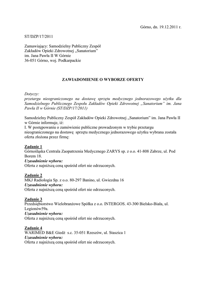 Górno, dn. 19.12.2011 r. ST/DZP/17/2011 Zamawiający: Samodzielny Publiczny Zespół Zakładów Opieki Zdrowotnej „Sanatorium” im. Jana Pawła II W Górnie 36-051 Górno, woj. Podkarpackie ZAWIADOMIENIE O WYBORZE OFERTY Dotyczy: przetargu nieograniczonego na dostawę sprzętu medycznego jednorazowego uŜytku dla Samodzielnego Publicznego Zespołu Zakładów Opieki Zdrowotnej „Sanatorium” im. Jana Pawła II w Górnie (ST/DZP/17/2011) Samodzielny Publiczny Zespół Zakładów Opieki Zdrowotnej „Sanatorium” im. Jana Pawła II w Górnie informuje, iŜ: I. W postępowaniu o zamówienie publiczne prowadzonym w trybie przetargu nieograniczonego na dostawę sprzętu medycznego jednorazowego uŜytku wybrana została oferta złoŜona przez firmę: Zadanie 1 Górnośląska Centrala Zaopatrzenia Medycznego ZARYS sp. z o.o. 41-808 Zabrze, ul. Pod Borem 18. Uzasadnienie wyboru: Oferta z najniŜszą ceną spośród ofert nie odrzuconych. Zadanie 2 MKJ Radiologia Sp. z o.o. 80-297 Banino, ul. Gwiezdna 16 Uzasadnienie wyboru: Oferta z najniŜszą ceną spośród ofert nie odrzuconych. Zadanie 3 Przedsiębiorstwo WielobranŜowe Spółka z o.o. INTERGOS. 43-300 Bielsko-Biała, ul. Legionów59a. Uzasadnienie wyboru: Oferta z najniŜszą ceną spośród ofert nie odrzuconych. Zadanie 4 WARIMED B&E GiedŜ s.c. 35-051 Rzeszów, ul. Staszica 1 Uzasadnienie wyboru: Oferta z najniŜszą ceną spośród ofert nie odrzuconych. Zgodnie z art. 92. ust 1 pkt 1 ustawy Prawo zamówień publicznych zamawiający podaje nazwy i adresy wykonawców, którzy złoŜyli oferty wraz ze streszczeniem oceny i porównania złoŜonych ofert zawierającą punktację przyznaną ofertom w kryterium - cena. ZADANIE 1 – Sprzęt medyczny jednorazowego uŜytku Numer Firma (nazwa) lub nazwisko oraz Liczba punktów w adres wykonawcy kryterium CENA Oferty Przedsiębiorstwo Handlowe 9 „MEDRES” Zbigniew Majcher. 35-205 Rzeszów, ul. Torowa 3 Górnośląska Centrala Zaopatrzenia 11 Medycznego ZARYS sp. z o.o. 41-808 100 Zabrze, ul. Pod Borem 18 ZADANIE 2 – Sprzęt medyczny do pracowni RTG Firma (nazwa) lub nazwisko oraz Liczba punktów w Numer Oferty adres wykonawcy kryterium CENA Przedsiębiorstwo Handlowe 9 „MEDRES” Zbigniew Majcher. 35-205 Rzeszów, ul. Torowa 3 Górnośląska Centrala Zaopatrzenia 11 Medycznego ZARYS sp. z o.o. 41-808 89,16 Zabrze, ul. Pod Borem 18 5 SKAMEX sp. z o.o.93-121 ŁódŜ, ul. Częstochowska 38/52 7 MKJ Radiologia Sp. z o.o. 80-297 Banino, ul. Gwiezdna 16 Łączna punktacja - 100 Łączna punktacja - 89,16 69,67 69,67 100 100 ZADANIE 3 – Rękawice jednorazowego uŜytku Numer Firma (nazwa) lub nazwisko oraz Liczba punktów w Oferty adres wykonawcy kryterium CENA Przedsiębiorstwo Handlowe 9 „MEDRES” Zbigniew Majcher. 35-205 Rzeszów, ul. Torowa 3 Górnośląska Centrala Zaopatrzenia 11 Medycznego ZARYS sp. z o.o. 41-808 89,37 Zabrze, ul. Pod Borem 18 Łączna punktacja - 89,37 1 SORIMEX sp. z o.o. 87-100 Toruń, ul. Równinna 25 98,26 98,26 2 CENTRUM ZAOPATRZENIA MEDYCZNEGO „CEZAL” S.A. 50543 Wrocław, Oddział w Krakowie, 30-149 Kraków, ul. Balicka 117. 99,76 99,76 3 TZMO S.A. 87-100 Toruń, ul. śółkiewskiego 20/26. 97,14 97,14 4 MERKATOR Medical S.A. 31-327 Kraków, ul. H. Modrzewiowej 30. 96,42 96,42 100 100 98,59 98,59 87,96 87,96 Liczba punktów w kryterium CENA Łączna punktacja 100 100 6 8 10 Przedsiębiorstwo WielobranŜowe Spółka z o.o. INTERGOS. 43-300 Bielsko-Biała, ul. Legionów59a. HAND-PROD Sp. z o.o. 02-496 Warszawa, ul. Stanisława Leszczyńskiego 40A. F.H.SYMED.W. Kocój. 36-020 Tyczyn, ul. Ogrodowa 6. ZADANIE 4 – Drobny sprzęt laboratoryjny Numer Firma (nazwa) lub nazwisko oraz Oferty adres wykonawcy 12 WARIMED B&E GiedŜ s.c. 35-051 Rzeszów, ul. Staszica 1