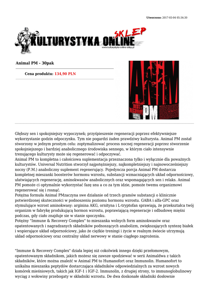 Utworzono: 2017-03-04 05:34:30 Animal PM - 30pak Cena produktu: 134,90 PLN Głębszy sen i spokojniejszy wypoczynek; przyśpieszenie regeneracji poprzez efektywniejsze wykorzystanie godzin odpoczynku. Tym nie pogardzi żaden prawdziwy kulturysta. Animal PM został stworzony w jednym prostym celu: zoptymalizować process nocnej regeneracji poprzez stworzenie spokojniejszego i bardziej anabolicznego środowiska sennego, w którym ciało intensywnie trenującego kulturysty może się regenerować i odpoczywać. Animal PM to kompletna i całościowa suplementacja przeznaczona tylko i wyłącznie dla poważnych kulturystów. Universal Nutrition stworzył najpotężniejszy, najkompletniejszy i najnowocześniejszy nocny (P.M.) anaboliczny suplement regenerujący. Pojedyncza porcja Animal PM dostarcza kompletnej mieszanki boosterów hormonu wzrostu, substancji wzmacniających układ odpornościowy, ułatwiających regenerację, aminokwasów anabolicznych oraz wspomagających sen i relaks. Animal PM pomoże ci optymalnie wykorzystać fazę snu a co za tym idzie, pomoże twemu organizmowi regenerować się i rosnąć. Potężna formuła Animal PMzaczyna swe działanie od trzech gramów substancji o klinicznie potwierdzonej skuteczności w podnoszeniu poziomu hormonu wzrostu. GABA i alfa-GPC oraz stymulujące wzrost aminokwasy: arginina AKG, ornityna i L-tryptofan sprawiają, że przekształca twój organizm w fabrykę produkującą hormon wzrostu, poprawiającą regeneracje i odbudowę mięśni podczas, gdy ciało znajduje sie w stanie spoczynku. Potężny "Immune & Recovery Complex" to mieszanka wolnych form aminokwasów oraz opatentowanych i nagradzanych składników podnoszących anabolizm, zwiększających syntezę białek i wspierające układ odpornościowy, jako że ciężkie treningi i życie w realnym świecie utrzymują układ odpornościowy oraz centralny układ nerwowy w stanie ciągłego zagrożenia. "Immune & Recovery Complex" działa lepiej niż cokolwiek innego dzięki przełomowym, opatentowanym składnikom, jakich możesz się zawsze spodziewać w serii Animaldwa z takich składników, które można znaleźć w Animal PM to Humanofort oraz Immunolin. Humanofort to unikalna mieszanka peptydów dostarczająca składników odpowiedzialnych za wzrost nowych komórek mieśniowych, takich jak IGF-1 i IGF-2. Immunolin, z drugiej strony, to immunoglobulinowy wyciąg z wołowiny przebogaty w składniki wzrostu. De dwa doskonałe składniki dosłownie doładowują skład Animal PM. W końcu, aby połączyć to wszystko razem i odróżnić się od innych produktów poprawiających jakość snu i regeneracji dostępnych na rynku, Animal PM zawiera „Sleep & Relaxation Complex". Jest to kompleks zaprojektowany do wspomagania usypiania i osiągnięcia głębokiego snu, podczas gdy czynniki wzrostu zawarte w wyżej opisanych mieszankach pracują już nad twoja regeneracją. W sposób naturalny, Animal PM ułatwia osiągnięcie stanu zwiększonego relaksu przygotowując cię do zdrowego i regenerującego snu. Animal PM dostarcza także doskonale znanych składników takich jak korzeń waleriany, rumianek i chmiel. te trzy skłądniki wzmocnione są L-dopą (ze świerzbca właściwego) oraz silną L-teaninę. Składniki te wzmocnione są dodatkowo powszechnie stosowaną mieszanka cynku i magnezu. MA to na celu nie tylko wywołanie mocnego, głębokiego snu ale także wzmocnić reakcje anaboliczną organizmu osłabioną ewentualnym brakiem tych pierwiastków. Informacje o suplemencie Wielkość porcji 1 paczka Ilość porcji w opakowaniu 30 Ilość w porcji % dziennego zapotrzebowania* Pirydoksyna (B6) 10.5mg 525% Magnez (jako tlenek) 450mg 113% Cynk (jako tlenek) 30mg 200% GH Boosting Complex: 3,000mg (Kwas γ-aminomasłowy [GABA], Alfaketoglutaran Argininy [AKG], Ornityna HCL, L-Tryptofan, Alpha alfa glicerylfosforylcholina [GPC]) Immune & Recovery Complex: 2,500mg (Mieszanka aminokwasów Animal Nitro(Tm) [Leucyna, Walina, Izoleucyna, Lizyna, Arginina, Histydyna, Treonina, Metionina, Fenylalanina], L Glutamina, Immunolin, Humanofort(Tm)) Sleep & Relaxation Complex: 1,250mg (proszek z korzenia waleriany, proszek z korzenia rumianku, świerzbiec właściwy [standaryzowany do 15% L-Dopa], Chmiel [chmiel zwyczajny], L-Teanina) * Procent Zapotrzebowania Dziennego oparty jest na diecie 2000 kaloriiIngredients Notes: Hummanofort (Tm) to zastrzeżona macierz peptydów embrionicznych zawierająca występujące naturalnie IGF-1, IGF-2, FGF (czynnik wzrostu fibroblastów), NGF (czynnik wzrostu nerwu), EGF (czynnik wzrostu naskórka), CTGF (czynnik wzrostu tkanki łacznej), Immunolin to wyspecjalizowany koncentrat immunoglobulin z krwi wołowej dostarczający czynniki IGF-1, IGF-2, IGM oraz IGA. Inne składniki: Fosforan dwuwapniowy, maltodekstryna, celuloza krystaliczna, żelatyna, kwas stearynowy, dwutlenek krzemu, stearynian magnezu, dwutlenek tytanu, barwnik FD&C Blue 1, lecytyna sojowa, barwnik FD&C Red 3, jajka. Wyprodukowano w zakładzie wykorzystującym mleko, soję, jajka i orzechy. Ten produkt może zawierać śladowe ilości orzechów. Sposób użycia Universal Animal PM: Weź pojedynczą paczkę 30-45 zaśnięciem. Najlepsze rezultaty osiągniesz przyjmując paczkę na pusty żołądek. Jeśli pijesz wieczorem szejka białkowego, Animal PM spożyj min. 30 minut później, tak aby umożliwić trawiennie. Animal PM może być łączony z dowolnymi suplementami z linii Animal, w tym suplementami podstawowymi, takimi jak Pak, Flex and Omega oraz cyklicznymi jak Stak czy Test. Ilość Adres: http://www.ko.sklep.pl/ - Telefon: kom. 782 010 880 Email: [email protected]