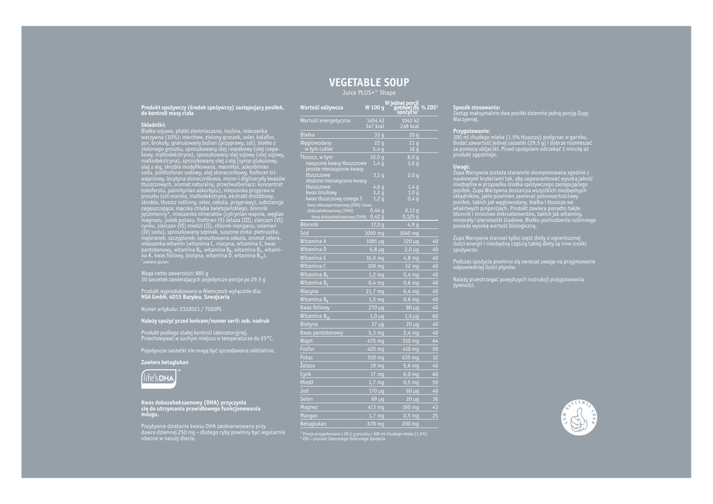 VEGETABLE SOUP Juice PLUS+® Shape Produkt spożywczy (środek spożywczy) zastępujący posiłek, do kontroli masy ciała Składniki: Białko sojowe, płatki ziemniaczane, inulina, mieszanka warzywna (10%): marchew, zielony groszek, seler, kalafior, por, brokuły, granulowany bulion (przyprawy, sól), białko z zielonego groszku, sproszkowany olej rzepakowy (olej rzepakowy, maltodekstryna), sproszkowany olej sojowy (olej sojowy, maltodekstryna), sproszkowany olej z alg (syrop glukozowy, olej z alg, skrobia modyfikowana, mannitol, askorbinian sodu, polifosforan sodowy, olej słonecznikowy, fosforan triwapniowy, lecytyna słonecznikowa, mono-i diglicerydy kwasów tłuszczowych, aromat naturalny, przeciwutleniacz: koncentrat tokoferolu, palmitynian askorbylu), mieszanka przypraw w proszku (sól morska, maltodekstryna, ekstrakt drożdżowy, skrobia, tłuszcz roślinny, seler, cebula, przyprawy), substancja zagęszczająca: mączka chleba świętojańskiego, błonnik jęczmienny*, mieszanka minerałów (cytrynian wapnia, węglan magnezu, jodek potasu, fosforan (V) żelaza (III), siarczan (VI) cynku, siarczan (VI) miedzi (II), chlorek manganu, selenian (IV) sodu), sproszkowany szpinak, suszone zioła: pietruszka, majeranek, szczypiorek; sproszkowana cebula, aromat selera, mieszanka witamin (witamina C, niacyna, witamina E, kwas pantotenowy, witamina B2, witamina B6, witamina B1, witamina A, kwas foliowy, biotyna, witamina D, witamina B12). * zawiera gluten Waga netto zawartości: 885 g 30 saszetek zawierających pojedyncze porcje po 29,5 g Produkt wyprodukowano w Niemczech wyłącznie dla: NSA GmbH, 4015 Bazylea, Szwajcaria Numer artykułu: 2332021 / 7020PL Należy spożyć przed końcem/numer serii: zob. nadruk Produkt podlega stałej kontroli laboratoryjnej. Przechowywać w suchym miejscu w temperaturze do 25°C. Pojedyncze saszetki nie mogą być sprzedawane oddzielnie. Zawiera betaglukan Kwas dokozaheksaenowy (DHA) przyczynia się do utrzymania prawidłowego funkcjonowania mózgu. Pozytywne działanie kwasu DHA zaobserwowano przy dawce dziennej 250 mg – dlatego ryby powinny być regularnie obecne w naszej diecie. W jednej porcji gotowej do1 % ZDS2 spożycia Wartość energetyczna 1454 kJ 1042 kJ 347 kcal 248 kcal Białka 33 g 20 g Węglowodany 22 g 21 g w tym cukier 5,4 g 16 g Tłuszcz, w tym 10,0 g 8,0 g nasycone kwasy tłuszczowe 1,4 g 3,6 g proste nienasycone kwasy tłuszczowe 3,1 g 2,0 g złożone nienasycone kwasy tłuszczowe 4,6 g 1,4 g kwas linolowy 3,2 g 1,0 g kwas tłuszczowy omega 3 1,2 g 0,4 g Wartość odżywcza W 100 g kwas eikozapentaenowy (EPA) i kwas 0,44 g dokozaheksaenowy (DHA) kwas dokozaheksaenowy (DHA) 0,42 g Błonnik Sód Witamina A Witamina D Witamina E Witamina C Witamina B1 Witamina B2 Niacyna Witamina B6 Kwas foliowy Witamina B12 Biotyna Kwas pantotenowy Wapń Fosfor Potas Żelazo Cynk Miedź Jod Selen Magnez Mangan Betaglukan 1 2 17,0 g 3050 mg 1085 μg 6,8 μg 16,0 mg 109 mg 1,2 mg 0,4 mg 21,7 mg 1,5 mg 270 μg 1,0 μg 37 μg 5,3 mg 475 mg 420 mg 510 mg 19 mg 17 mg 1,7 mg 170 μg 69 μg 413 mg 1,7 mg 678 mg 0,13 g 0,125 g 4,9 g 1040 mg 320 μg 2,0 μg 4,8 mg 32 mg 0,4 mg 0,6 mg 6,4 mg 0,6 mg 80 μg 1,5 μg 20 μg 2,4 mg 510 mg 410 mg 635 mg 5,6 mg 6,0 mg 0,5 mg 60 μg 20 μg 160 mg 0,5 mg 200 mg Porcja przygotowana z 29,5 g proszku i 300 ml chudego mleka (1,5%) ZDS – procent Zalecanego Dziennego Spożycia 40 40 40 40 40 40 40 40 40 60 40 40 64 59 32 40 60 50 40 36 43 25 Sposób stosowania: Zastąp maksymalnie dwa posiłki dziennie jedną porcję Zupy Warzywnej. Przygotowanie: 300 ml chudego mleka (1,5% tłuszczu) podgrzac w garnku. Dodać zawartość jednej saszetki (29,5 g) i dobrze rozmieszać za pomocą ubijaczki. Przed spożyciem odczekać 1 minutę aż produkt zgęstnieje. Uwagi: Zupa Warzywna została starannie skomponowana zgodnie z naukowymi kryteriami tak, aby zagwarantować wysoką jakość niezbędna w przypadku środka spożywczego zastępującego posiłek. Zupa Warzywna dostarcza wszystkich niezbędnych składników, jakie powinien zawierać pełnowartościowy posiłek, takich jak węglowodany, białka i tłuszcze we właściwych proporcjach. Produkt zawiera ponadto także błonnik i mnóstwo mikroelementów, takich jak witaminy, minerały i pierwiastki śladowe. Białko pochodzenia roślinnego posiada wysoką wartość biologiczną. Zupa Warzywna stanowi tylko część diety o ograniczonej ilości energii i niezbędną częścią takiej diety są inne środki spożywcze. Podczas spożycia powinno się zwracać uwagę na przyjmowanie odpowiedniej ilości płynów. Należy przestrzegać powyższych instrukcji przygotowania żywności.
