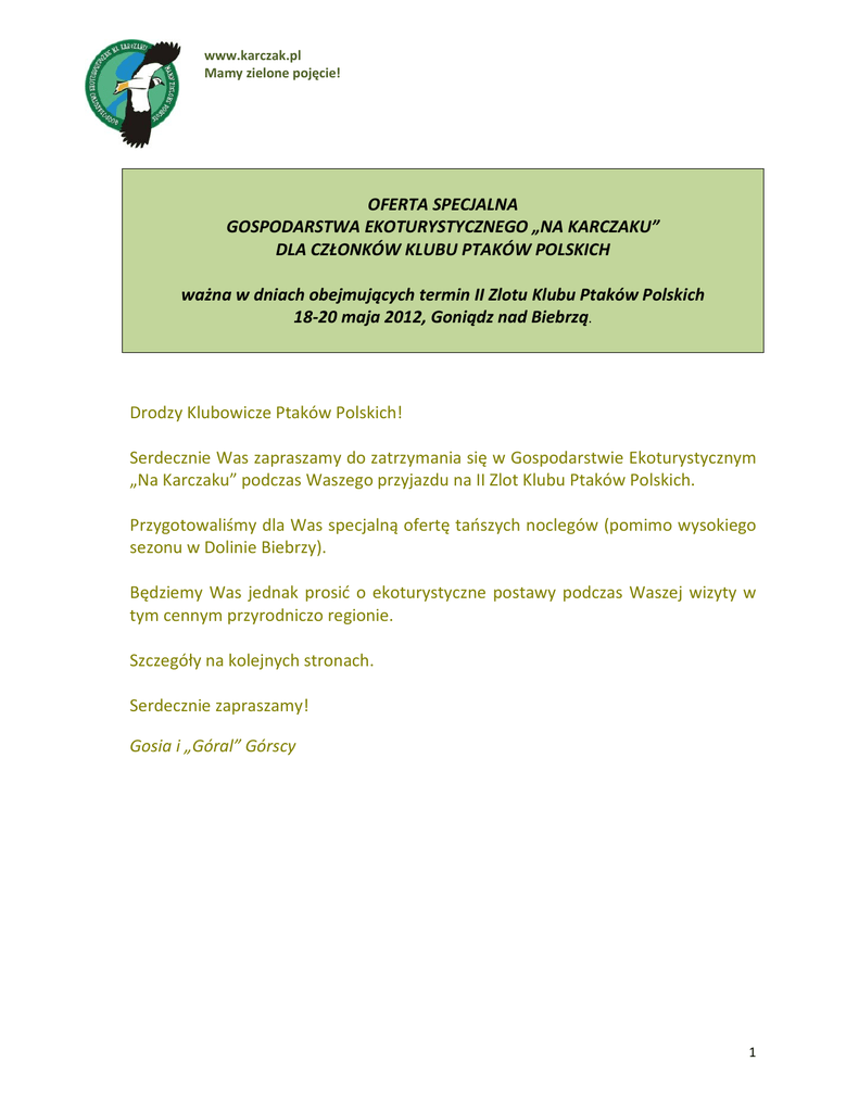 www.karczak.pl Mamy zielone pojęcie! OFERTA SPECJALNA GOSPODARSTWA EKOTURYSTYCZNEGO „NA KARCZAKU” DLA CZŁONKÓW KLUBU PTAKÓW POLSKICH ważna w dniach obejmujących termin II Zlotu Klubu Ptaków Polskich 18-20 maja 2012, Goniądz nad Biebrzą. Drodzy Klubowicze Ptaków Polskich! Serdecznie Was zapraszamy do zatrzymania się w Gospodarstwie Ekoturystycznym „Na Karczaku” podczas Waszego przyjazdu na II Zlot Klubu Ptaków Polskich. Przygotowaliśmy dla Was specjalną ofertę tańszych noclegów (pomimo wysokiego sezonu w Dolinie Biebrzy). Będziemy Was jednak prosić o ekoturystyczne postawy podczas Waszej wizyty w tym cennym przyrodniczo regionie. Szczegóły na kolejnych stronach. Serdecznie zapraszamy! Gosia i „Góral” Górscy 1 www.karczak.pl Mamy zielone pojęcie! Na Karczaku Gospodarstwo ekoturystyczne „Na Karczaku” położone jest na kolonii – czyli w rozproszonej zabudowie – pośród pól na skraju Dolnego Basenu Doliny Biebrzy: 1,5 km od Trzciannego, 4 km od Biebrzańskich Bagien, 20 km od Goniądza. Nasz dom, w którym gościmy ekoturystów zbudowany jest z sosnowych bali przetykanych mchem, a dach pokryty został osikowym wiórem. Ukwiecony przedogródek zdobi najbliższe otoczenie. Wnętrze chaty - pomimo, że niedawno wyremontowane - zostało zachowane w podlaskim, wiejskim stylu. Unikamy tu plastików i niepotrzebnych „luksusów”. Dwie przytulne sypialnie dla gości zostały przygotowane na poddaszu chaty. Jedna ugości 2 osoby (2 pojedyncze łóżka), druga – 5 osób (1 podwójne łóżko i 3 pojedyncze). Łazienka i kuchnia są wspólnie dzielone przez domowników i gości. Nie oferujemy posiłków, lecz udostępniamy wyposażoną kuchnię. Do nieodpłatnej dyspozycji naszych gości są hamaki, bogata biblioteczka przewodników i atlasów, internet (tylko dla nałogowców w ograniczonych ilościach), łąka na harce pod chmurką. Jest możliwość wypożyczenia 5 rowerów i rozpalenia ogniska. Zapraszamy na ekoturystyczny szlak! Jesteśmy świadomi tego, że każda aktywność turystyczna wywiera wpływ na środowisko, więc chcielibyśmy z Waszą pomocą poprzez nasze ekologiczne, świadome zachowania w gospodarstwie agroturystycznym „Na Karczaku”, a także na biebrzańskich szlakach, zmniejszać takie oddziaływania niekorzystne i wzmacniać te pozytywne. Zależy nam, aby nasze gospodarstwo, gdzie przyjmujemy gości, a także nasze aktywności, po pierwsze - nie szkodziły, po drugie - sprzyjały zachowaniu i po trzecie - odtwarzały lub kreowały warunki dla bogatej bioróżnorodności, wysokiej jakości środowiska naturalnego, pielęgnowania tradycji i pozytywnych emocji i relacji międzyludzkich. Chcemy to osiągnąć poprzez wzbudzanie wrażliwości naszych gości na przyrodę – jej piękno i korzyści z niej płynące, promocję ekologicznego stylu życia, dziedzictwa przyrodniczego i kulturowego regionu, zachęcanie do odpowiedzialnych postaw konsumenckich i podejmowania aktywnych działań na rzecz środowiska przyrodniczego i kulturowego oraz życie w zgodzie z własnymi wewnętrznymi przekonaniami. Na początku 2012 r. złożyliśmy wniosek o Polski Certyfikat Ekoturystyczny. Jego weryfikacja opiera się o kryteria dotyczące ochrony środowiska naturalnego, przyrody, dziedzictwa kulturowego. 2 www.karczak.pl Mamy zielone pojęcie! Dlaczego warto zatrzymać się u nas? • • • • • bo całymi i wszystkimi swoimi siłami wspieramy ochronę przyrody, a tę biebrzańską jeszcze bardziej, bo jesteśmy bardzo zaszczyconymi laureatami I miejsca w ogólnopolskim konkursie zorganizowanym przez Ptaki Polskie "Ogród na pTak!", bo wraz z naszymi gośćmi podejmujemy ekoturystyczne wyzwania, bo jesteśmy w trakcie oficjalnej certyfikacji ekoturystycznej i mooooże na Zlot już będziemy mieć certyfikat - jako pierwsza kwatera agroturystyczna w woj. podlaskim, bo tak jak Ptaki Polskie, mamy w logo czajkę ☺. Oferta specjalna dla członków Klubu Ptaków Polskich Gościom II Zlotu Klubu Ptaków Polskich, który odbędzie się w Goniądzu w dniach 18-20 maja 2012 r. proponujemy tańsze niż zwykle noclegi. Cena jest tym korzystniejsza im więcej jest osób w pokoju. Zaproście więc swoich przyjaciół! Nocleg w pokoju 2-osobowym: 1 os. - 50 zł/os./noc 2 os. - 35 zł/os./noc Nocleg w pokoju 5-osobowym: 1 os. - 60 zł/os./noc 2 os. - 50 zł/os./noc 3 os. - 40 zł/os./noc 4 os. - 35 zł.os./noc 5 os. - 30 zł/os./noc Wypożyczenie roweru – 20 zł/doba Ognisko – 40 zł Powyższe ceny specjalne obowiązują w trakcie całego pobytu obejmującego przyjazd na Zlot (1820 maja). Można więc przyjechać wcześniej i zostać dłużej, by dodatkowo samodzielnie poznawać Biebrzańskie Bagna. Warunki rezerwacji na specjalnych warunkach • Członkostwo w Klubie Ptaków Polskich • Akceptacja regulaminu pobytu „Na Karczaku”: www.karczak.pl/regulamin.html, w tym ekoturystycznych zaleceń 3 www.karczak.pl Mamy zielone pojęcie! • Wpłacenie zaliczki w wysokości 50% ceny pobytu. W sprawie rezerwacji prosimy o kontakt telefoniczny lub e-mailowy i podanie hasła „Jestem na pTAK!”: 605 072 963, 605 070 001, [email protected]. Uwaga! Ze względu na fakt, że wszystkie budynki w naszym gospodarstwie są drewniane oraz promujemy zdrowy styl życia, obowiązuje u nas zakaz palenia. Palenie możliwe jest tylko i wyłącznie w wyznaczonych miejscach, w odległości bezpiecznej dla zdrowia, komfortu wypoczynku i bezpieczeństwa innych osób. W razie pytań, prosimy o kontakt: tel.: 605 072 963, 605 070 001 e-mail: [email protected] Więcej informacji: Gospodarstwo Ekoturystyczne „Na Karczaku”: www.karczak.pl II Zlot Klubu Ptaków Polskich, 18-20 maja 2012 r.: www.zlot.ptakipolskie.pl 4