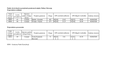 Punkty dystrybucji na przejściach granicznych między Polską i Słowacją Województwo żylińskie Punkt obsługi klienta HDM HDM Operator Liczba punktu obsługi Przejście graniczne porządkowa klienta 87 Cesmad Skalité - Zwardoń 88 Cesmad Trstená - Chyżne Droga 487 E77 GPS szerokość północna 49 30 49 24 23.87 21.27 GPS długość wschodnia 18 57 19 39 30.94 26.49 Godziny otwarcia NONSTOP NONSTOP Województwo preszowskie Punkt obsługi klienta HDM Liczba Operator punktu porządkowa obsługi klienta 89 Cesmad HDM - Graniczny Punkt Dystrybucji Przejście graniczne Vyšný Komárnik Barwinek Droga 73 GPS szerokość północna 49 25 5.01 GPS długość wschodnia 21 41 43.59 Godziny otwarcia NONSTOP