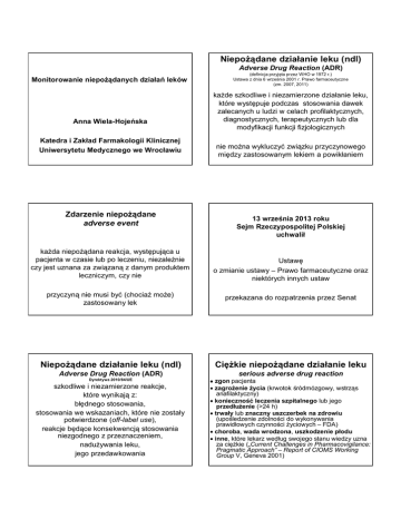 Niepożądane działanie leku (ndl) Adverse Drug Reaction (ADR) Monitorowanie niepożądanych działań leków Anna Wiela-Hojeńska Katedra i Zakład Farmakologii Klinicznej Uniwersytetu Medycznego we Wrocławiu Zdarzenie niepożądane adverse event każda niepożądana reakcja, występująca u pacjenta w czasie lub po leczeniu, niezależnie czy jest uznana za związaną z danym produktem leczniczym, czy nie (definicja przyjęta przez WHO w 1972 r.) Ustawa z dnia 6 września 2001 r. Prawo farmaceutyczne (zm. 2007, 2011) każde szkodliwe i niezamierzone działanie leku, które występuje podczas stosowania dawek zalecanych u ludzi w celach profilaktycznych, diagnostycznych, terapeutycznych lub dla modyfikacji funkcji fizjologicznych nie można wykluczyć związku przyczynowego między zastosowanym lekiem a powikłaniem 13 września 2013 roku Sejm Rzeczypospolitej Polskiej uchwalił Ustawę o zmianie ustawy – Prawo farmaceutyczne oraz niektórych innych ustaw przyczyną nie musi być (chociaż może) zastosowany lek przekazana do rozpatrzenia przez Senat Niepożądane działanie leku (ndl) Ciężkie niepożądane działanie leku Adverse Drug Reaction (ADR) serious adverse drug reaction Dyrektywa 2010/84/UE · zgon pacjenta · zagrożenie życia (krwotok śródmózgowy, wstrząs anafilaktyczny) · konieczność leczenia szpitalnego lub jego przedłużenie (>24 h) · trwały lub znaczny uszczerbek na zdrowiu (upośledzenie zdolności do wykonywania prawidłowych czynności życiowych – FDA) · choroba, wada wrodzona, uszkodzenie płodu · inne, które lekarz według swojego stanu wiedzy uzna za ciężkie („Current Challenges in Pharmacovigilance: Pragmatic Approach” – Report of CIOMS Working Group V, Geneva 2001) szkodliwe i niezamierzone reakcje, które wynikają z: błędnego stosowania, stosowania we wskazaniach, które nie zostały potwierdzone (off-label use), reakcje będące konsekwencją stosowania niezgodnego z przeznaczeniem, nadużywania leku, jego przedawkowania Zgłoszenia ciężkich niepożądanych działań produktów leczniczych dokonuje się nie później niż w terminie 15 dni od uzyskania informacji Niepożądane działania leków typu A Niespodziewane niepożądane działanie leku unexpected adverse reaction każde działanie niepożądane, którego charakter lub stopień nasilenia nie jest zgodny z informacjami zawartymi w: - Charakterystyce Produktu Leczniczego (Summary of Product Characteristics, SPC) - zatwierdzonych drukach informacyjnych dla produktów leczniczych dopuszczonych do obrotu - Broszurze Badacza dla produktów leczniczych nie dopuszczonych do obrotu Niepożądane działania leków typu A (drug actions) reakcje zależne od właściwości farmakologicznych leku, podanej dawki, obserwowane w czasie prowadzenia badań klinicznych, możliwe do przewidzenia - hipotonia po zastosowaniu dużej dawki inhibitora konwertazy angiotensyny - hipoglikemia podczas terapii lekami przeciwcukrzycowymi - ototoksyczność antybiotyków aminoglikozydowych (zwłaszcza: streptomycyny, kanamycyny, neomycyny, amikacyny, gentamycyny, tobramycyny) - uszkodzenie wątroby związane z terapią paracetamolem Niepożądana interakcja leków · Rozbieżność pomiędzy zakładanym a uzyskanym efektem leczenia farmakologicznego · Pierwotne i wtórne powikłania terapii związane z farmakologicznym działaniem leku IKA – przewlekły, męczący, suchy kaszel, uczucie podrażnienia w gardle, zmiana barwy głosu stymulacja przez bradykininę syntezy metabolitów kaskady kwasu arachidonowego, nasilenie syntezy NO; skutkiem działania prostaglandyn i NO jest stan zapalny, wywołujący kaszel · Interakcje – lek – lek – lek – pożywienie – lek – używki – lek – badania laboratoryjne Niepożądane działania leków typu B (bizarre, patient reactions) terapeutycznie niepożądane działanie, które może wystąpić podczas równoczesnego zastosowania u chorego dwu lub więcej leków, polegające na osłabieniu lub nasileniu działania, na pojawieniu się objawów toksycznych, lub jakościowo odmiennego od spodziewanego działania farmakologicznego. reakcje niezależne od zastosowanej dawki leku, zagrażające życiu chorego (reakcje alergiczne i pseudoalergiczne) - reakcja anafilaktyczna + pseudoalergiczny „zespół czerwonego człowieka” związany z terapią wankomycyną Polekowe reakcje uczuleniowe (7% populacji, 10-20% hospitalizowanych chorych, odpowiadają za>15 % wszystkich niepożądanych działań) Typy według podziału Gella i Coombsa (1963) l I zależy od IgE (pokrzywka, astma, kolka jelitowa, anafilaksja) l II cytotoksyczny (niedokrwistość hemolityczna, granulocytopenia, małopłytkowość) l III kompleksów immunologicznych (zapalenie naczyń) l IV reakcje opóźnione (wyprysk kontaktowy, rumień toksyczny, zespół toksycznej nekrolizy naskórka) l reakcje fotoalergiczne l choroby autoimmunologiczne (układowy toczeń rumieniowaty) l alergiczne polekowe uszkodzenie wątroby l alergiczna polekowa nefropatia l płucne reakcje nadwrażliwości na leki l gorączka polekowa Niepożądane działania leków typu C (not true drug reactions, chronic use) reakcje obserwowane z większą częstością u osób poddanych terapii danym lekiem, ale dla konkretnego pacjenta trudno wykazać czy zastosowany lek był przyczyną ich wystąpienia - choroba zakrzepowa u kobiet stosujących doustne środki antykoncepcyjne (chronic use) - reakcje zależne od przewlekłego stosowania leku - osteoporoza związana z długotrwałym stosowaniem glikokortykosteroidów - lipodystrofia podskórnej tkanki tłuszczowej po insulinie - uzależnienie od opioidowych leków przeciwbólowych - tolerancja na stosowanie leków przeczyszczających, prowadząca do ich nadużywania Przyczyny wystąpienia niepożądanych działań leków cechy leku cechy osobnicze chorego – wiek (dzieci, osoby starsze) – płeć (kobiety) – masa ciała – ciąża – uwarunkowania genetyczne – choroby l