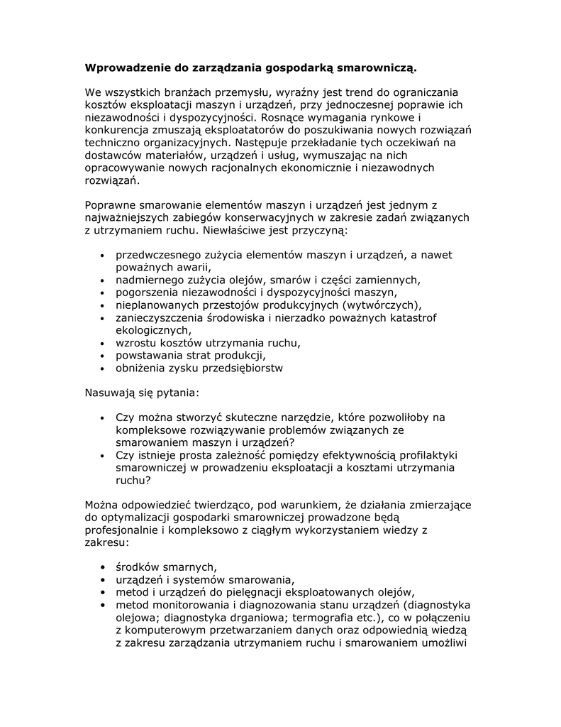 Wprowadzenie do zarządzania gospodarką smarowniczą. We wszystkich branżach przemysłu, wyraźny jest trend do ograniczania kosztów eksploatacji maszyn i urządzeń, przy jednoczesnej poprawie ich niezawodności i dyspozycyjności. Rosnące wymagania rynkowe i konkurencja zmuszają eksploatatorów do poszukiwania nowych rozwiązań techniczno organizacyjnych. Następuje przekładanie tych oczekiwań na dostawców materiałów, urządzeń i usług, wymuszając na nich opracowywanie nowych racjonalnych ekonomicznie i niezawodnych rozwiązań. Poprawne smarowanie elementów maszyn i urządzeń jest jednym z najważniejszych zabiegów konserwacyjnych w zakresie zadań związanych z utrzymaniem ruchu. Niewłaściwe jest przyczyną: • • • • • • • • przedwczesnego zużycia elementów maszyn i urządzeń, a nawet poważnych awarii, nadmiernego zużycia olejów, smarów i części zamiennych, pogorszenia niezawodności i dyspozycyjności maszyn, nieplanowanych przestojów produkcyjnych (wytwórczych), zanieczyszczenia środowiska i nierzadko poważnych katastrof ekologicznych, wzrostu kosztów utrzymania ruchu, powstawania strat produkcji, obniżenia zysku przedsiębiorstw Nasuwają się pytania: • • Czy można stworzyć skuteczne narzędzie, które pozwoliłoby na kompleksowe rozwiązywanie problemów związanych ze smarowaniem maszyn i urządzeń? Czy istnieje prosta zależność pomiędzy efektywnością profilaktyki smarowniczej w prowadzeniu eksploatacji a kosztami utrzymania ruchu? Można odpowiedzieć twierdząco, pod warunkiem, że działania zmierzające do optymalizacji gospodarki smarowniczej prowadzone będą profesjonalnie i kompleksowo z ciągłym wykorzystaniem wiedzy z zakresu: • • • • środków smarnych, urządzeń i systemów smarowania, metod i urządzeń do pielęgnacji eksploatowanych olejów, metod monitorowania i diagnozowania stanu urządzeń (diagnostyka olejowa; diagnostyka drganiowa; termografia etc.), co w połączeniu z komputerowym przetwarzaniem danych oraz odpowiednią wiedzą z zakresu zarządzania utrzymaniem ruchu i smarowaniem umożliwi uzyskanie odpowiedniej efektywności smarowania parku maszynowego. Gospodarka smarownicza, jest zespołem działań technicznoorganizacyjnych mających zapewnić najbardziej optymalne warunki smarowania maszyn i urządzeń. Sam proces zarządzania smarowaniem jest nierozłączną częścią systemów zarządzania eksploatacją i utrzymaniem ruchu urządzeń zorientowanych na utrzymanie wysokiej niezawodności. Brak zrozumienia jak istotną rolę pełni smarowanie maszyn powoduje, że większość zakładów z różnym nasileniem doświadcza problemów smarowniczych. Najczęściej spotykane przyczyny źródłowe problemów smarowniczych w zakładach to: • • • • • • • • • • • rozproszona odpowiedzialność za smarowani maszyn i urządzeń (nie ma jednej osoby/komórki organizacyjnej odpowiedzialnej za smarowanie całego parku maszynowego zakładu), źle zdefiniowane/zidentyfikowane wymagania urządzeń co do smarowania, zbyt wiele różnych środków smarnych w użyciu, źle zaplanowane działania smarownicze, brak zapisów z wykonanych czynności, brak nadzoru nad czystością olejów i układów olejowych, źle dobrane lub niska jakość środków smarnych w użyciu, niezidentyfikowane inne problemy techniczne w urządzeniach, wykonywanie zadań smarowniczych przez niewykwalifikowany personel, niewykorzystywanie lub ignorowanie obserwacji personelu smarowniczego o stanie systemów smarowniczych urządzeń, brak aktualizacji do bieżących potrzeb programu smarowniczego. Efektywne, nowoczesne gospodarki smarownicze obejmują swoim zasięgiem m.in.: • • • • • • • • zarządzanie gospodarką smarowniczą całego parku maszynowego przedsiębiorstwa, sporządzanie i aktualizowanie instrukcji eksploatacji w zakresie smarowania maszyn i urządzeń, szkolenie pracowników zajmujących się eksploatacją i utrzymaniem ruchu maszyn i urządzeń, dobór środków smarnych, dostawę i magazynowanie środków smarnych i materiałów pomocniczych, wymianę i uzupełnianie olejów i smarów, czyszczenie i płukanie układów olejowych i systemów smarowania maszyn i urządzeń, pielęgnację olejów w eksploatacji, • • • • monitorowanie olejów w eksploatacji i diagnozowanie stanu technicznego maszyn i urządzeń w oparciu o wyniki badań olejów i zarządzanie wynikami badań, definiowanie i planowanie działań zaradczych i naprawczych, realizację zaplanowanych działań zaradczych i naprawczych, gospodarkę olejami przepracowanymi i innymi odpadami związanymi ze smarowaniem. Przed rozpoczęciem prac nad wdrożeniem kompleksowego programu smarowniczego należy dokonać tzw. auditu smarowniczego. Celem auditu smarowniczego jest określenie stanu obecnego, który wyznaczy punkt inicjujący następne działania i określi ich kierunek. Taka analiza powinna być wykonana przez specjalistów posiadających konkretną wiedzę w dziedzinie inżynierii smarowania i diagnostyki oraz duże doświadczenie w zakresie eksploatacji maszyn i urządzeń. Proces usprawniania i porządkowania gospodarki smarowniczej zakładu powinien być starannie zaplanowany i przygotowany. Modernizacja systemów utrzymania ruchu, w tym ich aspektów smarowania maszyn i urządzeń, jest nieodzowna, bo przynosi wymierne efekty ze względu na eliminowanie awarii, wydłużenie żywotności i poprawy dyspozycyjności parku maszynowego.
