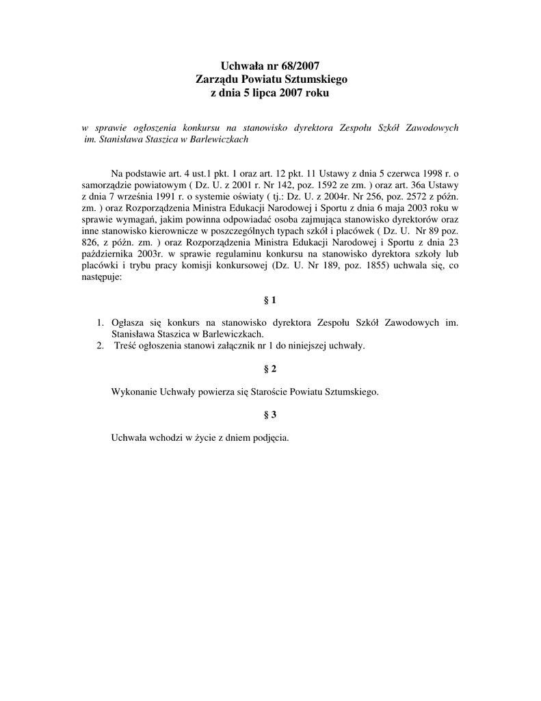 Uchwała nr 68/2007 Zarządu Powiatu Sztumskiego z dnia 5 lipca 2007 roku w sprawie ogłoszenia konkursu na stanowisko dyrektora Zespołu Szkół Zawodowych im. Stanisława Staszica w Barlewiczkach Na podstawie art. 4 ust.1 pkt. 1 oraz art. 12 pkt. 11 Ustawy z dnia 5 czerwca 1998 r. o samorządzie powiatowym ( Dz. U. z 2001 r. Nr 142, poz. 1592 ze zm. ) oraz art. 36a Ustawy z dnia 7 września 1991 r. o systemie oświaty ( tj.: Dz. U. z 2004r. Nr 256, poz. 2572 z późn. zm. ) oraz Rozporządzenia Ministra Edukacji Narodowej i Sportu z dnia 6 maja 2003 roku w sprawie wymagań, jakim powinna odpowiadać osoba zajmująca stanowisko dyrektorów oraz inne stanowisko kierownicze w poszczególnych typach szkół i placówek ( Dz. U. Nr 89 poz. 826, z późn. zm. ) oraz Rozporządzenia Ministra Edukacji Narodowej i Sportu z dnia 23 października 2003r. w sprawie regulaminu konkursu na stanowisko dyrektora szkoły lub placówki i trybu pracy komisji konkursowej (Dz. U. Nr 189, poz. 1855) uchwala się, co następuje: §1 1. Ogłasza się konkurs na stanowisko dyrektora Zespołu Szkół Zawodowych im. Stanisława Staszica w Barlewiczkach. 2. Treść ogłoszenia stanowi załącznik nr 1 do niniejszej uchwały. §2 Wykonanie Uchwały powierza się Staroście Powiatu Sztumskiego. §3 Uchwała wchodzi w życie z dniem podjęcia. UZASADNIENIE Ustawa o systemie oświaty w art. 36a określa sposób wyłaniania kandydata na stanowisko dyrektora szkoły lub placówki, a także okres powierzenia funkcji dyrektora, a regulamin konkursu określa Rozporządzenie Ministra Edukacji Narodowej i Sportu z dnia 23 października 2003r. w sprawie regulaminu konkursu na stanowisko dyrektora szkoły lub placówki i trybu pracy komisji konkursowej. W bieżącym roku szkolnym Pani Ewa Czapiewska zrezygnowała ze sprawowania funkcji dyrektora w Zespole Szkół Zawodowych im. Stanisława Staszica w Barlewiczkach. W związku z powyższym zachodzi potrzeba ogłoszenia konkursu na w/w stanowiska dyrektorów. Załącznik nr 1 do Uchwały nr 68/2007 Zarządu Powiatu Sztumskiego z dnia 5 lipca 2007r. Zarząd Powiatu Sztumskiego ogłasza konkurs na kandydata na stanowisko dyrektora Zespołu Szkół Zawodowych im. Stanisława Staszica w Barlewiczkach Do konkursu może przystąpić osoba, która spełnia wymagania określone w rozporządzeniu Ministra Edukacji Narodowej i Sportu z dnia 6 maja 2003 roku w sprawie wymagań, jakim powinna odpowiadać osoba zajmująca stanowisko dyrektora oraz inne stanowisko kierownicze w poszczególnych typach szkół i placówek ( Dz. U. Nr 89, poz. 826, z późn. zm. ), tj.: I. Nauczyciel mianowany lub dyplomowany, który spełnia następujące kryteria: 1) posiada wykształcenie wyższe magisterskie z przygotowaniem pedagogicznym lub wykształcenie wyższe zawodowe z przygotowaniem pedagogicznym oraz posiada kwalifikacje do zajmowania stanowiska nauczyciela w szkole lub placówce, 2) ukończył studia wyższe lub podyplomowe z zakresu zarządzania oświatą albo kurs kwalifikacyjny z zakresu zarządzania oświatą, prowadzony zgodnie z przepisami w sprawie placówek doskonalenia nauczycieli, 3) posiada co najmniej 5-letni staż pracy pedagogicznej na stanowisku nauczyciela lub 5-letni staż pracy dydaktycznej na stanowisku nauczyciela akademickiego, 4) w okresie 5 lat bezpośrednio przed powierzeniem stanowiska dyrektora uzyskał co najmniej dobrą ocenę pracy w szkole lub placówce a w przypadku nauczyciela akademickiego pozytywną ocenę pracy w okresie ostatnich czterech lat pracy w szkole wyższej albo w okresie roku bezpośrednio przed przystąpieniem do konkursu na stanowisko dyrektora uzyskał pozytywną ocenę dorobku zawodowego, 5) posiada zaświadczenie lekarskie o braku przeciwwskazań zdrowotnych do wykonywania pracy na stanowisku kierowniczym, 6) nie był karany karą dyscyplinarną, o której mowa w art.76 ust.1 ustawy z dnia 26 stycznia 1982r. – Karta Nauczyciela (Dz. U. z 2006r. Nr 97, poz. 674 z późn. zm.) oraz nie toczy się przeciw niemu postępowanie dyscyplinarne, 7) nie był karany za przestępstwo popełnione umyślnie oraz nie toczy się przeciwko niej postępowanie karne, 8) nie był karany zakazem pełnienia funkcji kierowniczych związanych z dysponowaniem środkami publicznymi, o których mowa w art.31 ust.1 pkt.4 ustawy z dnia 17 grudnia 2004r. o odpowiedzialności za naruszenie dyscypliny finansów publicznych (Dz. U. z 2005r. Nr 14, poz. 114 z późn. zm.) II. Nauczyciel mianowany lub dyplomowany zatrudniony na stanowisku wymagającym kwalifikacji pedagogicznych w urzędzie administracji rządowej, kuratorium oświaty, Centralnej Komisji Egzaminacyjnej i okręgowych komisjach egzaminacyjnych oraz nauczyciel mianowany lub dyplomowany urlopowany lub zwolniony z obowiązku świadczenia pracy na podstawie ustawy z dnia 23.05.1991r. o związkach zawodowych (tj.: Dz. U. z 2001r. Nr 79, poz. 854 z późn. zm.) spełniający wymagania określone w pkt. I za wyjątkiem wymogu posiadania co najmniej dobrej oceny pracy albo pozytywnej oceny dorobku zawodowego. III. Osoba nie będąca nauczycielem, która: 1) ukończyła studia wyższe magisterskie, 2) posiada 5-letni staż pracy, 3) posiada wykształcenie i przygotowanie zawodowe odpowiadające kierunkowi kształcenia w szkole lub zakresowi zadań placówki, 4) spełnia wymagania określone w pkt. I ppkt. 2 i 5-8. Na podstawie Rozporządzenia Ministra Edukacji Narodowej i Sportu z dnia 23 października 2003r. w sprawie regulaminu konkursu na stanowisko dyrektora szkoły lub placówki i trybu pracy komisji konkursowej (Dz. U. Nr 189, poz. 1855) oferty osób przystępujących do konkursu powinny zawierać: a) uzasadnienie przystąpienia do konkursu wraz z koncepcją funkcjonowania i rozwoju szkoły lub placówki, b) życiorys z opisem przebiegu pracy zawodowej, zawierający w szczególności informację o stażu pracy pedagogicznej w przypadku nauczyciela lub stażu pracy dydaktycznej w przypadku nauczyciela mianowanego, c) ak