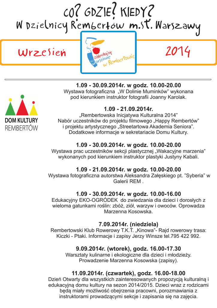 1.09 - 30.09.2014r. w godz. 10.00-20.00 Wystawa fotograficzna „W Dolinie Muminków” wykonana pod kierunkiem instruktor fotografii Joanny Karolak. 1.09 - 21.09.2014r. „Rembertowska Inicjatywa Kulturalna 2014” Nabór uczestników do projektu filmowego „Happy Rembertów” i projektu artystycznego „Streetartowa Akademia Seniora”. Dodatkowe informacje w sekretariacie Domu Kultury. 1.09 - 30.09.2014r. w godz. 10.00-20.00 Wystawa prac uczestników sekcji plastycznej „Wakacyjne marzenia” wykonanych pod kierunkiem instruktor plastyki Justyny Kabali. 1.09 - 21.09.2014r. w godz. 10.00-20.00 Wystawa fotograficzna autorstwa Aleksandra Załęskiego pt. ”Syberia” w Galerii REM . 1.09 - 30.09.2014r. w godz. 10.00-16.00 Edukacyjny EKO-OGRÓDEK do zwiedzania dla dzieci i dorosłych z wieloma gatunkami roślin: zbóż, ziół, warzyw i owoców. Oprowadza Marzenna Kosowska. 7.09.2014r. (niedziela) Rembertowski Klub Rowerowy T.K.T. „Kinowa”- Rajd rowerowy trasa: Kiczki - Ptaki. Informacje i zapisy Jerzy Winsze tel.795 422 992. 9.09.2014r. (wtorek), godz. 16.00-17.30 Warsztaty kulinarne i ekologiczne dla dzieci i młodzieży. Prowadzenie Marzenna Kosowska (zapisy). 11.09.2014r. (czwartek), godz. 16.00-18.00 Dzień Otwarty dla wszystkich zainteresowanych propozycją kulturalną i edukacyjną domu kultury na sezon 2014/2015. Dzieci wraz z rodzicami będą miały możliwość obejrzenia pracowni, porozmawiania z instruktorami prowadzącymi sekcje i zapisania się na zajęcia. 13.09.2014r. (sobota), godz. 12.00-20.00 Prezentacja Domu Kultury na pikniku rodzinnym „Rembertowskie Pożegnanie Lata”. 14.09.2014 r. (niedziela) Rembertowski Klub Rowerowy K.T.K. „Kinowa”. Rajd rowerowy: Cmentarz Ewangelicko – Augsburski. Informacje i zapisy Jerzy Winsze tel.795 422 992. 15.09.2014r. (poniedziałek), godz. 16.30-18.00 Warsztaty kulinarne i ekologiczne dla dzieci i młodzieży. Prowadzenie Marzenna Kosowska (zapisy). 21.09.2014r. (niedziela) Rembertowski Klub Rowerowy K.T.K. „Kinowa”. Rajd rowerowy: Rembertów - Stadion Narodowy - Rembertów. Zakończenie sezonu - grill. Informacje i zapisy Jerzy Winsze tel. 795 422 992. 24.09.2014r. (środa), godz.18.00 „Rembertowska Inicjatywa Kulturalna 2014” Bliskie spotkania z kulturą i kuchnią różnych stron świata – kuchnia kresowa. Spotkanie poprowadzi Michał Kisiel propagator kuchni staropolskiej i kresowej z Domu Polonii w Pułtusku. 01.09.2014 r. (poniedziałek), godz. 14.00 – 18.00 Zapisy do sekcji działających w DK „Wygoda”: zajęcia plastyczne dla dzieci, taneczne dla dzieci, nauka gry na gitarze klasycznej, elektrycznej i basowej, nauka gry na perkusji, nauka gry na pianinie, gimnastyka zdrowotna dla pań, gimnastyka dla dzieci, Zumba, aerobik, zajęcia wokalne, balet dla dzieci, młodzieżowy zespół muzyczny „Idę sobie”, zajęcia teatralne, rysunek dla dzieci, młodzieży i dorosłych, zajęcia ceramiczne, nauka języków obcych, nauka tańca flamenco 08.09 - 30.09.2014 r. w godz. 14.00 - 19.30 Wystawa pokonkursowa prac plastycznych uczestników akcji „Lato w mieście 2014” 09.09.2014 r. (wtorek), godz. 16.00 – 19.00 Cykl warsztatów teatru ulicznego dla dzieci i młodzieży w ramach projektu „In Blue” – prowadzenie warsztatów aktorzy Teatru Akt. Projekt współfinansowany przez m.st. Warszawy 13.09.2014 r. (sobota), godz. 12.00 – 20.00 „Rembertowskie Pożegnanie Lata” – piknik rodzinny Występy artystyczne wychowanków DK „Wygoda” na scenie Namiot DK „Wygoda”: prezentacja dorobku artystycznego, warsztaty plastyczno-artystyczne, warsztaty ceramiczne, malowanie twarzy Organizator: Urząd Dzielnicy Rembertów m.st. Warszawy Miejsce: przestrzeń parkowa przy ul. Strażackiej 16.09.2014 r. (wtorek), godz. 16.00 – 19.00 Cykl warsztatów teatru ulicznego dla dzieci i młodzieży w ramach projektu „In Blue” – prowadzenie warsztatów aktorzy Teatru Akt. Projekt współfinansowany przez m.st. Warszawy 18.09.2014 r. (czwartek), godz. 16.00 – 19.00 Cykl warsztatów teatru ulicznego dla dzieci i młodzieży w ramach projektu „In Blue” – prowadzenie warsztatów aktorzy Teatru Akt. Projekt współfinansowany przez m.st. Warszawy 20.09.2014 r. (sobota), godz. 15.00 – 17.00 Parada uczestników warsztatów teatru ulicznego ulicami osiedla „Kawęczyn – Wygoda” w ramach projektu „In Blue”. Projekt współfinansowany przez m.st. Warszawy 20.09.2014 r. (sobota), godz. 19.00 – 20.00 Spektakl plenerowy pt.: „ In Blue” w wykonaniu aktorów Teatru Akt. Projekt współfinansowany przez m.st. Warszawy 11.09.2014r. (czwartek), godz.17.00 Koncert muzyczny dla dzieci Zajęcia plastyczne 24.09.2014r. (środa), godz. 18.00 Spotkanie Dyskusyjnego Klubu Książki Joanna Szczęśna, Anna Bikont „Pamiątkowe rupiecie. Biografia Wisławy Szymborskiej.” 1.09.2014r. (poniedziałek), godz. 9.00 Msza Święta w 75. rocznicę wybuchu II wojny światowej w Kościele św. O. Rafała Kalinowskiego al. gen. a. Chruściela 103 godz. 11.00 9-rocznica odsłonięcia Pomnika przy ul. Powroźniczej Organizatorzy: - Urząd Dzielnicy Rembertów, Gimnazjum nr 126, delegacje szkół 11.09.2014r. (czwartek), godz. 12.00 Złożenie wieńców w 70. rocznicę wyzwolenia Rembertowa przez I DP im. T. Kościuszki Miejsce: Dom Kultury „Rembertów” przy al. Komandosów 8 (tablica na frontonie budynku), Cmentarz przy ul. Grzybowej Organizatorzy: Urząd Dzielnicy Rembertów, delegacje szkół 13.09.2014r. (sobota), godz. 12.00 - 20.00 „Rembertowskie pożegnanie lata” Miejsce: Teren przy zbiegu ul.Strażackiej i Kordiana Organizator: Urząd Dzielnicy Rembertów m.st. Warszawy 13.09.2014r. (sobota), godz. 11.00 Wydarzenia sportowe Turniej Siatkówki Plażowej o Pucha Burmistrza Dzielnicy Rembertów m.st. Warszawy Miejsce: teren rekreacyjny przy ul. Strażackiej Organizatorzy: LI LO, Urząd Dzielnicy – Samodzielne Wieloosobowe Stanowisko Pracy ds. Sportu i Rekreacji dla Dzielnicy Rembertów m.st. Wars