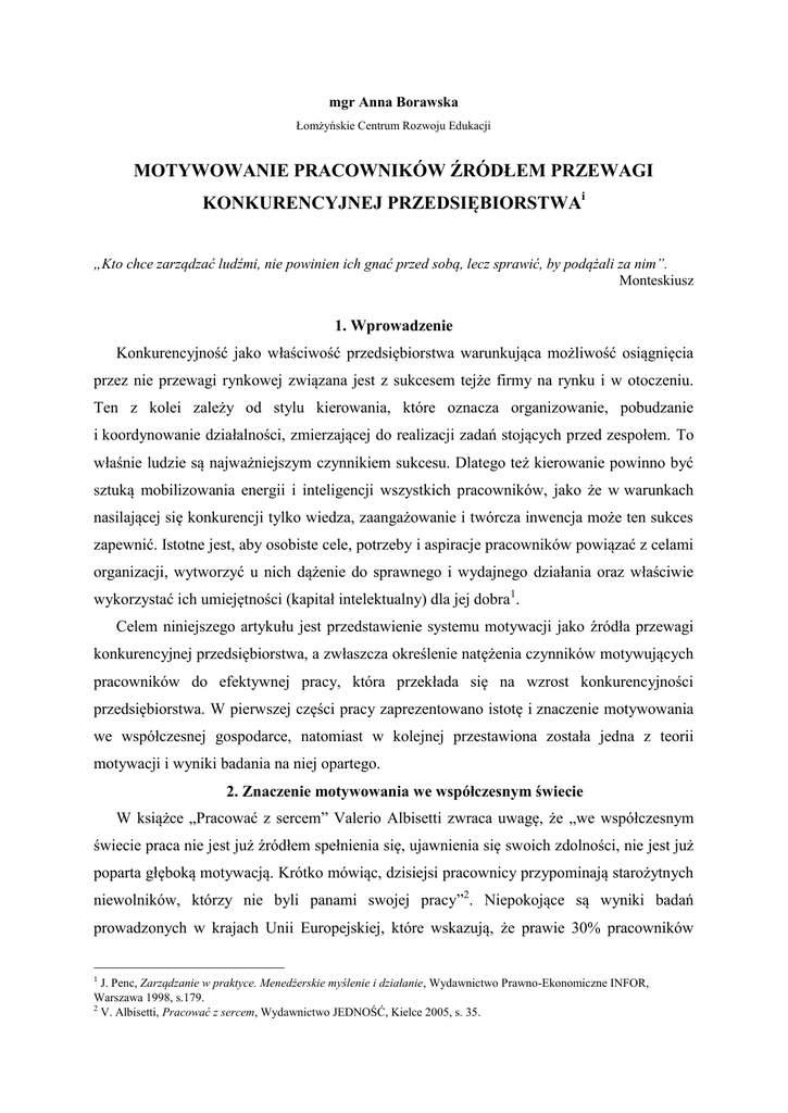 mgr Anna Borawska Łomżyńskie Centrum Rozwoju Edukacji MOTYWOWANIE PRACOWNIKÓW ŹRÓDŁEM PRZEWAGI KONKURENCYJNEJ PRZEDSIĘBIORSTWAi „Kto chce zarządzać ludźmi, nie powinien ich gnać przed sobą, lecz sprawić, by podążali za nim”. Monteskiusz 1. Wprowadzenie Konkurencyjność jako właściwość przedsiębiorstwa warunkująca możliwość osiągnięcia przez nie przewagi rynkowej związana jest z sukcesem tejże firmy na rynku i w otoczeniu. Ten z kolei zależy od stylu kierowania, które oznacza organizowanie, pobudzanie i koordynowanie działalności, zmierzającej do realizacji zadań stojących przed zespołem. To właśnie ludzie są najważniejszym czynnikiem sukcesu. Dlatego też kierowanie powinno być sztuką mobilizowania energii i inteligencji wszystkich pracowników, jako że w warunkach nasilającej się konkurencji tylko wiedza, zaangażowanie i twórcza inwencja może ten sukces zapewnić. Istotne jest, aby osobiste cele, potrzeby i aspiracje pracowników powiązać z celami organizacji, wytworzyć u nich dążenie do sprawnego i wydajnego działania oraz właściwie wykorzystać ich umiejętności (kapitał intelektualny) dla jej dobra1. Celem niniejszego artykułu jest przedstawienie systemu motywacji jako źródła przewagi konkurencyjnej przedsiębiorstwa, a zwłaszcza określenie natężenia czynników motywujących pracowników do efektywnej pracy, która przekłada się na wzrost konkurencyjności przedsiębiorstwa. W pierwszej części pracy zaprezentowano istotę i znaczenie motywowania we współczesnej gospodarce, natomiast w kolejnej przestawiona została jedna z teorii motywacji i wyniki badania na niej opartego. 2. Znaczenie motywowania we współczesnym świecie W książce „Pracować z sercem” Valerio Albisetti zwraca uwagę, że „we współczesnym świecie praca nie jest już źródłem spełnienia się, ujawnienia się swoich zdolności, nie jest już poparta głęboką motywacją. Krótko mówiąc, dzisiejsi pracownicy przypominają starożytnych niewolników, którzy nie byli panami swojej pracy”2. Niepokojące są wyniki badań prowadzonych w krajach Unii Europejskiej, które wskazują, że prawie 30% pracowników 1 J. Penc, Zarządzanie w praktyce. Menedżerskie myślenie i działanie, Wydawnictwo Prawno-Ekonomiczne INFOR, Warszawa 1998, s.179. 2 V. Albisetti, Pracować z sercem, Wydawnictwo JEDNOŚĆ, Kielce 2005, s. 35. obserwuje u siebie destruktywny wpływ aktywności zawodowej na swą kondycję psychofizyczną. W wyniku tego ponoszone są różnorodne straty, w tym także finansowe. Szacuje się, że Stany Zjednoczone ponoszą rocznie koszty rzędu 200 miliardów dolarów z racji finansowania pomocy medycznej i wypłacania odszkodowań dla osób zatrudnionych3. Kłopoty zdrowotne pracowników związane są głównie ze stresem, prowadzącym do wypalenia zawodowego. Stan apatii zawodowej zatrudnionego może łączyć się z poczuciem bezsensu, przekonaniem o braku własnej wartości i postawą rezygnacji, co skutkuje obniżeniem wydajności pracy, a w konsekwencji spadkiem konkurencyjności firmy i jej strat finansowych. Niezaprzeczalnym jest fakt, że w kierowaniu ludźmi szczególną rolę odgrywa pobudzanie ich motywacji. Zadaniem menedżerów jest włączenie pracowników w działalność firmy i zapewnienie ich kreatywnego zaangażowania się w pracę i obowiązki służbowe. Według Ewy Lisowskiej „współcześnie doskonały menedżer to osoba, która ma cechy przywódcze – potrafi pociągać za sobą innych. To osoba komunikatywna, empatyczna, myśląca holistycznie, a nie sekwencyjnie, motywująca poprzez wzmacnianie mocnych stron podwładnych, docenianie ich kreatywności i innowacyjności, wyzwalająca inicjatywę i dążenie do kooperacji”4. 3. Istota motywowania O wynikach osiąganych przez pracownika, wpływających jednocześnie na sukces firmy, decydują trzy czynniki:  motywacja (pragnienie wykonywania pracy),  możliwości (zdolność do wykonywania danej pracy),  środowisko pracy (zasoby niezbędne do wykonywania pracy)5. W sytuacji, gdy pracownik nie ma zdolności do wykonywania danej pracy, pracodawca może zapewnić mu szkolenie. Kiedy występują braki w zasobach niezbędnych do wykonywania pracy, również można je skorygować. Natomiast w przypadku niedostatecznej motywacji do pracy, sytuacja jest trudniejsza. Związane jest to z faktem, iż zachowanie człowieka jest procesem złożonym i indywidualnym, zatem ciężko jest opracować jednolity system motywów, wpływających na postępowanie pracowników. Odpowiednia motywacja daje pracownikowi poczucie zadowolenia i satysfakcji, co z kolei wpływa korzystnie na wydajność i jakość wykonywanej pracy. 3 G. E. Brogmus, The rise and fall? Of mental stress claims in the USA, Work & Stress, 1996, s. 24-25. A. Król, E. Lisowska, Daj sobie awans, Charaktery nr 12 (155), 2009. 5 R. W. Griffin, Podstawy zarządzania organizacjami, Wydawnictwo Naukowe PWN, Warszawa 2007, s. 519. 4 Pojęcie motywacji nie ma jednoznacznej interpretacji. W literaturze z zakresu zarządzania motywowanie jest uznawane ze jedną z funkcji kierowania. Reinhard Sprenger sprowadza definicję motywacji do kilku stwierdzeń:  stworzenie możliwości w realizacji ludzkich motywów postępowania,  wyposażenie kogoś w bodźce do określonego działania, których wcześniej nie miał,  obarczenie sposobu zachowania jednostki pewnego rodzaju znaczeniem,  rozbudzenie entuzjazmu,  zachęcenie do działania6. Z kolei Michael Armstrong pisze, że „motywowanie ludzi to ukierunkowanie ich na określone działania, (…) zachowanie nastawione na osiągnięcie określonego celu. Ludzie są zmotywowani, kiedy oczekują, że sposób postępowania najprawdopodobniej doprowadzi do osiągnięcia celu i uzyskania wartościowej nagrody, jaką może być na przykład zaspokojenie potrzeb”7. Najbardziej spójną definicję w odniesieniu do zarządzania zasobami ludzkimi podaje Stanisława Bor