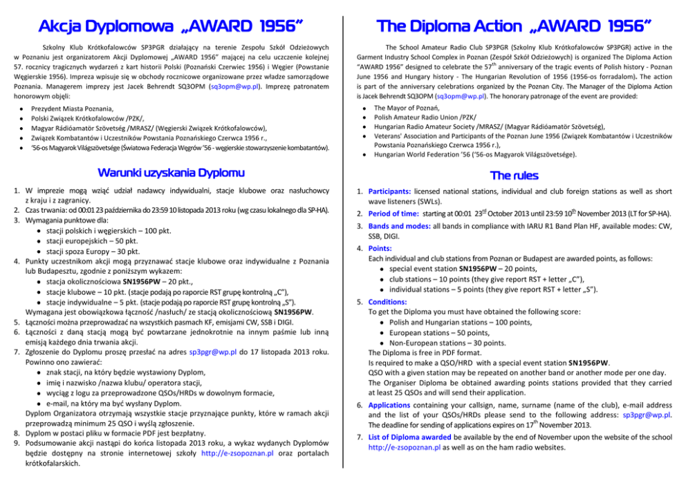 Akcja Dyplomowa „AWARD 1956” The Diploma Action „AWARD 1956” Szkolny Klub Krótkofalowców SP3PGR działający na terenie Zespołu Szkół Odzieżowych w Poznaniu jest organizatorem Akcji Dyplomowej „AWARD 1956” mającej na celu uczczenie kolejnej 57. rocznicy tragicznych wydarzeo z kart historii Polski (Poznaoski Czerwiec 1956) i Węgier (Powstanie Węgierskie 1956). Impreza wpisuje się w obchody rocznicowe organizowane przez władze samorządowe Poznania. Managerem imprezy jest Jacek Behrendt SQ3OPM ([email protected]). Imprezę patronatem honorowym objęli: The School Amateur Radio Club SP3PGR (Szkolny Klub Krótkofalowców SP3PGR) active in the Garment Industry School Complex in Poznan (Zespół Szkół Odzieżowych) is organized The Diploma Action th “AWARD 1956” designed to celebrate the 57 anniversary of the tragic events of Polish history - Poznan June 1956 and Hungary history - The Hungarian Revolution of 1956 (1956-os forradalom). The action is part of the anniversary celebrations organized by the Poznan City. The Manager of the Diploma Action is Jacek Behrendt SQ3OPM ([email protected]). The honorary patronage of the event are provided: Prezydent Miasta Poznania, Polski Związek Krótkofalowców /PZK/, Magyar Rádióamatör Szövetség /MRASZ/ (Węgierski Związek Krótkofalowców), Związek Kombatantów i Uczestników Powstania Poznaoskiego Czerwca 1956 r., ‘56-os Magyarok Világszövetsége (Światowa Federacja Węgrów ’56 - węgierskie stowarzyszenie kombatantów). The Mayor of Poznao, Polish Amateur Radio Union /PZK/ Hungarian Radio Amateur Society /MRASZ/ (Magyar Rádióamatör Szövetség), Veterans' Association and Participants of the Poznan June 1956 (Związek Kombatantów i Uczestników Powstania Poznaoskiego Czerwca 1956 r.), Hungarian World Federation ’56 (‘56-os Magyarok Világszövetsége). Warunki uzyskania Dyplomu The rules 1. W imprezie mogą wziąd udział nadawcy indywidualni, stacje klubowe oraz nasłuchowcy z kraju i z zagranicy. 2. Czas trwania: od 00:01 23 października do 23:59 10 listopada 2013 roku (wg czasu lokalnego dla SP-HA). 3. Wymagania punktowe dla: stacji polskich i węgierskich – 100 pkt. stacji europejskich – 50 pkt. stacji spoza Europy – 30 pkt. 4. Punkty uczestnikom akcji mogą przyznawad stacje klubowe oraz indywidualne z Poznania lub Budapesztu, zgodnie z poniższym wykazem: stacja okolicznościowa SN1956PW – 20 pkt., stacje klubowe – 10 pkt. (stacje podają po raporcie RST grupę kontrolną „C”), stacje indywidualne – 5 pkt. (stacje podają po raporcie RST grupę kontrolną „S”). Wymagana jest obowiązkowa łącznośd /nasłuch/ ze stacją okolicznościową SN1956PW. 5. Łączności można przeprowadzad na wszystkich pasmach KF, emisjami CW, SSB i DIGI. 6. Łączności z daną stacją mogą byd powtarzane jednokrotnie na innym paśmie lub inną emisją każdego dnia trwania akcji. 7. Zgłoszenie do Dyplomu proszę przesład na adres [email protected] do 17 listopada 2013 roku. Powinno ono zawierad: znak stacji, na który będzie wystawiony Dyplom, imię i nazwisko /nazwa klubu/ operatora stacji, wyciąg z logu za przeprowadzone QSOs/HRDs w dowolnym formacie, e-mail, na który ma byd wysłany Dyplom. Dyplom Organizatora otrzymają wszystkie stacje przyznające punkty, które w ramach akcji przeprowadzą minimum 25 QSO i wyślą zgłoszenie. 8. Dyplom w postaci pliku w formacie PDF jest bezpłatny. 9. Podsumowanie akcji nastąpi do kooca listopada 2013 roku, a wykaz wydanych Dyplomów będzie dostępny na stronie internetowej szkoły http://e-zsopoznan.pl oraz portalach krótkofalarskich. 1. Participants: licensed national stations, individual and club foreign stations as well as short wave listeners (SWLs). rd th 2. Period of time: starting at 00:01 23 October 2013 until 23:59 10 November 2013 (LT for SP-HA). 3. Bands and modes: all bands in compliance with IARU R1 Band Plan HF, available modes: CW, SSB, DIGI. 4. Points: Each individual and club stations from Poznan or Budapest are awarded points, as follows: special event station SN1956PW – 20 points, club stations – 10 points (they give report RST + letter „C”), individual stations – 5 points (they give report RST + letter „S”). 5. Conditions: To get the Diploma you must have obtained the following score: Polish and Hungarian stations – 100 points, European stations – 50 points, Non-European stations – 30 points. The Diploma is free in PDF format. Is required to make a QSO/HRD with a special event station SN1956PW. QSO with a given station may be repeated on another band or another mode per one day. The Organiser Diploma be obtained awarding points stations provided that they carried at least 25 QSOs and will send their application. 6. Applications containing your callsign, name, surname (name of the club), e-mail address and the list of your QSOs/HRDs please send to the following address: [email protected]. th The deadline for sending of applications expires on 17 November 2013. 7. List of Diploma awarded be available by the end of November upon the website of the school http://e-zsopoznan.pl as well as on the ham radio websites.