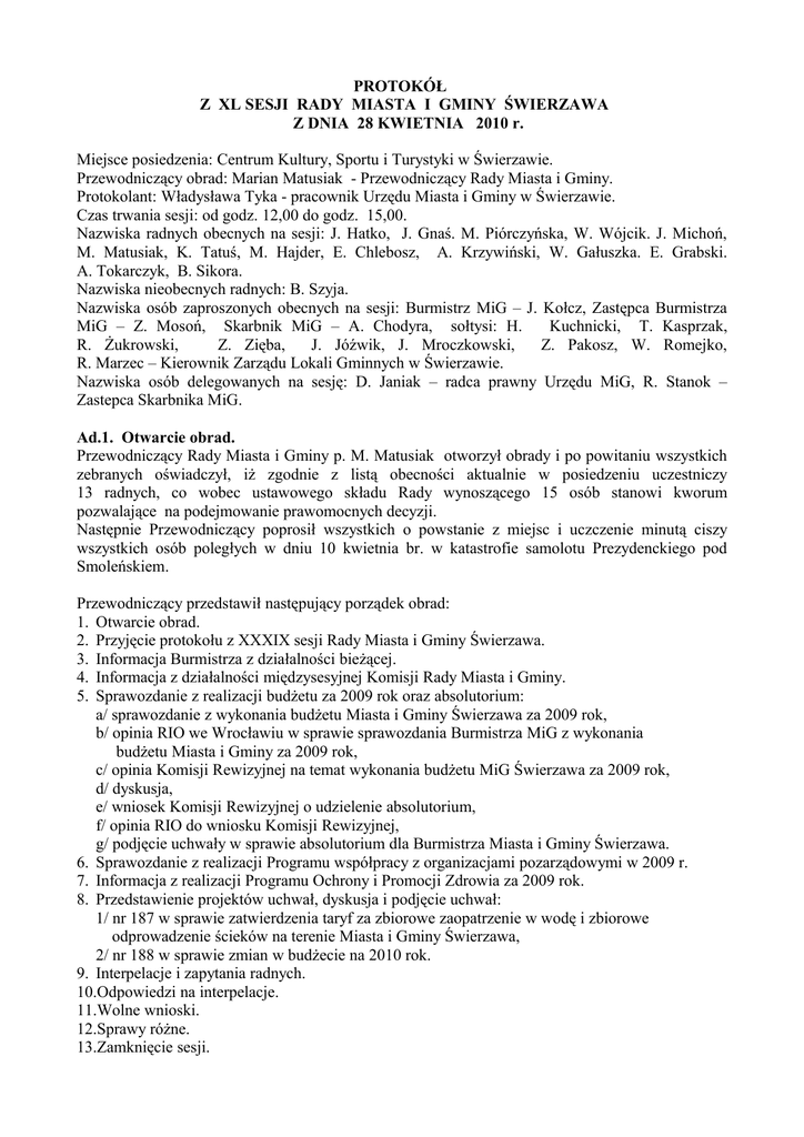 PROTOKÓŁ Z XL SESJI RADY MIASTA I GMINY ŚWIERZAWA Z DNIA 28 KWIETNIA 2010 r. Miejsce posiedzenia: Centrum Kultury, Sportu i Turystyki w Świerzawie. Przewodniczący obrad: Marian Matusiak - Przewodniczący Rady Miasta i Gminy. Protokolant: Władysława Tyka - pracownik Urzędu Miasta i Gminy w Świerzawie. Czas trwania sesji: od godz. 12,00 do godz. 15,00. Nazwiska radnych obecnych na sesji: J. Hatko, J. Gnaś. M. Piórczyńska, W. Wójcik. J. Michoń, M. Matusiak, K. Tatuś, M. Hajder, E. Chlebosz, A. Krzywiński, W. Gałuszka. E. Grabski. A. Tokarczyk, B. Sikora. Nazwiska nieobecnych radnych: B. Szyja. Nazwiska osób zaproszonych obecnych na sesji: Burmistrz MiG – J. Kołcz, Zastępca Burmistrza MiG – Z. Mosoń, Skarbnik MiG – A. Chodyra, sołtysi: H. Kuchnicki, T. Kasprzak, R. Żukrowski, Z. Zięba, J. Jóźwik, J. Mroczkowski, Z. Pakosz, W. Romejko, R. Marzec – Kierownik Zarządu Lokali Gminnych w Świerzawie. Nazwiska osób delegowanych na sesję: D. Janiak – radca prawny Urzędu MiG, R. Stanok – Zastepca Skarbnika MiG. Ad.1. Otwarcie obrad. Przewodniczący Rady Miasta i Gminy p. M. Matusiak otworzył obrady i po powitaniu wszystkich zebranych oświadczył, iż zgodnie z listą obecności aktualnie w posiedzeniu uczestniczy 13 radnych, co wobec ustawowego składu Rady wynoszącego 15 osób stanowi kworum pozwalające na podejmowanie prawomocnych decyzji. Następnie Przewodniczący poprosił wszystkich o powstanie z miejsc i uczczenie minutą ciszy wszystkich osób poległych w dniu 10 kwietnia br. w katastrofie samolotu Prezydenckiego pod Smoleńskiem. Przewodniczący przedstawił następujący porządek obrad: 1. Otwarcie obrad. 2. Przyjęcie protokołu z XXXIX sesji Rady Miasta i Gminy Świerzawa. 3. Informacja Burmistrza z działalności bieżącej. 4. Informacja z działalności międzysesyjnej Komisji Rady Miasta i Gminy. 5. Sprawozdanie z realizacji budżetu za 2009 rok oraz absolutorium: a/ sprawozdanie z wykonania budżetu Miasta i Gminy Świerzawa za 2009 rok, b/ opinia RIO we Wrocławiu w sprawie sprawozdania Burmistrza MiG z wykonania budżetu Miasta i Gminy za 2009 rok, c/ opinia Komisji Rewizyjnej na temat wykonania budżetu MiG Świerzawa za 2009 rok, d/ dyskusja, e/ wniosek Komisji Rewizyjnej o udzielenie absolutorium, f/ opinia RIO do wniosku Komisji Rewizyjnej, g/ podjęcie uchwały w sprawie absolutorium dla Burmistrza Miasta i Gminy Świerzawa. 6. Sprawozdanie z realizacji Programu współpracy z organizacjami pozarządowymi w 2009 r. 7. Informacja z realizacji Programu Ochrony i Promocji Zdrowia za 2009 rok. 8. Przedstawienie projektów uchwał, dyskusja i podjęcie uchwał: 1/ nr 187 w sprawie zatwierdzenia taryf za zbiorowe zaopatrzenie w wodę i zbiorowe odprowadzenie ścieków na terenie Miasta i Gminy Świerzawa, 2/ nr 188 w sprawie zmian w budżecie na 2010 rok. 9. Interpelacje i zapytania radnych. 10.Odpowiedzi na interpelacje. 11.Wolne wnioski. 12.Sprawy różne. 13.Zamknięcie sesji. - 2 Nikt nie zgłosił propozycji zmian w porządku obrad. W głosowaniu: za – 13, przeciw – 0, wstrzymujących się – 0 radnych porządek obrad został przyjęty. Ad. 2.Przyjęcie protokołu z XXXIX sesji Rady Miasta i Gminy Świerzawa. Nikt z radnych nie zgłosił uwag do protokołu. W głosowaniu: za – 13, przeciw – 0, wstrzymujących się – 0 radnych protokół został przyjęty. Dr Przemysław Nocuń z Uniwersytetu Jagiellońskiego w Krakowie przedstawił krótką informację związaną z pracami wykopaliskowymi na ruinach XIII wiecznego kościoła w Sędziszowej. Prace prowadzone były w ubiegłym roku, ich uczestnikami była kadra naukowców i studenci Uniwersytetu. Prace mają bardzo duże znaczenie historyczne. W celu dokładnego zbadania pozostałości kościoła trzeba nadal prowadzić badania. Wiąże się to jednak w kosztami zakwaterowania uczestników prac. Dr P. Nocuń wyraził nadzieję, że gmina, rozumiejąc historyczne znaczenie obiektu, wykaże zrozumienie dla potrzeb finansowych grupy badaczy tego terenu. Ad. 3. Informacja Burmistrza z działalności bieżącej. Burmistrz MiG J. Kołcz przedstawił informację z działalności międzysesyjnej. Załącznik nr 1. W trakcie informacji Burmistrza na sesję przybył radny W. Gałuszka. Od tego momentu w sesji uczestniczyło 14 radnych. Dyskusja: 1. K. Tatuś zapytała o to, kiedy planuje się rozpocząć inwestycję związaną z budową szeroko pasmowego internetu. 2. Burmistrz J. Kołcz odpowiedział, że do 2012 roku powinna być już wybudowana stacja bazowa. Trwa procedura przetargowa na wyłonienie wykonawcy projektu. Ad. 4. Informacja z działalności międzysesyjnej Komisji Rady Miasta i Gminy. 1. Przewodniczący Komisji Rewizyjnej p. W. Wójcik przedstawił informację o działalności Komisji w okresie międzysesyjnym. Załącznik nr 2. 2. Przewodniczący Komisji Budżetowo-Finansowej, Oświaty i Spraw Społecznych p. J. Michoń przedstawił informację o działalności Komisji w okresie międzysesyjnym. Załącznik nr 3. 3. Przewodniczący Komisji Rolnictwa i Infrastruktury Technicznej p. E. Grabski przedstawił informację o działalności Komisji w okresie międzysesyjnym. Załącznik nr 4. Ad. 5. Sprawozdanie z realizacji budżetu za 2009 rok oraz absolutorium:. a/ sprawozdanie z wykonania budżetu Miasta i Gminy Świerzawa za 2009 rok; Burmistrz J. Kołcz przedstawił sprawozdanie z wykonania budżetu Miasta i Gminy Świerzawa za 2009 rok . Załącznik nr 5. b/ opinia RIO we Wrocławiu w sprawie sprawozdania Burmistrza MiG z wykonania budżetu Miasta i Gminy za 2009 rok; Przewodniczący Rady odczytał uchwałę Składu Orzekającego Regionalnej Izby Obrachunkowej we Wrocławiu z dnia 8 kwietnia 2010 r. w sprawie opinii o przedłożonym przez Burmistrza Miasta i Gminy Świerzawa sprawozdaniu z wykonania budżetu gminy Świerzawa za 2009 rok. Załącznik nr 6. c/ opinia Komisji Rewizyjnej na temat wykonania budżetu MiG Świerzawa za 2009 rok; Przewodniczący Komisji Re