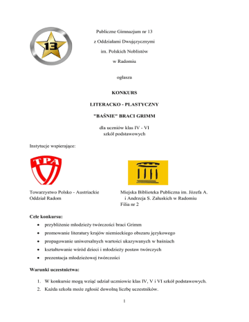 Publiczne Gimnazjum nr 13 z Oddziałami Dwujęzycznymi im. Polskich Noblistów w Radomiu ogłasza KONKURS KONKURS LITERACKO - PLASTYCZNY "BAŚNIE" BRACI GRIMM dla uczniów klas IV - VI szkół podstawowych Instytucje wspierające: Towarzystwo Polsko - Austriackie Oddział Radom Miejska Biblioteka Publiczna im. Józefa A. i Andrzeja S. Załuskich w Radomiu Filia nr 2 Cele konkursu: przybliżenie młodzieży twórczości braci Grimm promowanie literatury krajów niemieckiego obszaru językowego propagowanie uniwersalnych wartości ukazywanych w baśniach kształtowanie wśród dzieci i młodzieży postaw twórczych prezentacja młodzieżowej twórczości Warunki uczestnictwa: 1. W konkursie mogą wziąć udział uczniowie klas IV, V i VI szkół podstawowych. 2. Każda szkoła może zgłosić dowolną liczbę uczestników. 1 3. Warunkiem uczestnictwa w konkursie jest zgłoszenie zarówno pracy plastycznej, jak i literackiej (przygotowanych przez różnych uczestników). Praca plastyczna - to wykonana dowolną techniką praca ilustrująca wybraną baśń Braci Grimm. Praca literacka - polega na napisaniu współczesnej baśni (w języku polskim) opartej na motywach wybranej baśni Braci Grimm. 4. Praca literacka to tekst o objętości do trzech stron wydruku komputerowego (czcionka Times New Roman 12, marginesy 2,5, odstęp między wierszami 1,5). 5. Zgłaszane prace muszą być samodzielne, wcześniej niepublikowane i nienagradzane. 6. Prace (zarówno plastyczna, jaki i literacka) muszą być opatrzone pseudonimem. 7. Dane osobowe autora (imię i nazwisko, nazwa szkoły) oraz dane nauczyciela opiekuna (imię i nazwisko, numer telefonu kontaktowego) należy dołączyć w osobnej, zaklejonej kopercie, opatrzonej tym samym pseudonimem, co praca. 8. Prace należy przysłać lub przynieść osobiście do Publicznego Gimnazjum nr 13 Filii nr 2 Miejskiej Biblioteki z Oddziałami Dwujęzycznymi Publicznej im. Józefa A. im. Polskich Noblistów lub i Andrzeja S. Załuskich ul. 25 Czerwca 79 ul. Zientarskiego 1A 26 - 600 Radom 26 - 600 Radom z dopiskiem BAŚNIE BRACI GRIMM 9. Prace mogą być składane w terminie 12.05.2014r. do 16.05.2014r. 10. Rozstrzygnięcie konkursu nastąpi w PG 13 w terminie podanym przez organizatorów. 11. Prace będą oceniane w dwóch kategoriach, literackiej i plastycznej, przez jury powołane przez organizatorów. Oceny jurorów są nieodwołalne. 12. Laureaci otrzymają dyplomy i nagrody ufundowane przez organizatorów i instytucje wspierające. 13. Organizatorzy nie zwracają prac zgłoszonych na konkurs. Wszelkich informacji udzielają: Beata Ołowiak - [email protected] Ilona Maj - [email protected] nr telefonu do szkoły: 048 363 18 95 2