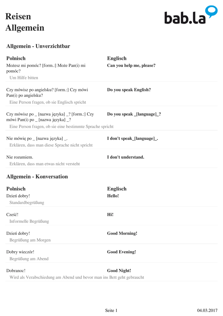 Reisen Allgemein Allgemein - Unverzichtbar Polnisch Englisch Możesz mi pomóc? [form.:] Może Pan(i) mi pomóc? Um Hilfe bitten Can you help me, please? Czy mówisz po angielsku? [form.:] Czy mówi Pan(i) po angielsku? Eine Person fragen, ob sie Englisch spricht Do you speak English? Czy mówisz po _ [nazwa języka] _? [form.:] Czy Do you speak _[language]_? mówi Pan(i) po _ [nazwa języka] _? Eine Person fragen, ob sie eine bestimmte Sprache spricht Nie mówię po _ [nazwa języka] _. Erklären, dass man diese Sprache nicht spricht I don't speak_[language]_. Nie rozumiem. Erklären, dass man etwas nicht versteht I don't understand. Allgemein - Konversation Polnisch Englisch Dzień dobry! Standardbegrüßung Hello! Cześć! Informelle Begrüßung Hi! Dzień dobry! Begrüßung am Morgen Good Morning! Dobry wieczór! Begrüßung am Abend Good Evening! Dobranoc! Good Night! Wird als Verabschiedung am Abend und bevor man ins Bett geht gebraucht Seite 1 04.03.2017 Reisen Allgemein Jak się masz? [form.:] Jak się Pan(i) ma? How are you? Frage nach dem Befinden der Person am Anfang des Gesprächs Dobrze, dziękuję. Good, thank you. Eine höfliche Antwort auf die Frage "Wie geht es Dir?" Jak się nazywasz? [form.:] Jak się Pan(i) nazywa? Eine andere Person nach dem Namen fragen What’s your name? Nazywam się ___. Einer Person den eigenen Namen sagen My name is ___. Skąd pochodzisz? [form.:] Skąd Pan(i) pochodzi? Fragen, woher jemand kommt Where are you from? Pochodzę z ___. Antworten, woher du kommst I am from___. Ile masz lat? [form.:] Ile ma Pan(i) lat? Fragen, wie alt jemand ist How old are you? Mam ___ lat(a). Antworten, wie alt du bist I am___years old. Tak Positive Antwort Yes Nie Negative Antwort No Proszę Please Höflichkeitsformel zur Unterstreichung einer Aufforderung oder Frage Proszę bardzo! Here you go! Wird gebraucht, wenn eine Person einer anderen etwas gibt Dziękuję. Jemanden danken Thank you. Seite 2 04.03.2017 Reisen Allgemein Dziękuję bardzo. Thank you very much. Wird gebraucht, wenn man jemanden herzlich dankt Proszę bardzo! / Nie ma za co! Höfliche Antwort auf "Danke" You're welcome. Przepraszam. Sich für etwas entschuldigen I am sorry. Przepraszam. Um die Aufmerksamkeit von jemanden bitten Excuse me. Nic się nie stało. It's OK. Auf eine Entschuldigung antworten, falls Du sie akzeptiert hast Nie ma sprawy. No problem. Auf eine Entschuldigung antworten, falls Du sie akzeptiert hast Uwaga! Jemanden auf eine Gefahr aufmerksam machen Watch out! Jestem głodny/-a. Wird gebraucht, wenn man hungrig ist I am hungry. Chce mi się pić. Wird gebraucht, wenn man durstig ist I am thirsty. Jestem zmęczony/-a. Wird gebraucht, wenn man müde ist I am tired. Źle się czuję. Wird gebraucht, wenn man krank ist I am sick. Nie wiem. Du weißt die Antwort auf eine Frage nicht I don't know. Miło było cię poznać. [form.:] Miło było Panią/Pana poznać. Höflicher Abschiedssatz nach einem ersten Treffen It was nice meeting you. Seite 3 04.03.2017 Reisen Allgemein Do widzenia! Sich höflich verabschieden Goodbye! Allgemein - Beschwerden Polnisch Englisch Chciał(a)bym złożyć skargę. I would like to make a complaint. Auf höfliche Art und Weise eine Beschwerde äußern Kto tu rządzi? Herausfinden, wer zuständig ist Who is in charge here? To jest absolutnie niedopuszczalne! This is totally unacceptable! Nachdrücklich seine Unzufriedenheit zum Ausdruck bringen Żądam zwrotu pieniędzy! Eine Rückerstattung fordern I want my money back! Czekamy ponad godzinę. Sich über lange Wartezeiten beschweren We have been waiting for over an hour. Allgemein - Fluchen Polnisch Englisch To jedzenie smakuje jak gówno! This food tastes like crap! Auf unhöfliche Art und Weise seine Unzufriedenheit mit dem Essen ausdrücken Ten napój/drink smakuje jak szczyny! This drink tastes like piss! Auf unhöfliche Art und Weise seine Unzufriedenheit über ein Getränk ausdrücken To miejsce to obrzydliwa nora! This place is a shithole! Sich auf unhöfliche Art und Weise über einen Ort äußern Ten samochód to wrak! This car is a wreck! Fluchend zum Ausdruck bringen, dass ein Auto in keinem guten Zustand ist Obsługa jest do dupy! The service sucks! Auf unhöfliche Art und Weise seine Unzufriedenheit mit dem Service ausdrücken Seite 4 04.03.2017 Reisen Allgemein To jest totalne zdzierstwo! This is a total rip-off! Sich auf unhöfliche Art und Weise über den Preis beschweren Gówno prawda! That is bullshit! Unglaube über etwas ausdrücken, das jemand gesagt hat Kretyn/Kretynka! You are a stupid moron! Eine Person beleidigen indem man ihre/seine Intelligenz kritisiert Gówno wiesz! You don't know shit! Eine Person beleidigen indem man ihr/sein sein Wissen kritisiert Odwal się! Piss off! Auf unhöfliche Art und Weise einer Person mitteilen, sofort zu gehen Załatwmy to na zewnątrz! Let's settle this outside! Einer Person sagen, außerhalb einer Bar oder Diskothek zu kämpfen Seite 5 Powered by TCPDF (www.tcpdf.org) 04.03.2017