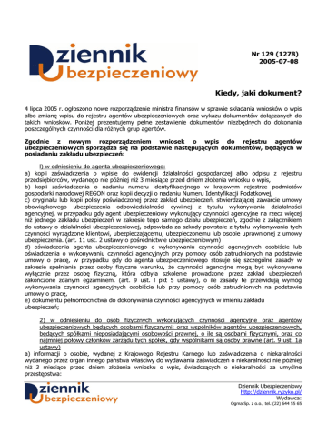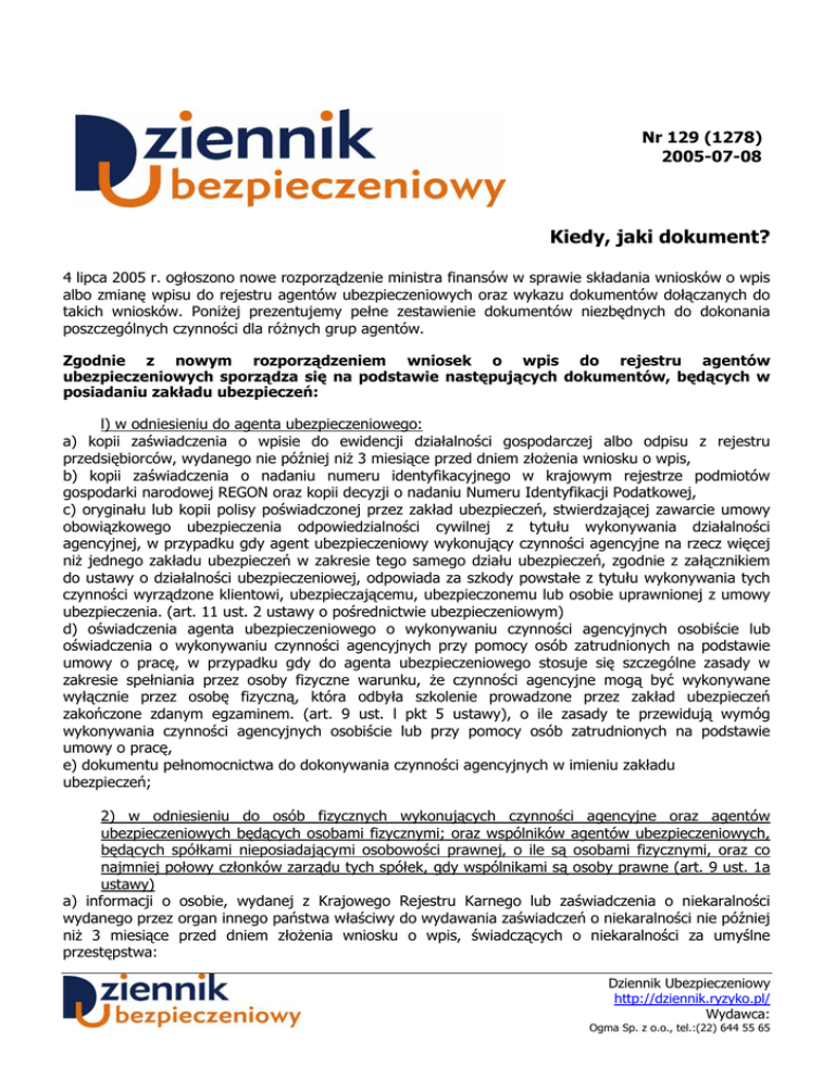 Nr 129 (1278) 2005-07-08 Kiedy, jaki dokument? 4 lipca 2005 r. ogłoszono nowe rozporządzenie ministra finansów w sprawie składania wniosków o wpis albo zmianę wpisu do rejestru agentów ubezpieczeniowych oraz wykazu dokumentów dołączanych do takich wniosków. Poniżej prezentujemy pełne zestawienie dokumentów niezbędnych do dokonania poszczególnych czynności dla różnych grup agentów. Zgodnie z nowym rozporządzeniem wniosek o wpis do rejestru agentów ubezpieczeniowych sporządza się na podstawie następujących dokumentów, będących w posiadaniu zakładu ubezpieczeń: l) w odniesieniu do agenta ubezpieczeniowego: a) kopii zaświadczenia o wpisie do ewidencji działalności gospodarczej albo odpisu z rejestru przedsiębiorców, wydanego nie później niż 3 miesiące przed dniem złożenia wniosku o wpis, b) kopii zaświadczenia o nadaniu numeru identyfikacyjnego w krajowym rejestrze podmiotów gospodarki narodowej REGON oraz kopii decyzji o nadaniu Numeru Identyfikacji Podatkowej, c) oryginału lub kopii polisy poświadczonej przez zakład ubezpieczeń, stwierdzającej zawarcie umowy obowiązkowego ubezpieczenia odpowiedzialności cywilnej z tytułu wykonywania działalności agencyjnej, w przypadku gdy agent ubezpieczeniowy wykonujący czynności agencyjne na rzecz więcej niż jednego zakładu ubezpieczeń w zakresie tego samego działu ubezpieczeń, zgodnie z załącznikiem do ustawy o działalności ubezpieczeniowej, odpowiada za szkody powstałe z tytułu wykonywania tych czynności wyrządzone klientowi, ubezpieczającemu, ubezpieczonemu lub osobie uprawnionej z umowy ubezpieczenia. (art. 11 ust. 2 ustawy o pośrednictwie ubezpieczeniowym) d) oświadczenia agenta ubezpieczeniowego o wykonywaniu czynności agencyjnych osobiście lub oświadczenia o wykonywaniu czynności agencyjnych przy pomocy osób zatrudnionych na podstawie umowy o pracę, w przypadku gdy do agenta ubezpieczeniowego stosuje się szczególne zasady w zakresie spełniania przez osoby fizyczne warunku, że czynności agencyjne mogą być wykonywane wyłącznie przez osobę fizyczną, która odbyła szkolenie prowadzone przez zakład ubezpieczeń zakończone zdanym egzaminem. (art. 9 ust. l pkt 5 ustawy), o ile zasady te przewidują wymóg wykonywania czynności agencyjnych osobiście lub przy pomocy osób zatrudnionych na podstawie umowy o pracę, e) dokumentu pełnomocnictwa do dokonywania czynności agencyjnych w imieniu zakładu ubezpieczeń; 2) w odniesieniu do osób fizycznych wykonujących czynności agencyjne oraz agentów ubezpieczeniowych będących osobami fizycznymi; oraz wspólników agentów ubezpieczeniowych, będących spółkami nieposiadającymi osobowości prawnej, o ile są osobami fizycznymi, oraz co najmniej połowy członków zarządu tych spółek, gdy wspólnikami są osoby prawne (art. 9 ust. 1a ustawy) a) informacji o osobie, wydanej z Krajowego Rejestru Karnego lub zaświadczenia o niekaralności wydanego przez organ innego państwa właściwy do wydawania zaświadczeń o niekaralności nie później niż 3 miesiące przed dniem złożenia wniosku o wpis, świadczących o niekaralności za umyślne przestępstwa: Dziennik Ubezpieczeniowy http://dziennik.ryzyko.pl/ Wydawca: Ogma Sp. z o.o., tel.:(22) 644 55 65 Kiedy, jaki dokument? 2 - przeciwko życiu i zdrowiu, - przeciwko wymiarowi sprawiedliwości, - przeciwko ochronie informacji, - przeciwko wiarygodności dokumentów, - przeciwko mieniu, - przeciwko obrotowi gospodarczemu, - przeciwko obrotowi pieniędzmi i papierami wartościowymi, - skarbowe; (art. 9 ust. 1 pkt 2 ustawy) b) oświadczenia o pełnej zdolności do czynności prawnych, c) kopii świadectwa dojrzałości lub świadectwa ukończenia szkoły dającej wykształcenie średnie lub dyplomu ukończenia szkoły wyższej, d) zaświadczenia o zdaniu egzaminu, e) zaświadczenia o ukończeniu szkolenia przeprowadzonego przez zakład ubezpieczeń. Do wniosku o wpis oraz do wniosku o zmianę wpisu dołącza się następujące dokumenty: 1) oświadczenie zakładu ubezpieczeń stwierdzające, że wniosek o wpis dotyczący agenta ubezpieczeniowego został sporządzony na podstawie niżej wymienionych dokumentów: l) w odniesieniu do agenta ubezpieczeniowego: a) kopii zaświadczenia o wpisie do ewidencji działalności gospodarczej albo odpisu z rejestru przedsiębiorców, wydanego nie później niż 3 miesiące przed dniem złożenia wniosku o wpis, b) kopii zaświadczenia o nadaniu numeru identyfikacyjnego w krajowym rejestrze podmiotów gospodarki narodowej REGON oraz kopii decyzji o nadaniu Numeru Identyfikacji Podatkowej, c) oryginału lub kopii polisy poświadczonej przez zakład ubezpieczeń, stwierdzającej zawarcie umowy obowiązkowego ubezpieczenia odpowiedzialności cywilnej z tytułu wykonywania działalności agencyjnej, w przypadku gdy agent ubezpieczeniowy wykonujący czynności agencyjne na rzecz więcej niż jednego zakładu ubezpieczeń w zakresie tego samego działu ubezpieczeń, zgodnie z załącznikiem do ustawy o działalności ubezpieczeniowej, odpowiada za szkody powstałe z tytułu wykonywania tych czynności wyrządzone klientowi, ubezpieczającemu, ubezpieczonemu lub osobie uprawnionej z umowy ubezpieczenia. (art. 11 ust. 2 ustawy) d) oświadczenia agenta ubezpieczeniowego o wykonywaniu czynności agencyjnych osobiście lub oświadczenia o wykonywaniu czynności agencyjnych przy pomocy osób zatrudnionych na podstawie umowy o pracę, w przypadku gdy do agenta ubezpieczeniowego stosuje się szczególne zasady w zakresie spełniania przez osoby fizyczne warunku, że czynności agencyjne mogą być wykonywane wyłącznie przez osobę fizyczną, która odbyła szkolenie prowadzone przez zakład ubezpieczeń zakończone zdanym egzaminem. (art. 9 ust. l pkt 5 ustawy), o ile zasady te przewidują wymóg wykonywania czynności agencyjnych osobiście lub przy pomocy osób zatrudnionych na podstawie umowy o pracę, e) dokumentu pełnomocnictwa do doko