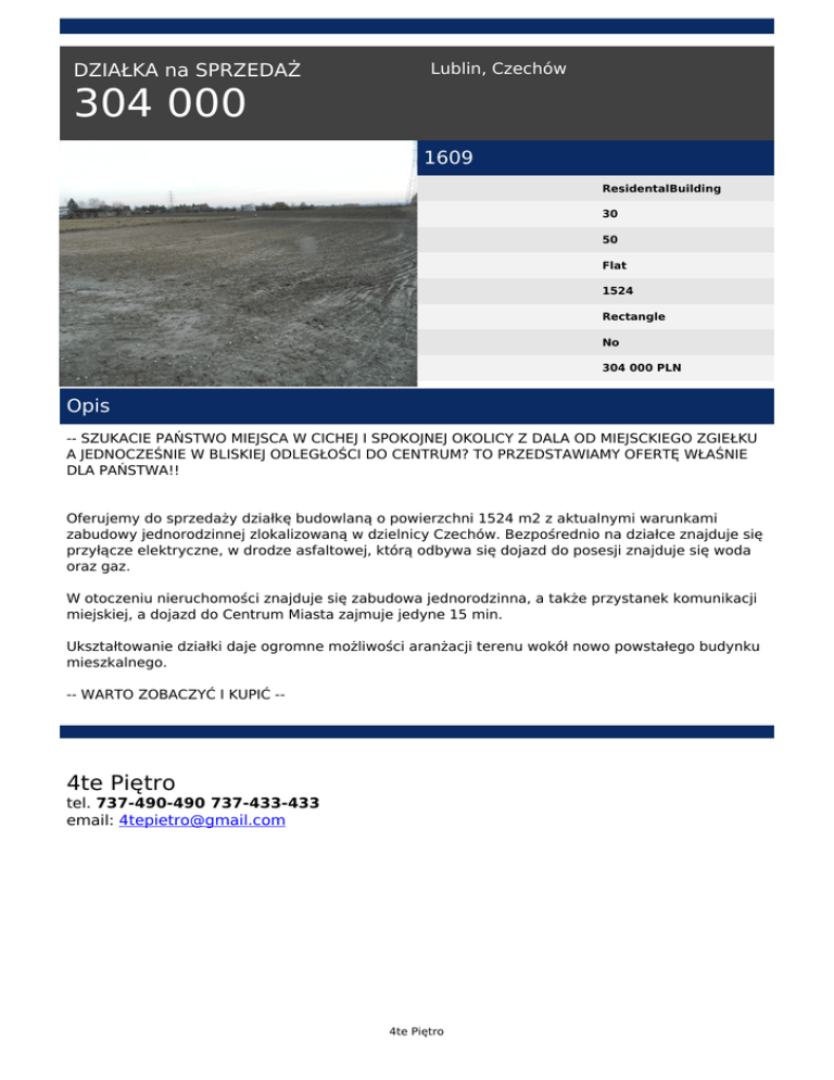 DZIAŁKA na SPRZEDAŻ Lublin, Czechów 304 000 1609 ResidentalBuilding 30 50 Flat 1524 Rectangle No 304 000 PLN Opis -- SZUKACIE PAŃSTWO MIEJSCA W CICHEJ I SPOKOJNEJ OKOLICY Z DALA OD MIEJSCKIEGO ZGIEŁKU A JEDNOCZEŚNIE W BLISKIEJ ODLEGŁOŚCI DO CENTRUM? TO PRZEDSTAWIAMY OFERTĘ WŁAŚNIE DLA PAŃSTWA!! Oferujemy do sprzedaży działkę budowlaną o powierzchni 1524 m2 z aktualnymi warunkami zabudowy jednorodzinnej zlokalizowaną w dzielnicy Czechów. Bezpośrednio na działce znajduje się przyłącze elektryczne, w drodze asfaltowej, którą odbywa się dojazd do posesji znajduje się woda oraz gaz. W otoczeniu nieruchomości znajduje się zabudowa jednorodzinna, a także przystanek komunikacji miejskiej, a dojazd do Centrum Miasta zajmuje jedyne 15 min. Ukształtowanie działki daje ogromne możliwości aranżacji terenu wokół nowo powstałego budynku mieszkalnego. -- WARTO ZOBACZYĆ I KUPIĆ -- 4te Piętro tel. 737-490-490 737-433-433 email: [email protected] 4te Piętro Powered by TCPDF (www.tcpdf.org)
