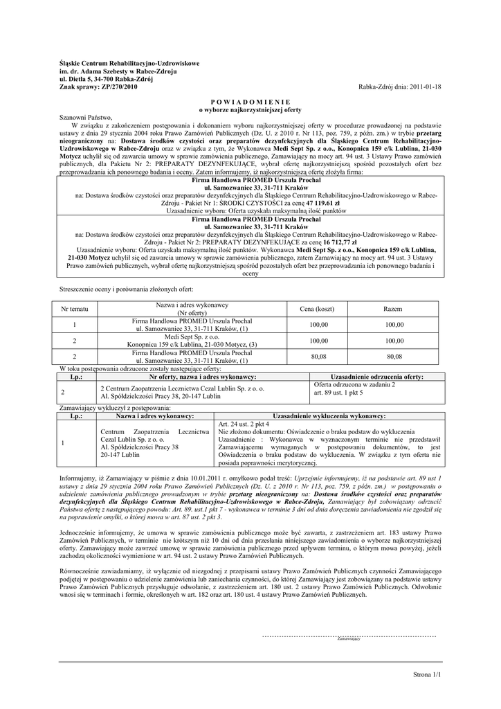 Śląskie Centrum Rehabilitacyjno-Uzdrowiskowe im. dr. Adama Szebesty w Rabce-Zdroju ul. Dietla 5, 34-700 Rabka-Zdrój Znak sprawy: ZP/270/2010 Rabka-Zdrój dnia: 2011-01-18 POWIADOMIENIE o wyborze najkorzystniejszej oferty Szanowni Państwo, W związku z zakończeniem postępowania i dokonaniem wyboru najkorzystniejszej oferty w procedurze prowadzonej na podstawie ustawy z dnia 29 stycznia 2004 roku Prawo Zamówień Publicznych (Dz. U. z 2010 r. Nr 113, poz. 759, z późn. zm.) w trybie przetarg nieograniczony na: Dostawa środków czystości oraz preparatów dezynfekcyjnych dla Śląskiego Centrum RehabilitacyjnoUzdrowiskowego w Rabce-Zdroju oraz w związku z tym, Ŝe Wykonawca Medi Sept Sp. z o.o., Konopnica 159 c/k Lublina, 21-030 Motycz uchylił się od zawarcia umowy w sprawie zamówienia publicznego, Zamawiający na mocy art. 94 ust. 3 Ustawy Prawo zamówień publicznych, dla Pakietu Nr 2: PREPARATY DEZYNFEKUJĄCE, wybrał ofertę najkorzystniejszą spośród pozostałych ofert bez przeprowadzania ich ponownego badania i oceny. Zatem informujemy, iŜ najkorzystniejszą ofertę złoŜyła firma: Firma Handlowa PROMED Urszula Prochal ul. Samozwaniec 33, 31-711 Kraków na: Dostawa środków czystości oraz preparatów dezynfekcyjnych dla Śląskiego Centrum Rehabilitacyjno-Uzdrowiskowego w RabceZdroju - Pakiet Nr 1: ŚRODKI CZYSTOŚCI za cenę 47 119.61 zł Uzasadnienie wyboru: Oferta uzyskała maksymalną ilość punktów Firma Handlowa PROMED Urszula Prochal ul. Samozwaniec 33, 31-711 Kraków na: Dostawa środków czystości oraz preparatów dezynfekcyjnych dla Śląskiego Centrum Rehabilitacyjno-Uzdrowiskowego w RabceZdroju - Pakiet Nr 2: PREPARATY DEZYNFEKUJĄCE za cenę 16 712,77 zł Uzasadnienie wyboru: Oferta uzyskała maksymalną ilość punktów. Wykonawca Medi Sept Sp. z o.o., Konopnica 159 c/k Lublina, 21-030 Motycz uchylił się od zawarcia umowy w sprawie zamówienia publicznego, zatem Zamawiający na mocy art. 94 ust. 3 Ustawy Prawo zamówień publicznych, wybrał ofertę najkorzystniejszą spośród pozostałych ofert bez przeprowadzania ich ponownego badania i oceny Streszczenie oceny i porównania złoŜonych ofert: Nazwa i adres wykonawcy (Nr oferty) Firma Handlowa PROMED Urszula Prochal 1 ul. Samozwaniec 33, 31-711 Kraków, (1) Medi Sept Sp. z o.o. 2 Konopnica 159 c/k Lublina, 21-030 Motycz, (3) Firma Handlowa PROMED Urszula Prochal 2 ul. Samozwaniec 33, 31-711 Kraków, (1) W toku postępowania odrzucone zostały następujące oferty: Lp.: Nr oferty, nazwa i adres wykonawcy: Nr tematu 2 2 Centrum Zaopatrzenia Lecznictwa Cezal Lublin Sp. z o. o. Al. Spółdzielczości Pracy 38, 20-147 Lublin Zamawiający wykluczył z postępowania: Lp.: Nazwa i adres wykonawcy: 1 Centrum Zaopatrzenia Lecznictwa Cezal Lublin Sp. z o. o. Al. Spółdzielczości Pracy 38 20-147 Lublin Cena (koszt) Razem 100,00 100,00 100,00 100,00 80,08 80,08 Uzasadnienie odrzucenia oferty: Oferta odrzucona w zadaniu 2 art. 89 ust. 1 pkt 5 Uzasadnienie wykluczenia wykonawcy: Art. 24 ust. 2 pkt 4 Nie złoŜono dokumentu: Oświadczenie o braku podstaw do wykluczenia Uzasadnienie : Wykonawca w wyznaczonym terminie nie przedstawił Zamawiającemu wymaganych w postępowaniu dokumentów, to jest Oświadczenia o braku podstaw do wykluczenia. W związku z tym oferta nie posiada poprawności merytorycznej. Informujemy, iŜ Zamawiający w piśmie z dnia 10.01.2011 r. omyłkowo podał treść: Uprzejmie informujemy, iŜ na podstawie art. 89 ust 1 ustawy z dnia 29 stycznia 2004 roku Prawo Zamówień Publicznych (Dz. U. z 2010 r. Nr 113, poz. 759, z późn. zm.) w postępowaniu o udzielenie zamówienia publicznego prowadzonym w trybie przetarg nieograniczony na: Dostawa środków czystości oraz preparatów dezynfekcyjnych dla Śląskiego Centrum Rehabilitacyjno-Uzdrowiskowego w Rabce-Zdroju, Zamawiający był zobowiązany odrzucić Państwa ofertę z następującego powodu: Art. 89. ust.1 pkt 7 - wykonawca w terminie 3 dni od dnia doręczenia zawiadomienia nie zgodził się na poprawienie omyłki, o której mowa w art. 87 ust. 2 pkt 3. Jednocześnie informujemy, Ŝe umowa w sprawie zamówienia publicznego moŜe być zawarta, z zastrzeŜeniem art. 183 ustawy Prawo Zamówień Publicznych, w terminie nie krótszym niŜ 10 dni od dnia przesłania niniejszego zawiadomienia o wyborze najkorzystniejszej oferty. Zamawiający moŜe zawrzeć umowę w sprawie zamówienia publicznego przed upływem terminu, o którym mowa powyŜej, jeŜeli zachodzą okoliczności wymienione w art. 94 ust. 2 ustawy Prawo Zamówień Publicznych. Równocześnie zawiadamiamy, iŜ wyłącznie od niezgodnej z przepisami ustawy Prawo Zamówień Publicznych czynności Zamawiającego podjętej w postępowaniu o udzielenie zamówienia lub zaniechania czynności, do której Zamawiający jest zobowiązany na podstawie ustawy Prawo Zamówień Publicznych przysługuje odwołanie, z zastrzeŜeniem art. 180 ust. 2 ustawy Prawo Zamówień Publicznych. Odwołanie wnosi się w terminach i formie, określonych w art. 182 oraz art. 180 ust. 4 ustawy Prawo Zamówień Publicznych. Zamawiający Strona 1/1