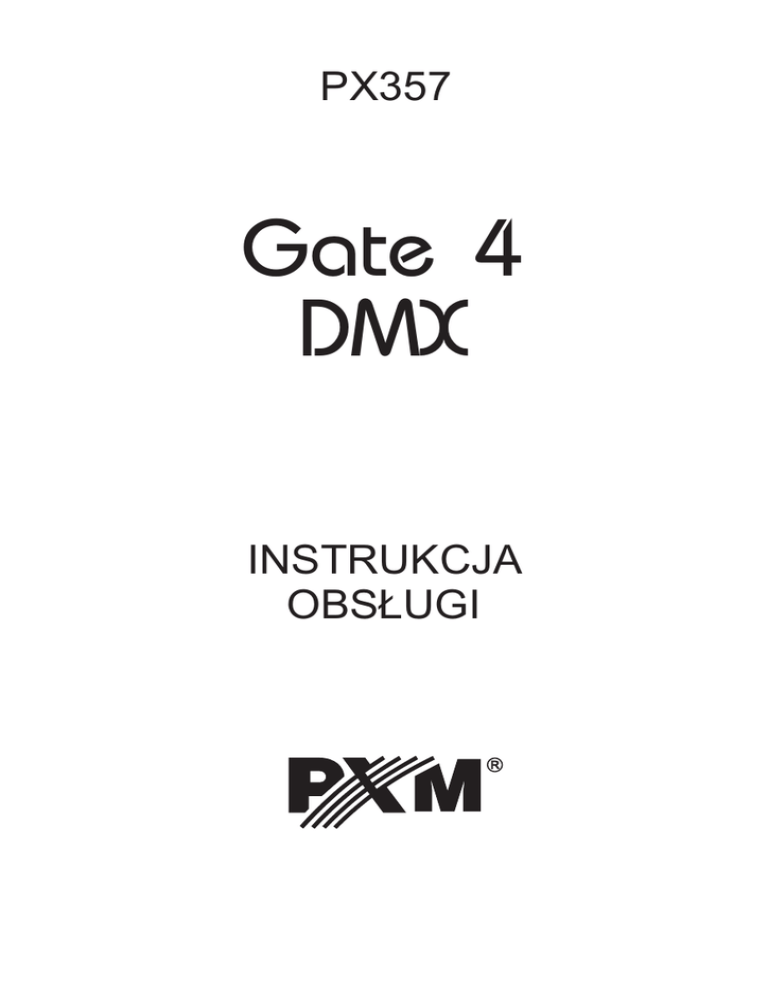 PX357 Gate 4 DMX INSTRUKCJA OBSŁUGI R SPIS TREŚCI 1. Opis ogólny............................................................................................... 3 2. Warunki bezpieczeństwa.......................................................................... 3 3. Opis budowy bramki................................................................................. 4 4. Podstawowe informacje na temat protokołu DMX 512............................. 5 5. Instalacja oprogramowania.......................................................................5 6. Budowa okna aplikacji.............................................................................. 6 7.Konfiguracja urządzenia............................................................................ 6 7.1. Przywracanie ustawień domyślnych.................................................... 7 7.2. Rozwiązywanie problemów z połączeniem.......................................... 7 8. Schemat podłączeń.................................................................................. 8 9. Wymiary.................................................................................................... 9 10. Dane techniczne..................................................................................... 9 Deklaracja zgodności................................................................................... 10 Producent zastrzega sobie możliwość wprowadzania zmian w funkcjonowaniu i obsłudze urządzenia, mających na celu ulepszenie wyrobu. PXM Marek Żupnik spółka komandytowa Podłęże 654 32-003 Podłęże 2 tel.: (12) 626 46 92 fax: (12) 626 46 94 E-mail: [email protected] Internet: www.pxm.pl 1. OPIS OGÓLNY Gate 4 DMX to bramka konwertująca sygnał Art-Net na cztery porty DMX512. W bramce dostępne są tryby scalania sygnałów z dwóch źródeł: HTP i LTP. Wersja protokołu to Art-Net II. Urządzenie zabezpieczone jest solidną metalową obudową chroniącą przed uszkodzeniami mechanicznymi. Porty DMX 512 to złącza XLR, które posiadają optyczną izolację i są odporne na uszkodzenia mechaniczne. Urządzenie wyposażone jest w złącze Ethernet pracujące w standardzie 10/100BaseTX. Ponadto, na urządzeniu znajdują się cztery diody sygnalizujące stan w którym znajduje się urządzenie (tryby pracy). Bramka zasilana jest napięciem z sieci 230V AC. Do urządzenia dołączona jest aplikacja umożliwiająca konfigurację ustawień sieci Ethernet oraz konfigurację parametrów czasowych protokołu DMX takich jak: Brake, MAB, MBF, WAIT oraz ilości transmitowanych kanałów DMX. 2. WARUNKI BEZPIECZEŃSTWA Bramka PX357 jest urządzeniem zasilanym bezpośrednio z sieci energetycznej 230 V, co może grozić porażeniem w wypadku nieprzestrzegania zasad bezpieczeństwa. Należy bezwzględnie stosować się do reguł przedstawionych poniżej: 1. Podłączenie bramki musi być przeprowadzone przez osobę posiadającą odpowiednie uprawnienia, zgodnie z opisem w instrukcji. 2. Gniazdo elektryczne, do którego ma być podłączone urządzenie musi być podłączone do sprawnej instalacji ochronnej (instalacja 3-przewodowa). 3. Należy chronić wszystkie przewody przed uszkodzeniami mechanicznymi i termicznymi. 4. W przypadku uszkodzenia kabla zasilającego zastąpić go kablem o takich samych parametrach technicznych. 5. Nie wolno podłączać do zasilania urządzenia z uszkodzoną (pękniętą) obudową. 6. Wszelkie naprawy wymagające zdjęcia obudowy mogą być wykonywane wyłącznie przy odłączonym zasilaniu. 7. Należy bezwzględnie chronić bramkę przed kontaktem z wodą i innymi płynami. 8. Unikać gwałtownych wstrząsów, a w szczególności upadków. 9. Nie włączać urządzenia w pomieszczeniach o temperaturze poniżej 2oC i powyżej 40oC. 10. Nie włączać urządzenia w pomieszczeniach o wilgotności powyżej 90%. 11. Do czyszczenia używać wyłącznie lekko wilgotnej ściereczki - bramka musi być w tym czasie całkowicie odłączony od zasilania. "Art-Net™ Designed by and Copyright Artistic Licence Holdings Ltd” 3 3. OPIS BUDOWY BRAMKI PX357 wyposażone jest w cztery wejścia DMX, gniazdo sieciowe Ethernet, diody sygnalizacyjne. Diody sygnalizacyjne znajdujące się z przodu bramki informują o stanie urządzenia: - miganie z częstotliwością co 3 sekundy oznacza, że urządzenie jest w stanie bezczynności - miganie z częstotliwością co sekundę (1Hz) - urządzenie jest połączone z programem do konfiguracji parametrów - miganie z częstotliwością 4Hz - dany port wysyła sygnał DMX Przód urządzenia: PUSH PUSH PUSH PUSH diody sygnalizacyjne cztery wejścia DMX gniazdo sieciowe Ethernet Tył urządzenia: wejście kabla zasilania numer katalogowy produktu numer seryjny produktu wyłączanie/włączanie zasilania 4 4. PODSTAWOWE INFORMACJE NA TEMAT PROTOKOŁU DMX512 BREAK - to długość stanu niskiego na linii na początku transmisji pakietu DMX. MAB (Mark After Break) - Długość MAB – odstęp czasowy po Break'u, który występuje w każdym pakiecie według standardu DMX-512. MBF (Mark Between Frames) - Odstęp między ramkami (kanałami) DMX512. MBF oddziela bity stopu jednego kanału od bitu startu następnego. WAIT - odstęp pomiędzy kolejnymi paczkami DMX. Channels nbr - Ilość kanałów, przy pomocy tej funkcji można ograniczyć ilość kanałów wysyłanych przez urządzenie. Minimalna wartość to 24 kanały, a maksymalna to 512 (ustawiona domyślnie). BREAK MAB START CODE M M M B CHANNEL B CHANNEL B CHANNEL 1 2 3 F F F W M A CHANNEL B CHANNEL I 511 512 F T BREAK pełna "paczka" DMX 5. INSTALACJA OPROGRAMOWANIA Oprogramowanie PX357 może być zainstalowane w systemie Windows® XP, VISTA™, Windows® 7 oraz Windows® 8. Procedura instalacji oprogramowania może się różnić w zależności od systemu operacyjnego komputera. System Windows® 7 jest tutaj przedstawiony jako przykład. Instalacja przebiega następująco: 1. Otwórz plik instalacyjny, kliknij [Dalej] aby prze