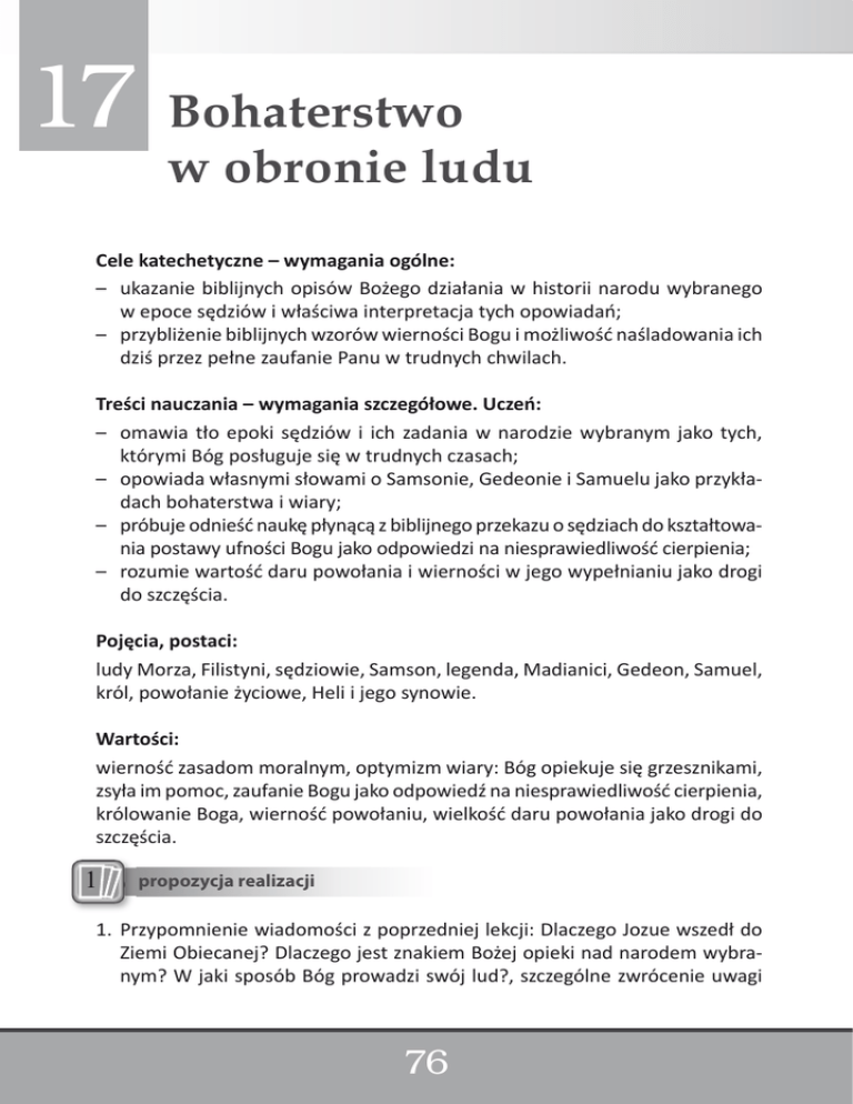 17 Bohaterstwo w obronie ludu Cele katechetyczne – wymagania ogólne: – ukazanie biblijnych opisów Bożego działania w historii narodu wybranego w epoce sędziów i właściwa interpretacja tych opowiadań; – przybliżenie biblijnych wzorów wierności Bogu i możliwość naśladowania ich dziś przez pełne zaufanie Panu w trudnych chwilach. Treści nauczania – wymagania szczegółowe. Uczeń: – omawia tło epoki sędziów i ich zadania w narodzie wybranym jako tych, którymi Bóg posługuje się w trudnych czasach; – opowiada własnymi słowami o Samsonie, Gedeonie i Samuelu jako przykładach bohaterstwa i wiary; – próbuje odnieść naukę płynącą z biblijnego przekazu o sędziach do kształtowania postawy ufności Bogu jako odpowiedzi na niesprawiedliwość cierpienia; – rozumie wartość daru powołania i wierności w jego wypełnianiu jako drogi do szczęścia. Pojęcia, postaci: ludy Morza, Filistyni, sędziowie, Samson, legenda, Madianici, Gedeon, Samuel, król, powołanie życiowe, Heli i jego synowie. Wartości: wierność zasadom moralnym, optymizm wiary: Bóg opiekuje się grzesznikami, zsyła im pomoc, zaufanie Bogu jako odpowiedź na niesprawiedliwość cierpienia, królowanie Boga, wierność powołaniu, wielkość daru powołania jako drogi do szczęścia. propozycja realizacji 1Propozycja realizacji: 1. Przypomnienie wiadomości z poprzedniej lekcji: Dlaczego Jozue wszedł do Ziemi Obiecanej? Dlaczego jest znakiem Bożej opieki nad narodem wybranym? W jaki sposób Bóg prowadzi swój lud?, szczególne zwrócenie uwagi 76 na wyjaśnienie pojęć takich jak: przymierze, prorok, wybranie, miłość (jako fundament przymierza Boga z człowiekiem). 2. Nauczyciel rozpoczyna krótką dyskusję na temat: Czy dzisiaj Bóg się o nas troszczy? Po wypowiedziach uczniów następuje odczytanie listu z podręcznika. 3. Nauczyciel wskazuje uczniom powiązanie pomiędzy pytaniami Izraela (czy Bóg się o nas troszczy, pośród naszych klęsk – historia epoki sędziów), a pytaniami współczesnego człowieka – o obecność Boga w chorobie, cierpieniu, klęskach żywiołowych. 4. Uczniowie na podstawie tekstów z podręcznika przygotowują wraz z nauczycielem krótką notatkę na temat Izrael w epoce sędziów, zawierającą informacje: Kto rządził w epoce sędziów? Kto powoływał władcę? Jakie uprawnienia miał rządzący? Jakie imiona sędziów się zachowały? Dlaczego Izrael zmagał się z tyloma potężnymi wrogami? 5. Na podstawie tekstów z podręcznika uczniowie wraz z nauczycielem opracowują tabelkę, w której umieszczają charakterystyczne cechy każdego z wymienionych w podręczniku sędziów, np.: Gedeon Był wierny przymierzu. Samson Poświęcony od urodzenia Bogu. Samuel Był uczniem kapłana Helego. Buntuje się przeciw Pokonał Filistynów. klęskom, modląc się, pytając Boga o ich przyczynę. Samuel wszystko poświęcił Bogu. Pokonał Madianitów. Samuel pokonał wątpliwości, brak wiary i szczególnie uczy o zaufaniu Bogu. Posiadał ponadludzką siłę. Uczniowie mogą również odnaleźć cechy wspólne tych sędziów, szczególnie te, które mówią o ich zaufaniu Bogu, powołaniu i wyborze (w razie potrzeby nauczyciel ukierunkowuje ich, by dostrzegli te cechy). 6. Notatka do zeszytu: Gdy narodowi wybranemu działa się krzywda, znaczyło to, że Bóg zsyła swojemu narodowi konkretne doświadczenie, jako przywołanie go do porządku. Kiedy rodzice chcą nas ostrzec, robią to samo. Kiedy zaś Izrael pośród tego doświadczenia szukał odpowiedzi i oparcia w Bogu, On powoływał dla swojego ludu sędziów, którzy obdarzeni byli odpowiednimi przymiotami (mądrością, siłą) oraz szczególną pomocą Pana Boga, wyprowadzali naród z opresji i prowadzili do nawrócenia. 77 Inna propozycja realizacji: 123 inna propozycja pracy na lekcji Tło historyczne epoki sędziów domaga się wymienienia ich imion. Nie należy jednak przeciążać pamięci uczniów, poza dokładniej omówionymi: Samsonem, Gedeonem i Samuelem. Istotne jest ukazanie schematu działania Boga w tym okresie (na podstawie podręcznika). Można klasę podzielić na trzy grupy. Każda z grup miałaby za zadanie krótko przedstawić historię życia danej postaci (Samsona, Gedeona, Samuela), a potem odpowiedzieć na pytanie: Jak objawił się Bóg w historii narodu wybranego w czasach sędziów? Na zakończenie (koniecznie na lekcji!) trzeba wyjaśnić, dlaczego Izraelici przez tyle lat nie mieli króla. Ta kwestia jest niezmiernie ważna dla zrozumienia istoty i oryginalności monoteizmu żydowskiego. W klasie zdolniejszej można spróbować sporządzić tabelę ustroju Izraela i jego przekształceń. Ważnym nawiązaniem do liturgii może być uwaga, że określenie Chrystus Król (uroczystość Chrystusa Króla przypada w 2 połowie listopada) ma duże znaczenie dla rozumienia miejsca Boga w życiu człowieka i społeczeństwa wierzącego. W tym kontekście można przypomnieć istotne akty poświęcenia narodu polskiego, np. poświęcenie Sercu Jezusa w obliczu najazdu bolszewików w roku 1920. Modlitwa: do Chrystusa Króla. O Jezu, Królu i Celu serc wszystkich, przez przyjście królestwa Twego obdarz nas pokojem. Panie Jezu, Chryste, Tobie składam hołd jako Królowi wszechświata. Cokolwiek stworzone zostało, dla Ciebie istnieje. Rozporządzaj mną jako własnością swoją. Odnawiam przyrzeczenia dane Ci na chrzcie świętym, wyrzekając się ducha złego, wszelkiej chwały i wszystkich spraw jego. Przyrzekam Ci, że będę żył jako dobry chrześcijanin, a szczególnie zobowiązuję się pomagać do zwycięstwa sprawy Bożej i Kościoła świętego. Boskie Serce Jezusa, przyjmuję dzień dzisiejszy jako dar miłości Twojej. Chcę podjąć stojące przede mną zadania w tej intencji, by wszystkie serca uznały Twoje święte panowanie, by w ten sposób nastało Królestwo Pokoju. O Jezu, Królu mój, do Ciebie chcę należeć w życiu i w wieczności. Amen.