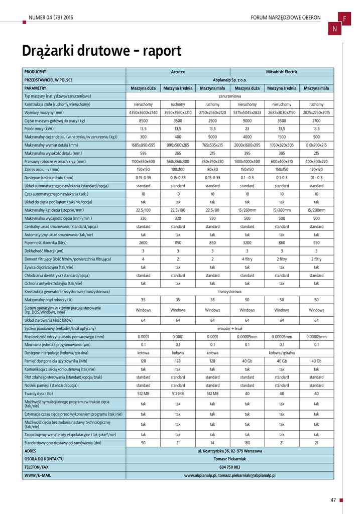 NUMER 04 (79) 2016 FORUM NARZĘDZIOWE OBERON F N Drążarki drutowe - raport PRODUCENT Accutex PRZEDSTAWICIEL W POLSCE Mitsubishi Electric Abplanalp Sp. z o.o. PARAMETRY Maszyna duża Maszyna średnia Maszyna mała nieruchomy ruchomy ruchomy nieruchomy nieruchomy ruchomy 4350x3600x2740 2950x2560x2210 2750x2560x2120 5375x5045x2823 2687x3030x2150 2025x2760x2015 Ciężar maszyny gotowej do pracy (kg) 8500 3500 2500 9000 3500 2700 Pobór mocy (kVA) 13,5 13,5 13,5 23 13,5 13,5 Maksymalny ciężar detalu (w natrysku/w zanurzeniu (kg)) 300 400 5000 4000 1500 500 1685x990x595 990x560x265 765x535x215 2000x1600x395 1050x820x305 810x700x215 595 265 215 395 305 215 1100x650x600 560x360x300 350x250x220 1300x1000x400 600x400x310 400x300x220 120x120 Typ maszyny (natryskowa/zanurzeniowa) Konstrukcja stołu (ruchomy/nieruchomy) Wymiary maszyny (mm) Maksymalny wymiar detalu (mm) Maksymalna wysokość detalu (mm) Przesuwy robocze w osiach x,y,z (mm) Maszyna duża Maszyna średnia Maszyna mała zanurzeniowa Zakres oso u - v (mm) 150x150 100x100 80x80 150x150 150x150 Dostępne średnice drutu (mm) 0.15-0.33 0.15-0.33 0.15-0.33 0.1 - 0.3 0.1-0.3 01 - 0.3 Układ automatycznego nawlekania (standard/opcja) standard standard standard standard standard standard Czas automatycznego nawlekania (sek.) 10 10 10 10 10 10 Układ do cięcia pod kątem (tak/nie/opcja) tak tak tak tak tak tak 22.5/100 22.5/100 22.5/80 15/260mm 15/260mm 15/200mm Maksymalny kąt cięcia (stopnie/mm) Maksymalna wydajność cięcia (mm /min.) 2 Centralny układ smarowania (standard/opcja) Automatyczny układ smarowania (tak/nie) Pojemność zbiornika (litry) 330 330 330 500 500 500 standard standard standard standard standard standard tak tak tak tak tak tak 550 2600 1150 850 3200 860 Dokładność filtracji (µm) 3 3 3 3 3 3 Element filtrujący (ilość filtrów/powierzchnia filtrująca) 4 2 2 4 filtry 2 filtry 2 filtry Żywica dejonizacyjna (tak/nie) tak tak tak tak tak tak standard standard standard standard standard standard tak tak tak tak tak tak 35 35 35 50 50 50 Windows Windows Windows Windows Windows Windows 64 64 64 64 64 64 0.0001 0.0001 0.0001 0.00005mm 0.00005mm 0.00005mm Minimalna jedostka programowania (µm) 0.1 0.1 0.1 0.1 0.1 0.1 Dostępne interpolacje (kołowa/spiralna) kołowa kołowa kołowa Pamięć dostępna dla użytkownika (Mb) 128 128 128 40 Gb 40 Gb 40 Gb Komunikacja z siecią komputerową (tak/nie) tak tak tak tak tak tak Pilot zdalnego sterowania (standard/opcja/brak) standard standard standard standard standard standard Nośniki pamięci (standard/opcja) standard standard standard standard standard standard Twardy dysk (Gb) 512 MB 512 MB 512 MB 40 40 40 Możliwość symulacji innego programu w trakcie cięcia (tak/nie) tak tak tak tak tak tak Estymacja czasu cięcia przed wykonaniem programu (tak/nie) tak tak tak tak tak tak Możliwość cięcia bez zadania nastawy technologicznej (tak/nie) tak tak tak tak tak tak Zaopatrujemy w materiały ekspolatacyjne (tak-jakie?/nie) tak tak tak tak tak tak Standardowy czas dostawy od zamówienia (dni) 90 21 14 180 21 21 Chłodziarka dielektryka (standard/opcja) Ochrona antyelektrolizyjna (tak/nie) Konstrukcja generatora (rezystorowa/tranzystorowa) Maksymalny prąd roboczy (A) System operacyjny w którym pracuje sterowanie (np. DOS, Windows, inne) Układ sterowania (ilość bitów) tranzystorowa System pomiarowy (enkoder/liniał optyczny) Rozdzielczość odczytu układu pomiarowego (mm) ADRES OSOBA DO KONTAKTU enkoder + liniał kołowa/spiralna ul. Kostrzyńska 36, 02-979 Warszawa Tomasz Piekarniak TELEFON/FAX 604 750 083 WWW/E-MAIL www.abplanalp.pl, [email protected] 47 FORUM NARZĘDZIOWE OBERON F NUMER 04 (79) 2016 N Drążarki drutowe - raport PRODUCENT PRZEDSTAWICIEL W POLSCE PARAMETRY GF Machining Solutions GF Machining Solutions sp. z o.o. ROBOCUT C800iB ROBOCUT C600iB ROBOCUT C400iB CUT 400 Sp CUT 300 Sp CUT E 350 Typ maszyny (natryskowa/zanurzeniowa) zanurzeniowa zanurzeniowa zanurzeniowa zanurzeniowa zanurzeniowa zanurzeniowa Konstrukcja stołu (ruchomy/nieruchomy) ruchomy ruchomy ruchomy nieruchomy nieruchomy ruchomy X 2900x3260x2200 2440x2740x2160 1930x2210x1960 2670x2870x2645 2600x2600x2340 2934x1705x2200 4200 3000 1800 8000 4500 3285 13 13 13 11 11 10 3000 [w zanurzeniu] 1000 [w zanurzeniu] 500 [w zanurzeniu] 3000 1500 400 1250x975x300 1050x820x300 700x600x250 1450x900x510 1200x700x400 820x680x250 300 300 [opcja 400] 250 510 400 250 800x600x310 600x400x310 [410] 400x300x255 800x550x510 550x350x400 350x250x250 200x200 200x200 120x120 800x550 550x350 90x90 0,3 - 0,2 0,33 - 0,07 0,3 - 0,1 Wymiary maszyny (mm) Ciężar maszyny gotowej do pracy (kg) Pobór mocy (kVA) Maksymalny ciężar detalu (w natrysku/w zanurzeniu (kg)) Maksymalny wymiar detalu (mm) Maksymalna wysokość detalu (mm) Przesuwy robocze w osiach x,y,z (mm) Zakres oso u - v (mm) Dostępne średnice drutu (mm) 0,1~0,3 0,1~0,3 0,1~0,3 [0,05~0,07 opcja] Układ automatycznego nawlekania (standard/opcja) standard standard standard standard standard standard 10 10 10 20 20 24 Czas automatycznego nawlekania (sek.) Układ do cięcia pod kątem (tak/nie/opcja) tak tak tak tak/opcja tak/opcja tak/opcja ±30°/150 (Opc: ±45°/70) +/- 45°/70 +/- 45°/40 45/550 45/400 30/38 - - - 400 400 300 Centralny układ smarowania (standard/opcja) standard standard standard nie nie tak Automatyczny układ smarowania (tak/nie) standard - - nie nie tak - 910 480 1700 1200 760 2-10 2-10 2-10 5 5 5 2 2 2 2 (opcja 4) 2 (opcja 4) 2 tak tak tak tak tak standard standard standard opcja opcja opcja tak tak tak tak tak tak tranzystorowa tranzystorowa tranzystorowa tranzystorowa tranzystorowa beztranzystorowa - - - - - - Windows Windows Windows Windows Windows Windows 64 64 64 Maksymalny kąt cięcia (stopnie/mm) Maksymalna wydajność cięcia (mm2/min.) Pojemność zbiornika (litry) Dokładność filtracji (µm) Element filtrujący (ilość filtrów/powierzchnia filtrująca) Żywica dejonizacyjna (tak/nie) Chłodziarka dielektryka (stan