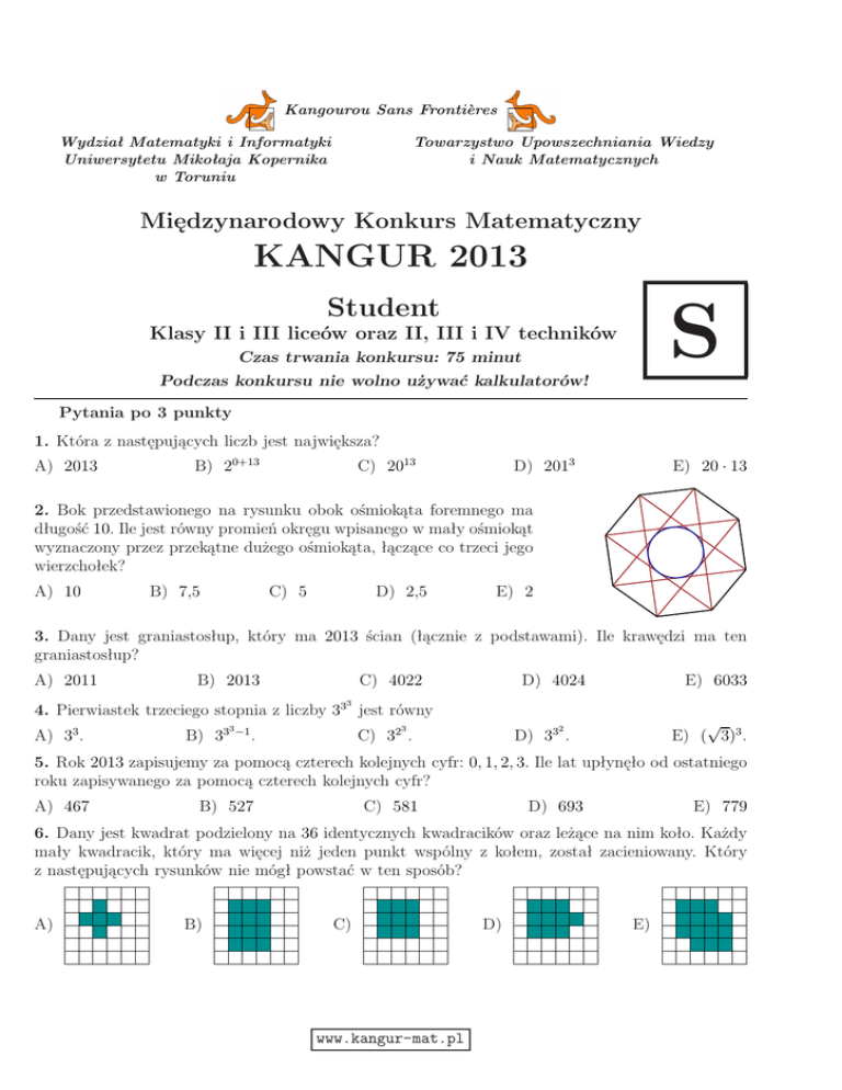Kangourou Sans Frontières Wydział Matematyki i Informatyki Uniwersytetu Mikołaja Kopernika w Toruniu Towarzystwo Upowszechniania Wiedzy i Nauk Matematycznych Międzynarodowy Konkurs Matematyczny KANGUR 2013 Student S Klasy II i III liceów oraz II, III i IV techników Czas trwania konkursu: 75 minut Podczas konkursu nie wolno używać kalkulatorów! Pytania po 3 punkty 1. Która z następujących liczb jest największa? A) 2013 B) 20+13 C) 2013 D) 2013 E) 20 · 13 2. Bok przedstawionego na rysunku obok ośmiokąta foremnego ma długość 10. Ile jest równy promień okręgu wpisanego w mały ośmiokąt wyznaczony przez przekątne dużego ośmiokąta, łączące co trzeci jego wierzchołek? A) 10 B) 7,5 C) 5 D) 2,5 E) 2 3. Dany jest graniastosłup, który ma 2013 ścian (łącznie z podstawami). Ile krawędzi ma ten graniastosłup? A) 2011 B) 2013 C) 4022 D) 4024 E) 6033 3 4. Pierwiastek trzeciego stopnia z liczby 33 jest równy A) 33 . 3 −1 B) 33 3 . √ E) ( 3)3 . 2 C) 32 . D) 33 . 5. Rok 2013 zapisujemy za pomocą czterech kolejnych cyfr: 0, 1, 2, 3. Ile lat upłynęło od ostatniego roku zapisywanego za pomocą czterech kolejnych cyfr? A) 467 B) 527 C) 581 D) 693 E) 779 6. Dany jest kwadrat podzielony na 36 identycznych kwadracików oraz leżące na nim koło. Każdy mały kwadracik, który ma więcej niż jeden punkt wspólny z kołem, został zacieniowany. Który z następujących rysunków nie mógł powstać w ten sposób? A) B) C) www.kangur-mat.pl D) E) www.kangur-mat.pl 7. Niech x ∈ R spełnia warunek 2 < x < 3. Ile z poniższych warunków spełnia x ? 4 < x2 < 9; A) 0 4 < 2x < 9; B) 1 0 < x2 − 2x < 3 6 < 3x < 9; C) 2 D) 3 E) 4 8. Sześciu herosów pojmało 20 łotrów. Pierwszy heros pojmał jednego łotra, drugi dwóch, a trzeci trzech. Czwarty heros pojmał więcej łotrów niż którykolwiek z pozostałych pięciu. Najmniejsza możliwa liczba łotrów pojmanych przez czwartego herosa jest równa A) 7. B) 6. C) 5. D) 4. E) 3. 9. Rysunek obok przedstawia nieprzezroczystą piramidę ABCDS o podstawie kwadratowej ABCD, której wierzchołek S leży w środku krawędzi szkieletu sześcianu. Patrzymy na piramidę z góry, z dołu, z tyłu, z przodu, z lewa i z prawa. Który z następujących rysunków nie przedstawia żadnego z tych widoków? S C A A) B) C) D) B E) 10. Pewna substancja, przechodząc ze stanu stałego w stan ciekły, zwiększa swoją objętość o 1 12 swojej objętości początkowej. O jaką część maleje objętość tej substancji przy przechodzeniu ze stanu ciekłego w stan stały? A) O 1 . B) O 1 . C) O 1 . D) O 1 . E) O 1 . 10 11 12 13 14 Pytania po 4 punkty 11. Remigiusz układa identyczne płytki w kształcie pięciokąta foremnego po obwodzie okręgu, stykając je krawędziami. Na razie ułożył trzy płytki – rysunek obok. Ilu płytek potrzeba, by pokryć w ten sposób cały okrąg? A) 8 B) 9 C) 10 D) 11 E) 12 12. Niech f : R → R będzie funkcją liniową o własności f (2013) − f (2001) = 100. Ile jest równe f (2031) − f (2013) ? A) 75 B) 100 C) 120 D) 150 E) 180 13. Dana jest funkcja f określona na zbiorze liczb całkowitych i o wartościach całkowitych. Gerwazy powiedział o tej funkcji: Dla każdego parzystego x liczba f (x) jest parzysta. Protazy, słysząc to, wygłosił zaprzeczenie tego zdania. Co powiedział Protazy? A) B) C) D) E) Dla każdego parzystego x liczba f (x) jest nieparzysta. Dla każdego nieparzystego x liczba f (x) jest parzysta. Dla każdego nieparzystego x liczba f (x) jest nieparzysta. Istnieje parzyste x, dla którego liczba f (x) jest nieparzysta. Istnieje nieparzyste x, dla którego liczba f (x) jest nieparzysta. www.kangur-mat.pl 14. Ile dodatnich liczb całkowitych n ma tę własność, że zarówno 13 n jak i 3n są trzycyfrowymi liczbami całkowitymi? A) 12 B) 33 C) 34 D) 100 E) 300 15. Dana jest funkcja W (x) = (a − x)(b − x)2 , gdzie a < b. Wykres tej funkcji jest przedstawiony na jednym z poniższych rysunków. Na którym? y y y y y x x x x x A) B) C) D) E) 16. Rozważmy prostokąty, których jeden z boków ma długość 5 i które mają tę własność, że można je podzielić na prostokąt i kwadrat, przy czym któraś z tych figur ma pole równe 4. Ile nieprzystających prostokątów ma tę własność? A) 1 B) 2 C) 3 D) 4 E) 5 4 17. Na rysunku obok przedstawiony jest wykres funkcji f : R → R. Ile rozwiązań ma równanie f (f (f (x))) = 0 ? A) 4 B) 3 C) 2 D) 1 2 x E) 0 −4 −2 B) 89◦ C) 90◦ D) 92◦ 4 C 18. W trójkącie ABC wybrano na boku AB punkty M i N w taki sposób, że |AN| = |AC| oraz |BM| = |BC|. Jaka jest miara kąta ACB, jeżeli |MCN| = 43◦ (rysunek obok)? A) 86◦ y 43◦ E) 94◦ A M NB 19. Ile par dodatnich liczb całkowitych (x, y) spełnia równanie x3 y 3 = 612 ? A) 6 B) 8 C) 10 D) 12 E) Inna liczba. 20. Urna zawiera 900 kul ponumerowanych kolejnymi liczbami naturalnymi od 100 do 999. Onufry wyjmuje losowo kilka kul i dla każdej z nich liczy sumę cyfr zamieszczonej na niej liczby. Jaka jest najmniejsza liczba kul, które Onufry powinien wyjąć, aby mieć pewność, że przynajmniej trzy z wyjętych kul dają tę samą sumę cyfr? A) 51 B) 52 C) 53 D) 54 E) 55 Pytania po 5 punktów 21. Ile istnieje par liczb całkowitych (x, y), takich że x ¬ y oraz xy = 5(x + y) ? A) 4 B) 5 C) 6 D) 7 E) 8 22. Niech f : R → R będzie funkcją spełniającą warunek f (x + 5) = f (x) dla każdego x ∈ R. Jeżeli f (x) = x2 dla x ∈ h−2; 3), to f (2013) jest równe A) 0. B) 1. C) 2. D) 4. E) 9. 23. Suma n początkowych dodatnich liczb całkowitych wyraża się liczbą trzycyfrową o równych cyfrach. Ile jest równa suma cyfr liczby n ? A) 6 B) 9 C) 12 D) 15 E) 18 www.kangur-mat.pl 24. Sześcian ABCDEF GH przecięto płaszczyzną przechodzącą przez trzy wierzchołki sąsiadujące z wierzchołkiem A (tj. połączone krawędzią z punktem A). W taki sam sposób, dla każdego z pozostałych siedmiu wierzchołków, przecięto sześcian płaszczyzną przechodzącą przez tr