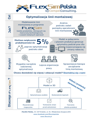Cel Jak? Efekt Korzyści Optymalizacja linii montażowej Modelowanie linii montażowej w programie Analiza podziału zadań pomiędzy operatorami linii montażowej (wiele produktów, różniących się marszrutą technologiczną i czasem kolejnych operacji) Możliwe zwiększenie produktywności do 5% Model w połączeniu z planem produkcji generuje optymalny podział prac dla rozpoczynającej się zmiany roboczej poprzez optymalizację podziału zdań Wygodne narzędzie codziennej optymalizacji Lepsza organizacja pracy Sprawniejsze bieżące zarządzanie linią montażową ? Chcesz dowiedzieć się więcej i zobaczyć model? Skontaktuj się z nami Dlaczego Model w 3D Optymalizacja zasobów Racjonalizacja magazynów Doskonalenie logistyki Testowanie zmian przed wdrożeniem Tworzenie planów produkcji FlexSim Polska, 31-537 Kraków, ul. Ks. Władysława Gurgacza 8/6 www.facebook.com/flexsimpolska www.flexsim.pl