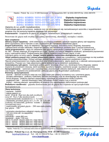 Hepeka - Poland Sp. z o.o. 41-200 Sosnowiec ul. Staropogoñska 35/II tel (032) 2901070 fax (032) 2901079 MeGA MeGA MeGA MeGA Bender Bender Bender Bender VS76-030IT-A1,5/H76 Giêtarka trzpieniowa VS76-030IT-A3/H76 Giêtarka trzpieniowa VS76-030IT-A4/H76 Giêtarka trzpieniowa VS76-030IT-A6/H76 Giêtarka trzpieniowa Giêtarka do rur, profili i ksztaùtowników Technologia giêcia za pomoc¹ owijania rury na obracaj¹cym siê narowkowanym wzorniku z wypeùnieniem wnêtrza rury za pomoc¹ trzpienia giêtkiego lub sztywnego Przeznaczenie - urz¹dzenia do giêcia rur okr¹gùych, kwadratowych, prostok¹tnych i owalnych. Stosowane do giêcia stali zwykùej i specjalnej, nierdzewnej, aluminium, mosi¹dzu i miedzi. Opis urz¹dzenia Gùówny zespóù napêdowy - silnik elektryczny za pomoc¹ przekùadni zêbatych napêdza gùówny waù napêdowy Silnik wyposa¿ony jest w hamulec w celu uzyskiwania jak najwiêkszej dokùadnoœci giêcia. Zespóù hydrauliczny - sùu¿y do wkùadania i wyci¹gania trzpienia, dosuwania formy œlizgowej, dosuwania i zakleszczania szczêki zabieraka. Zespóù ten zasilany jest niezale¿nym silnikiem wraz z pomp¹ hydrauliczn¹ Ukùad programowania – sùu¿y do ustawiania k¹ta giêcia i sprê¿ystoœci z dokùadnoœci¹ do 1º, w zakresie od 0º do 180º. Pamiêã obejmuje 30 programów po 9 giêã. System ma funkcjê ustawiania prêdkoœci, sprawdzania poprawnoœci pracy i wykrywania awarii. Programowane jest cofanie trzpienia przed koñcem giêcia, w celu unikniêcia garbu na koñcu giêcia. Uwaga! Jedyna giêtarka trzpieniowa obsùugiwana po polsku! Ukùad ustalania pozycji rury i zmiany pùaszczyzny giêcia - skùada siê z prowadnicy i zamocowanego na niej suwliwie - uchwytu pneumatycznego. Uchwyt wymaga zewnêtrznego zasilania sprê¿onym powietrzem 6 atm. Rêczne przemieszczanie rury miêdzy giêciami oraz zmiana pùaszczyzny giêcia oparte s¹ o zderzaki zamocowywane na prowadnicy. Pozycje rury i k¹ty pùaszczyzny giêcia widoczne s¹ na czytelnym wyœwietlaczu. Automatyczny cykl giêcia - naciœniêcie pedaùu giêcia powoduje chwyt rury, dociœniêcie formy œlizgowej, wejœcie trzpienia do przestrzeni roboczej, obrót wzornika, wycofanie trzpienia, zwolnienie szczêk i wycofanie wzornika. Oprzyrz¹dowanie - wykonane jest z wysokiej klasy utwardzonych odlewów staliwnych, stali odpornych na œcieranie oraz br¹zów . Zapewnia ono powtarzalnoœã i precyzjê giêcia przy dùugotrwaùym u¿ytkowaniu. Elementy oprzyrz¹dowania: wzornik - element na którym owija siê rura, jego dobór jest zale¿ny od œrednicy rury i promienia giêcia, szczêka zabieraj¹ca - podùu¿ny rowkowany element dociskaj¹cy rurê do obracaj¹cego siê wzornika, forma œlizgowa - podùu¿ny element zapewniaj¹cy równolegùe jej prowadzenie wzdùu¿ trzpienia, wygùadzacz faùd - element likwiduj¹cy faùdy, wchodz¹cy klinem miêdzy rurê a wzornik trzpieñ – walcowy element wprowadzany do wnêtrza rury zapobiegaj¹cy deformacjom podczas giêã Dodatkowe mo¿liwoœci - giêtarka dostosowana jest do giêcia bez trzpienia na oprzyrz¹dowaniu beztrzpieniowym. Dane techniczne -zasilanie - 3x400V -zakres giêtych rur od Ø 10 do Ø 76x2 mm dla stali zwykùych oraz Ø 76x1,5 dla nierdzewnych -gruboœãmœcianki standardowo 1- 3,5 mm -minimalny promieñ giêcia od 1,3 x Ø do 2,5 x Ø (zale¿ny od materiaùu, gruboœci œcianki i œrednicy zewnêtrznej rury) -maksymalny promieñ giêcia – 200 mm-maksymalny k¹t giêcia – 180 º -minimalna standardowa odlegùoœã miêdzy giêciami 120 mm (inne odl. na zapytanie) -wymiary: szerokoœã – okoùo 800 mm wysokoœã – okoùo 1100 mm 030 IT–A1,5/H76 030 IT - A3/H76 030 IT - A4/H76 030 IT - A6/H76 dùugoœã 2250 mm, waga 430 kg dùugoœã 3850 mm, waga 450 kg dùugoœã 4850 mm, waga 470 kg dùugoœã 6850 mm, waga 500 kg Maksymalne zakresy giêcia podano dla materiaùów o wytrzymaùoœci poni¿ej 42 kg/mm² Hepeka - Poland Sp. z o.o. zastrzega sobie prawo do wprowadzania zmian w powy¿szych danych bez uprzedniego informawania o tym. Hepeka - Poland Sp.z o.o. ul. Staropogoñska 35/II 41-200 Sosnowiec [email protected] Tel. +48 32 2901070 Fax: +48 32 2901079 www.hepeka.com Hepeka - Poland Sp. z o.o. 41-200 Sosnowiec ul. Staropogońska 35/II tel (032) 2901070 fax (032) 2901079 MeGA Bender 030IT Giętarka beztrzpieniowa. Giętarka do rur, profili i kształtowników Technologia gięcia za pomocą owijania rury na obracającym się narowkowanym wzorniku Zasilanie fazowe 400 V Zakres średnic rur od Ø 5 mm do Ø 76 x 4 mm Minimalny promień gięcia 2 x Ø – zależny od parametrów rury Maksymalny promień gięcia 380 mm Maksymalny kąt gięcia 180º Programowanie kątów gięcia i sprężystości za pomocą układu mikroprocesorowego Możliwość zaprogramowania 30 programów po 9 gięć w każdym Prędkości gięcia regulowane płynnie do 2,13 obr/min Wizualizacja i kontrola kąta C (kąt gięcia ±1o) Sterowanie przełącznikiem pedałowym lub za pomocą klawiatury Łatwe programowanie mikroprocesora za pomocą lekkodotykowej klawiatury System informowania o przeciążeniu maszyny (maszyna wyłącza się) Wielojęzyczne menu. Uwaga! Menu w języku polskim! Funkcja diagnostyki uszkodzeń Przystosowana do współpracy z pozycjonerem A40/P umożliwiającym ustalanie odległości pomiędzy gięciami oraz zmianę płaszczyzny gięcia Uwaga! Maszyna może być rozbudowana o moduł gięcia trzpieniowego, stając się profesjonalną konwencjonalną giętarką trzpieniową! (do wyboru wersja o długości 1,5 m, 3 m, 4 m, 6 m) Uwaga! Możliwość zamówienia maszyny współpracującej z przystawką do gięcia trójwalcowego (dwie rolki napędowe) pozwalającej na gięcie łagodnych łuków! Szybka wymiana oprzyrządowania – w ciągu 20 sekund możliwa jest wymiana wzornika mocowanego na sześciokątnym wale i formy ślizgowej mocowanej specjalnym zatrzaskiem System hamowania silnika umożliwiający wysoką powtarzalność gięć Nie wymaga po