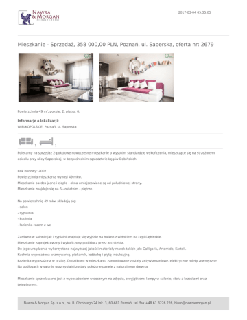 2017-03-04 05:35:05 Mieszkanie - Sprzedaż, 358 000,00 PLN, Poznań, ul. Saperska, oferta nr: 2679 Powierzchnia 49 m2, pokoje: 2, piętro: 6. Informacje o lokalizacji: WIELKOPOLSKIE, Poznań, ul. Saperska 1 1 Polecamy na sprzedaż 2-pokojowe nowoczesne mieszkanie o wysokim standardzie wykończenia, mieszczące się na strzeżonym osiedlu przy ulicy Saperskiej, w bezpośrednim sąsiedztwie Łęgów Dębińskich. Rok budowy: 2007 Powierzchnia mieszkania wynosi 49 mkw. Mieszkanie bardzo jasne i ciepłe - okna umiejscowione są od południowej strony. Mieszkanie znajduje się na 6 - ostatnim - piętrze. Na powierzchnię 49 mkw składają się: - salon - sypialnia - kuchnia - łazienka razem z wc Zarówno w salonie jak i sypialni znajduję się wyjście na balkon z widokiem na Łęgi Dębińskie. Mieszkanie zaprojektowany i wykończony pod klucz przez architekta. Do jego urządzenia wykorzystano najwyższej jakości materiały marek takich jak: Calligaris, Artemide, Kartell. Kuchnia wyposażona w zmywarkę, piekarnik, lodówkę i płytę indukcyjną. Łazienka wyposażona w pralkę. Dodatkowo w mieszkaniu zamontowane zostały antywłamaniowe, elektryczne rolety zewnętrzne. Na podłogach w salonie oraz sypialni zostały położone panele z naturalnego drewna. Mieszkanie sprzedawane jest z wyposażeniem widocznym na zdjęciu, z wyjątkiem: lampy w salonie, stołu z krzesłami oraz telewizorem. Nawra & Morgan Sp. z o.o., os. B. Chrobrego 24 lok. 3, 60-681 Poznań, tel./fax +48 61 8226 226, [email protected] 2017-03-04 05:35:05 Niewątpliwie wyjątkowym atutem mieszkania jest możliwość zakupu lokalu w pełni gotowego do zamieszkania. Od momentu zakupu mieszkania przez obecnych - pierwszych - właścicieli, lokal był praktycznie niezamieszkały, a więc większość rzeczy jest praktycznie nowa. Wysokość czynszu administracyjnego: 415,00 zł (stawka czynszu w okresie zimowym, który uwzględnia ogrzewanie). Cena sprzedaży: 358.000 zł Agent prowadzący: Monika Kotlarek - tel. 665 226 226 Więcej ofert znajdą Państwo na stronie: www.nawramorgan.pl Bezpieczna transakcja tylko z licencjonowanym pośrednikiem. Agent prowadzący: Monika Kotlarek [email protected] +48 665 226 226 Nawra & Morgan Sp. z o.o., os. B. Chrobrego 24 lok. 3, 60-681 Poznań, tel./fax +48 61 8226 226, [email protected]