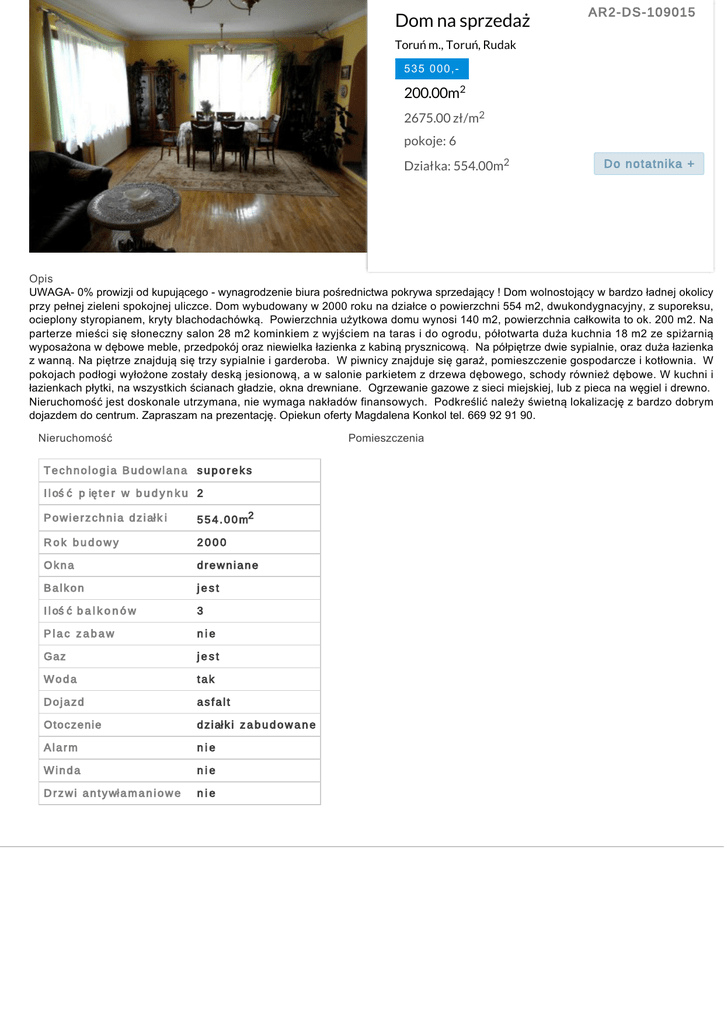 Dom na sprzedaż AR2-DS-109015 Toruń m., Toruń, Rudak 535 000,- 200.00m2 2675.00 zł/m2 pokoje: 6 Działka: 554.00m2 Do notatnika + Opis UWAGA- 0% prowizji od kupującego - wynagrodzenie biura pośrednictwa pokrywa sprzedający ! Dom wolnostojący w bardzo ładnej okolicy przy pełnej zieleni spokojnej uliczce. Dom wybudowany w 2000 roku na działce o powierzchni 554 m2, dwukondygnacyjny, z suporeksu, ocieplony styropianem, kryty blachodachówką. Powierzchnia użytkowa domu wynosi 140 m2, powierzchnia całkowita to ok. 200 m2. Na parterze mieści się słoneczny salon 28 m2 kominkiem z wyjściem na taras i do ogrodu, półotwarta duża kuchnia 18 m2 ze spiżarnią wyposażona w dębowe meble, przedpokój oraz niewielka łazienka z kabiną prysznicową. Na półpiętrze dwie sypialnie, oraz duża łazienka z wanną. Na piętrze znajdują się trzy sypialnie i garderoba. W piwnicy znajduje się garaż, pomieszczenie gospodarcze i kotłownia. W pokojach podłogi wyłożone zostały deską jesionową, a w salonie parkietem z drzewa dębowego, schody również dębowe. W kuchni i łazienkach płytki, na wszystkich ścianach gładzie, okna drewniane. Ogrzewanie gazowe z sieci miejskiej, lub z pieca na węgiel i drewno. Nieruchomość jest doskonale utrzymana, nie wymaga nakładów finansowych. Podkreślić należy świetną lokalizację z bardzo dobrym dojazdem do centrum. Zapraszam na prezentację. Opiekun oferty Magdalena Konkol tel. 669 92 91 90. Nieruchomość Pomieszczenia Technologia Budowlana suporeks I l oś ć p ię t e r w b u d y n k u 2 P o w i e r z c h n i a d z i ał k i 5 5 4 . 0 0 m2 Rok budowy 2000 Okna drewniane Balkon jest I l oś ć b a l k o n ó w 3 Plac zabaw nie Gaz jest Woda tak Dojazd asfalt Otoczenie d z i ał k i z a b u d o w a n e Alarm nie Winda nie D r z w i a n t y wł a m a n i o w e nie
