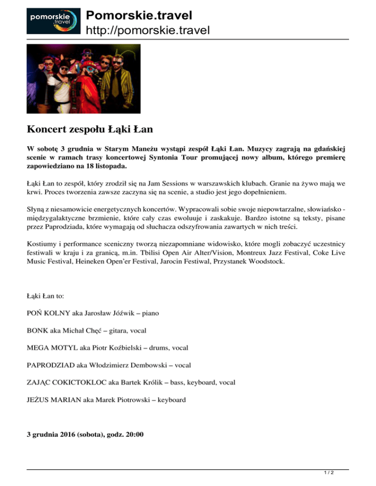 Pomorskie.travel http://pomorskie.travel Koncert zespołu Łąki Łan W sobotę 3 grudnia w Starym Maneżu wystąpi zespół Łąki Łan. Muzycy zagrają na gdańskiej scenie w ramach trasy koncertowej Syntonia Tour promującej nowy album, którego premierę zapowiedziano na 18 listopada. Łąki Łan to zespół, który zrodził się na Jam Sessions w warszawskich klubach. Granie na żywo mają we krwi. Proces tworzenia zawsze zaczyna się na scenie, a studio jest jego dopełnieniem. Słyną z niesamowicie energetycznych koncertów. Wypracowali sobie swoje niepowtarzalne, słowiańsko międzygalaktyczne brzmienie, które cały czas ewoluuje i zaskakuje. Bardzo istotne są teksty, pisane przez Paprodziada, które wymagają od słuchacza odszyfrowania zawartych w nich treści. Kostiumy i performance sceniczny tworzą niezapomniane widowisko, które mogli zobaczyć uczestnicy festiwali w kraju i za granicą, m.in. Tbilisi Open Air Alter/Vision, Montreux Jazz Festival, Coke Live Music Festival, Heineken Open’er Festival, Jarocin Festiwal, Przystanek Woodstock. Łąki Łan to: POŃ KOLNY aka Jarosław Jóźwik – piano BONK aka Michał Chęć – gitara, vocal MEGA MOTYL aka Piotr Koźbielski – drums, vocal PAPRODZIAD aka Włodzimierz Dembowski – vocal ZAJĄC COKICTOKLOC aka Bartek Królik – bass, keyboard, vocal JEŻUS MARIAN aka Marek Piotrowski – keyboard 3 grudnia 2016 (sobota), godz. 20:00 1/2 Pomorskie.travel http://pomorskie.travel STARY MANEŻ, ul. Słowackiego 23, Gdańsk Garnizon BILETY: do nabycia online na www.starymanez.pl oraz w kasie Starego Maneżu. Serdecznie zapraszamy! Karolina Kromp 2/2 Powered by TCPDF (www.tcpdf.org)