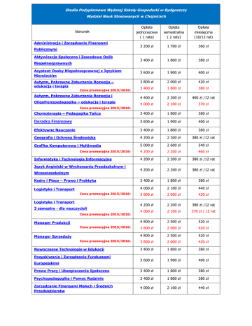 Studia Podyplomowe Wyższej Szkoły Gospodarki w Bydgoszczy Wydział Nauk Stosowanych w Chojnicach Opłata jednorazowa ( 1 rata) Opłata semestralna ( 2 raty) Opłata miesięczna (10/12 rat) 3 200 zł 1 700 zł 360 zł 3 400 zł 1 800 zł 380 zł Asystent Osoby Niepełnosprawnej z Językiem Niemieckim 3 600 zł 1 900 zł 400 zł Autyzm, Pokrewne Zaburzenia Rozwoju – edukacja i terapia 3 800 zł 2 000 zł 420 zł 3 400 zł 1 800 zł 380 zł 4 400 zł 2 300 zł 400 zł /12 rat 4 000 zł 2 100 zł 370 zł Choreoterapia – Pedagogika Tańca 3 400 zł 1 800 zł 380 zł Doradca Finansowy 3 600 zł 1 900 zł 400 zł Efektywne Nauczanie 3 400 zł 1 800 zł 380 zł Geografia i Ochrona Środowiska 4 200 zł 2 200 zł 380 zł /12 rat Grafika Komputerowa i Multimedia 5 000 zł 2 600 zł 540 zł 4 200 zł 2 200 zł 460 zł 4 200 zł 2 200 zł 380 zł /12 rat 4 200 zł 2 200 zł 380 zł /12 rat Kadry i Płace – Prawo i Praktyka 3 400 zł 1 800 zł 380 zł Logistyka i Transport 4 000 zł 2 100 zł 440 zł 3 800 zł 2 000 zł 420 zł 4 200 zł 2 200 zł 380 zł /12 rat 4 000 zł 2 100 zł 370 zł / 12 rat 4 800 zł 2 500 zł 520 zł 3 800 zł 2 000 zł 420 zł 4 800 zł 2 500 zł 520 zł 3 800 zł 2 000 zł 420 zł 3 400 zł 1 800 zł 380 zł 3 600 zł 1 900 zł 400 zł Prawo Pracy i Ubezpieczenia Społeczne 3 400 zł 1 800 zł 380 zł Psychopedagogika i Pomoc Rodzinie 3 400 zł 1 800 zł 380 zł Zarządzanie Finansami Małych i Średnich Przedsiębiorstw 4 000 zł 2 100 zł 440 zł kierunek Administracja i Zarządzanie Finansami Publicznymi Aktywizacja Społeczna i Zawodowa Osób Niepełnosprawnych Cena promocyjna 2015/2016: Autyzm, Pokrewne Zaburzenia Rozwoju i Oligofrenopedagogika – edukacja i terapia Cena promocyjna 2015/2016: Cena promocyjna 2015/2016: Informatyka i Technologia Informacyjna Język Angielski w Wychowaniu Przedszkolnym i Wczesnoszkolnym Cena promocyjna 2015/2016: Logistyka i Transport 3 semestry - dla nauczycieli Cena promocyjna 2015/2016: Manager Produkcji Cena promocyjna 2015/2016: Manager Sprzedaży Cena promocyjna 2015/2016: Nowoczesne Technologie w Edukacji Pozyskiwanie i Zarządzanie Funduszami Europejskimi