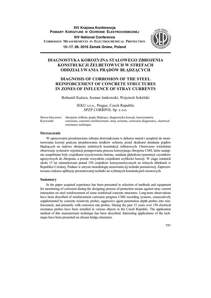 XIV Krajowa Konferencja POMIARY KOROZYJNE W OCHRONIE ELEKTROCHEMICZNEJ XIV National Conference CORROSION MEASUREMENTS IN ELECTROCHEMICAL PROTECTION 15–17. 06. 2016 Zamek Gniew, Poland DIAGNOSTYKA KOROZYJNA STALOWEGO ZBROJENIA KONSTRUKCJI ŻELBETOWYCH W STREFACH ODDZIAŁYWANIA PRĄDÓW BŁĄDZĄCYCH DIAGNOSIS OF CORROSION OF THE STEEL REINFORCEMENT OF CONCRETE STRUCTURES IN ZONES OF INFLUENCE OF STRAY CURRENTS Bohumil Kučera, Jezmar Jankowski, Wojciech Sokólski JEKU s.r.o., Prague, Czech Republic SPZP CORRPOL Sp. z o.o. Słowa kluczowe: Keywords: zbrojenie żelbetu, prądy błądzące, diagnostyka korozji, korozymetria corrosion, concrete reinforcement, stray currents, corrosion diagnostics, electrical resistance technique Streszczenie W opracowaniu przedstawiono zebrane doświadczenia w doborze metod i urządzeń do monitorowania korozji podczas projektowania środków ochrony przed skutkami działania prądów błądzących na stalowe zbrojenie niektórych konstrukcji żelbetowych. Omówiono wieloletnie obserwacje systemów rejestracji postępowania procesu korozyjnego zbrojenia CMS, które następnie uzupełniane były czujnikami rezystywności betonu, sondami głębokości penetracji czynników agresywnych do zbrojenia, a przede wszystkim czujnikami szybkości korozji. W ciągu ostatnich około 15 lat zainstalowano ponad 150 czujników korozymetrycznych na różnych obiektach w Republice Czeskiej. Podano w zarysie metodologię stosowania tej techniki pomiarowej. Zaprezentowano ciekawe aplikacje prezentowanej techniki na wybranych konstrukcjach mostowych. Summary In the paper acquired experience has been presented in selection of methods and equipment for monitoring of corrosion during the designing process of protection means against stray current interaction on steel reinforcement of some reinforced concrete structures. Long-term observations have been described of reinforcement corrosion progress CMS recording systems, consecutively supplemented by concrete resistivity probes, aggressive agent penetration depth probes into reinforcement, and primarily with corrosion rate probes. During the past 15 years over 150 electrical resistance probes have been installed in various objects in the Czech Republic. The application method of this measurement technique has been described. Interesting applications of the technique have been presented on chosen bridge structures. 151 1. Wstęp Wykazywanie korozyjnego zagrożenia betonowych konstrukcji, w szczególności w odniesieniu do oddziaływania prądów błądzących oraz ochrona przed działaniem prądów błądzących jest dość trudnym zagadnieniem, którym zajmują się laboratoria korozyjne od dziesięcioleci. W Czechach i na Słowacji od 1995 roku stopniowo wprowadzano korozyjną diagnostykę zbrojenia przy wykorzystaniu metod nieniszczących. Metodyka niedestrukcyjnej diagnostyki korozyjnej zbrojenia została wprowadzona dla obiektów mostowych i konstrukcji tunelowych poprzez zatwierdzenie odpowiednich przepisów resortowych, dotyczących propozycji rozwiązań ograniczających skutki działania prądów błądzących na obiekty będące w kompetencji Ministerstwa Transportu Republiki Czeskiej, Czeskich Kolei Państwowych, Ministerstwa Transportu Republiki Słowackiej i Słowackich Kolei Państwowych. Przepisy ustalają warunki, kiedy należy stosować urządzenia, które umożliwiają w okresie eksploatacji budowli przeprowadzenie pomiarów kontrolnych oraz ewentualnych pomiarów na elementach diagnostycznych pozwalających na śledzenie korozji stalowego zbrojenia. Stałe urządzenia z zasady instaluje się w specjalnych przypadkach, kiedy mostowe lub tunelowe konstrukcje (w wyjątkowych przypadkach również budowle nadziemne) znajdują się w bliskim kontakcie ze źródłem prądów błądzących lub w zasięgu znacznego wpływu prądów błądzących. Można jednak zastosować je także dla budowli, na przykład w sytuacji wystawienia na ekstremalną korozję chemiczną (zasolenie itp.). 2. Wykorzystywane przepisy Obecnie w odniesieniu do mierzenia oddziaływania prądów błądzących na konstrukcje żelbetonowe wykorzystuje się normy ČSN 03 83xx, a przede wszystkim ČSN EN 50 162, gdzie załącznik narodowy odsyła do przepisów resortowych, a więc TP 124 MD ČR (2009) oraz SR5/7 SŽDC (2011). Na Słowacji zostały wprowadzone w życie podobne przepisy. Chodzi o warunki techniczne TP 03/2014 MD SR oraz przepisy dla słowackich kolei ŽSR TS15 (2011). Metodyka pomiaru oddziaływania prądów błądzących obecnie stanowi przepis wdrażający oba wyżej wymienione przepisy MD ČR oraz SŽDC (wcześniej ČD), tj. warunki techniczne TP 124 i instrukcję służbową SR 5/7(S). Metodyczne wskazówki dotyczące oddziaływania prądów błądzących nawiązują do przytoczonych przepisów. 3. Cel stałego monitorowania oddziaływania prądów błądzących Pierwsze doświadczenia dotyczące instalacji stałego podłączenia metalicznego do celów pomiarowych do zbrojenia na obiektach mostowych pochodzi z 70-tych i 80-tych lat ubiegłego stulecia. W budowlach tunelowych pierwsze trwałe podłączenia przewodów pomiarowych do zbrojenia konstrukcji żelbetowych były instalowane pod koniec lat dziewięćdziesiątych, tak samo jak w przypadku budowli naziemnych. Należy zaznaczyć, że „stałe podłączenia” nie były trwałe. Od samego początku nie są do tych instalacji przekonani ani zarządcy budów, ani inwestorzy. Ten, kto te instalacje projektuje, od samego początku powinien interesować się tym, jak będą wykorzystywane, jakie mają znaczenie z punktu widzenia konserwacji i eksploatacji budowli, w której są instalowane. Zarządcy zazwyczaj uważają podłączenia za coś zbytecznego, co jedynie podnosi koszt budowy i kusi złodziei. Na kolei panuje przekonanie, że stałe podłączenia są sugerowane jedy152 nie z powodu lenistwa jednostek specjalistycznych – aby technicy odpowiedzialni za korozję nie musieli s