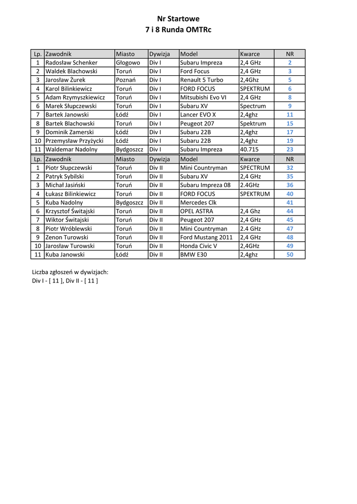 Nr Startowe 7 i 8 Runda OMTRc Lp. 1 2 3 4 5 6 7 8 9 10 11 Lp. 1 2 3 4 5 6 7 8 9 10 11 Zawodnik Radosław Schenker Waldek Blachowski Jarosław Żurek Karol Bilinkiewicz Adam Rzymyszkiewicz Marek Słupczewski Bartek Janowski Bartek Blachowski Dominik Zamerski Przemysław Przyżycki Waldemar Nadolny Zawodnik Piotr Słupczewski Patryk Sybilski Michał Jasiński Łukasz Bilinkiewicz Kuba Nadolny Krzysztof Świtajski Wiktor Świtajski Piotr Wróblewski Zenon Turowski Jarosław Turowski Kuba Janowski Liczba zgłoszeń w dywizjach: Div I - [ 11 ], Div II - [ 11 ] Miasto Głogowo Toruń Poznań Toruń Toruń Toruń Łódź Toruń Łódź Łódź Bydgoszcz Miasto Toruń Toruń Toruń Toruń Bydgoszcz Toruń Toruń Toruń Toruń Toruń Łódź Dywizja Div I Div I Div I Div I Div I Div I Div I Div I Div I Div I Div I Dywizja Div II Div II Div II Div II Div II Div II Div II Div II Div II Div II Div II Model Subaru Impreza Ford Focus Renault 5 Turbo FORD FOCUS Mitsubishi Evo VI Subaru XV Lancer EVO X Peugeot 207 Subaru 22B Subaru 22B Subaru Impreza Model Mini Countryman Subaru XV Subaru Impreza 08 FORD FOCUS Mercedes Clk OPEL ASTRA Peugeot 207 Mini Countryman Ford Mustang 2011 Honda Civic V BMW E30 Kwarce 2,4 GHz 2,4 GHz 2,4Ghz SPEKTRUM 2,4 GHz Spectrum 2,4ghz Spektrum 2,4ghz 2,4ghz 40.715 Kwarce SPECTRUM 2,4 GHz 2.4GHz SPEKTRUM 2,4 Ghz 2,4 GHz 2.4 GHz 2,4 GHz 2,4GHz 2,4ghz NR 2 3 5 6 8 9 11 15 17 19 23 NR 32 35 36 40 41 44 45 47 48 49 50