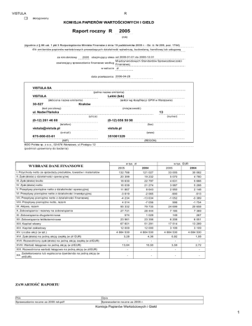 VISTULA R skorygowany KOMISJA PAPIERÓW WARTOŚCIOWYCH I GIEŁD Raport roczny R 2005 (rok) dla emitentów papierów wartośc iowyc h prowadząc yc h działalność wytwórc zą, budowlaną, handlową lub usługową 2005 obejmując y okres od 2005-01-01 do 2005-12-31 za rok obrotowy zawierając y sprawozdanie finansowe według Międzynarodowyc h Standardów Sprawozdawc zośc i Finansowej w waluc ie zł data przekazania: 2006-04-28 VISTULA SA (pełna nazwa emitenta) VISTULA Lekki (lek) (skróc ona nazwa emitenta) 30-527 (sektor wg klasyfikac ji GPW w Warszawie) Kraków (kod poc ztowy) (miejsc owość ) ul. Nadwi?lańska 13 (ulic a) (numer) (0-12) 261 46 00 (0-12) 656 50 98 (telefon) (fax) [email protected] vistula.pl (e-mail) (www) 675-000-03-61 351001329 (NIP) (REGON) BDO Polska sp. z o.o., 02-676 Warszawa, ul.Postępu 12 (podmiot uprawniony do badania) w tys. zł WYBRANE DANE FINANSOWE w tys. EUR 2005 2004 132 788 121 027 33 005 30 082 II. Zysk (strata) z działalnośc i operac yjnej 20 399 19 232 5 070 4 780 III. Zysk (strata) brutto 18 630 22 797 4 631 5 666 IV. Zysk (strata) netto 16 039 21 274 3 987 5 288 V. Przepływy pieniężne netto z działalnośc i operac yjnej 11 867 8 643 2 950 2 148 VI. Przepływy pieniężne netto z działalnośc i inwestyc yjnej -3 619 -2 065 -900 -513 VII. Przepływy pieniężne netto z działalnośc i finansowej -4 234 -13 634 -1 052 -3 389 I. Przyc hody netto ze sprzedaży produktów, towarów i materiałów VIII. Przepływy pieniężne netto, razem 2005 2004 4 014 -7 056 998 -1 754 IX. Aktywa, razem 95 332 79 735 24 699 20 658 X. Zobowiązania i rezerwy na zobowiązania 7 369 27 731 28 444 7 185 XI. Zobowiązania długoterminowe 574 1 029 149 267 XII. Zobowiązania krótkoterminowe 23 961 23 356 6 208 6 051 XIII. Kapitał własny 67 601 51 291 17 514 13 289 XIV. Kapitał zakładowy 12 000 12 000 3 109 3 109 4 884 530 4 884 530 4 884 530 4 884 530 3,28 4,36 0,82 1,08 XV. Lic zba akc ji (w szt.) XVI. Zysk (strata) na jedną akc ję zwykłą (w zł/ EUR) XVII. Rozwodniony zysk (strata) na jedną akc ję zwykłą (w zł/EUR) - XVIII. Wartość księgowa na jedną akc ję (w zł/EUR) 13,84 10,50 3,59 2,72 XIX. Rozwodniona wartość księgowa na jedną akc ję (w zł/EUR) - - - - Zadeklarowana lub wypłac ona dywidenda na jedną akc ję (w XX. zł/EUR) - - - - ZAWARTOŚĆ RAPORTU Plik Opis Sprawozdanie roc zne za 2005 rok.pdf Sprawozdanie roc zne za 2005 r. Komisja Papierów Wartościowych i Giełd 1 VISTULA R PODPISY WSZYSTKICH CZŁONKÓW ZARZĄDU Data Imię i Nazwisko Stanowisko/Funkc ja 2006-04-28 Rafał Bauer Prezes Zarządu 2006-04-28 Mic hał Wójc ik Wic eprezes Zarządu 2006-04-28 Miec zysław Starek Członek Zarządu 2006-04-28 Mateusz Żmijewski Członek Zarządu Podpis Komisja Papierów Wartościowych i Giełd 2 List Zarządu Vistula S.A. do Akcjonariuszy Szanowni Państwo Rok 2005 upłynął pod znakiem umacniania kompetencji Vistuli S.A. w zarządzaniu posiadanymi markami, w kreowaniu ich nowego wizerunku oraz w rozwoju dystrybucji z wykorzystaniem sieci własnych sklepów firmowych. Tak jak w latach poprzednich, proces przekształcania Vistuli S.A. z przemysłowego producenta odzieży męskiej w firmę o profilu marketingowo – handlowym, był stopniowo i konsekwentnie realizowany. Ostatecznym jego rezultatem ma być stworzenie nowoczesnej, europejskiej firmy, obecnej w różnych segmentach rynku mody i posiadającej silne marki, które gwarantują określoną jakość oraz styl. Wyznaczone przez zarząd średnioterminowe cele strategiczne Spółki obejmują: 1) zdobycie pozycji głównego operatora w handlu detalicznym odzieżą męską na rynku polskim, 2) zbudowanie międzynarodowej marki Vistula o zasięgu europejskim, 3) uzyskanie przychodów ze sprzedaży detalicznej na rynkach zagranicznych na poziomie przychodów uzyskiwanych z rynku polskiego. Podstawowym narzędziem realizacji tak zdefiniowanych celów strategicznych będzie dalsza systematyczna rozbudowa własnej sieci detalicznej oraz doskonalenie jej efektywności w zakresie wzrostu sprzedaży. W całym roku 2005 w grupie kapitałowej Vistula S.A. otwartych zostało 25 nowych sklepów firmowych, dzięki czemu ich liczba wzrosła do 68 placówek (łącznie ze stoiskami typu shop in shop). Wśród nich pojawiły się także pierwsze, zarządzane bezpośrednio przez Spółkę, zagraniczne sklepy firmowe w Czechach i na Łotwie. Zgodnie z przyjętymi założeniami, własna sieć sprzedaży detalicznej, będzie dalej rozwijana na rynkach Polski i krajów ościennych. Oprócz Czech i Łotwy kolejne sklepy marki Vistula będą otwierane na Litwie, Słowacji, Węgrzech i Ukrainie. W dalszej przyszłości, w kręgu naszych zainteresowań znajdzie się rynek niemiecki i rosyjski. W roku 2006 zależny kanał dystrybucji oparty na asortymencie marek Vistula oraz Lantier będzie generować blisko 100 mln zł przychodów (wobec około 62 mln zł w roku 2005). Skoncentrowanie się na zarządzaniu markami oraz siecią dystrybucji przełożyło się także na rozpoczęcie współpracy z markami międzynarodowymi. W roku 2005 Vistula S.A. zawarła dwie umowy z firmą Sixty Active S.p.A. dające jej pozycję wyłącznego dystrybutora włoskiej marki Murphy&Nye na terenie Polski, Czech, Słowacji i Węgier. Pod marką Murphy&Nye oferowany jest pełen asortyment odzieży damskiej i męskiej typu city sport i active, komplementarnej stylistycznie w stosunku do oferty marek Vistula i Lantier. W handlu hurtowym podstawę oferty Spółki w roku 2005 stanowiła nowa tańsza marka Luigi Vesari. Wyroby marki Luigi Vesari, skierowane do kontrahentów niezależnych na rynku krajowym, będą w tym kanale dystrybucji zastępować stopniowo wyroby marki Vistula, których sprzedaż skupiona zostanie w sieci sklepów własnych. Oferta marki Luigi Vesari została przygotowana specjalnie dla kontrahentów hurtowych, sprzedających w swoich sklepach odzież różnych producentów i poszukujących wyrobów tańszych le