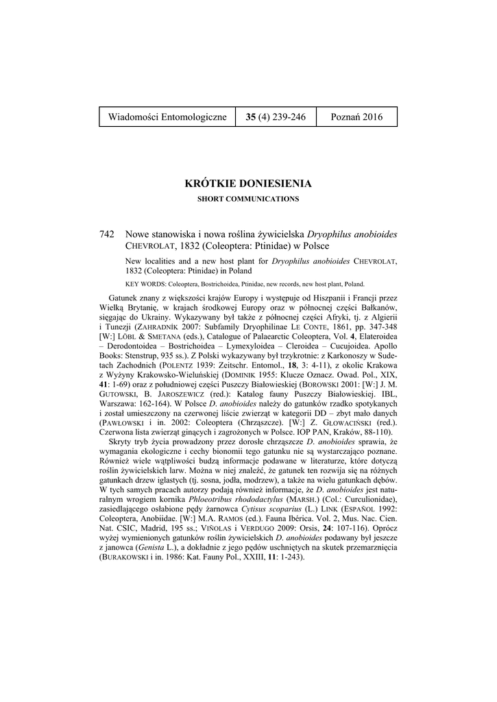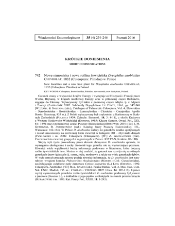 Wiadomości Entomologiczne 35 (4) 239-246 Poznań 2016 KRÓTKIE DONIESIENIA SHORT COMMUNICATIONS 742 Nowe stanowiska i nowa roślina żywicielska Dryophilus anobioides CHEVROLAT, 1832 (Coleoptera: Ptinidae) w Polsce New localities and a new host plant for Dryophilus anobioides CHEVROLAT, 1832 (Coleoptera: Ptinidae) in Poland KEY WORDS: Coleoptera, Bostrichoidea, Ptinidae, new records, new host plant, Poland. Gatunek znany z większości krajów Europy i występuje od Hiszpanii i Francji przez Wielką Brytanię, w krajach środkowej Europy oraz w północnej części Bałkanów, sięgając do Ukrainy. Wykazywany był także z północnej części Afryki, tj. z Algierii i Tunezji (ZAHRADNÍK 2007: Subfamily Dryophilinae LE CONTE, 1861, pp. 347-348 [W:] LÖBL & SMETANA (eds.), Catalogue of Palaearctic Coleoptera, Vol. 4, Elateroidea – Derodontoidea – Bostrichoidea – Lymexyloidea – Cleroidea – Cucujoidea. Apollo Books: Stenstrup, 935 ss.). Z Polski wykazywany był trzykrotnie: z Karkonoszy w Sudetach Zachodnich (POLENTZ 1939: Zeitschr. Entomol., 18, 3: 4-11), z okolic Krakowa z Wyżyny Krakowsko-Wieluńskiej (DOMINIK 1955: Klucze Oznacz. Owad. Pol., XIX, 41: 1-69) oraz z południowej części Puszczy Białowieskiej (BOROWSKI 2001: [W:] J. M. GUTOWSKI, B. JAROSZEWICZ (red.): Katalog fauny Puszczy Białowieskiej. IBL, Warszawa: 162-164). W Polsce D. anobioides należy do gatunków rzadko spotykanych i został umieszczony na czerwonej liście zwierząt w kategorii DD – zbyt mało danych (PAWŁOWSKI i in. 2002: Coleoptera (Chrząszcze). [W:] Z. GŁOWACIŃSKI (red.). Czerwona lista zwierząt ginących i zagrożonych w Polsce. IOP PAN, Kraków, 88-110). Skryty tryb życia prowadzony przez dorosłe chrząszcze D. anobioides sprawia, że wymagania ekologiczne i cechy bionomii tego gatunku nie są wystarczająco poznane. Również wiele wątpliwości budzą informacje podawane w literaturze, które dotyczą roślin żywicielskich larw. Można w niej znaleźć, że gatunek ten rozwija się na różnych gatunkach drzew iglastych (tj. sosna, jodła, modrzew), a także na wielu gatunkach dębów. W tych samych pracach autorzy podają również informacje, że D. anobioides jest naturalnym wrogiem kornika Phloeotribus rhododactylus (MARSH.) (Col.: Curculionidae), zasiedlającego osłabione pędy żarnowca Cytisus scoparius (L.) LINK (ESPAÑOL 1992: Coleoptera, Anobiidae. [W:] M.A. RAMOS (ed.). Fauna Ibérica. Vol. 2, Mus. Nac. Cien. Nat. CSIC, Madrid, 195 ss.; VIÑOLAS i VERDUGO 2009: Orsis, 24: 107-116). Oprócz wyżej wymienionych gatunków roślin żywicielskich D. anobioides podawany był jeszcze z janowca (Genista L.), a dokładnie z jego pędów uschniętych na skutek przemarznięcia (BURAKOWSKI i in. 1986: Kat. Fauny Pol., XXIII, 11: 1-243). 240 WIAD. ENTOMOL., 35 (4): POZNAŃ 2016 – KRÓTKIE DONIESIENIA Podczas hodowli larw oraz poszukiwań gatunków rozwijających się w żarnowcach i szczodrzeńcach udało się potwierdzić występowanie tego rzadko spotykanego kołatka w trzech miejscach w kraju: − Pobrzeże Bałtyku: WV29 Kędrzyno ad Kołobrzeg, 12 V 1999, 1 ex., pod korowiną cienkiej, wyschniętej ok. 0,5 cm gałązki żarnowca miotlastego C. scoparius, leg. K. RUDZIŃSKI. Dodatkowo w pędzie tym widoczne były już otwory wylotowe postaci imaginalnych tego kołatka. Natomiast na grubszych i świeższych pędach znajdowały się opuszczone żerowiska kornika Ph. rhododactylus; CF37 Chłapowo ad Władysławowo, 150 m w kierunku południowym od granicy Rezerwatu Przyrody „Dolina Chłapowska” („Rudnik”), 9 exx., suche pędy C. scoparius zebrano 10 VIII 2013, ex cult. 11 IV 2014, leg. R. PLEWA. Zebrane do hodowli zamarłe pędy żarnowca miały średnicę od 0,5 do 1 cm i około 25 cm długości. Pod korowiną pędów widoczne były ślady żerowania larw w postaci drobnych, biało-brązowych trocinek, które miejscami mocno ubite były w krótkich i stosunkowo płytko wygryzionych chodnikach larwalnych. − Podlasie: FD62 Kuraszewo ad Hajnówka (stacja kolejowa Policzna), zamierające pędy szczodrzeńca ruskiego Chamaecytisus ruthenicus (FISCH. ex WOŁ.) KLÁSK. zebrano 27 III 2005 wraz z licznymi żerowiskami Deilus fugax (OLIV.) (Col.: Cerambycidae), z których 7 I 2006 wyhodowano kilka osobników D. fugax i 2 exx. D. anobioides, leg. R. PLEWA. Średnica zasiedlonych pędów, które zebrano do hodowli wynosiła od 0,7 do 1,5 cm. Ch. ruthenicus jest nieznaną dotychczas rośliną żywicielską dla omawianego gatunku i należy do rodzimych gatunków szczodrzeńców, porastających najczęściej suche bory lub wrzosowiska. Zachodnia granica występowania szczodrzeńca ruskiego przebiega przez całą wschodnią Polskę, sięgając aż do Dolnego Śląska (SENETA i DOLATOWSKI 1997: Dendrologia. PWN, Warszawa, 559 ss. + 134 fot.). Warto zauważyć, że na Podlasiu jego obfitsze występowanie zaobserwowano w związku z antropopresją człowieka, tj. odsłonięciem istniejących stanowisk szczodrzeńca na skutek budowy nasypów kolejowych (GUTOWSKI i in. 1994: Wiad. Entomol., 23, 1: 20-28). Tego typu działania pozwoliły na powstanie specyficznych termo-kserofilnych środowisk, które do dziś sprzyjają zarówno rozwojowi specyficznej szacie roślinnej, jak i występowaniu wielu gatunkom chrząszczy termofilnych. W związku z faktem, że znane rośliny żywicielskie omawianego gatunku nie należą do rzadko spotykanych w naszym kraju (znaczna przewaga borów sosnowych nad innymi typami siedlisk), to z całą pewnością można stwierdzić, że istnieje duże prawdopodobieństwo odkrycia kolejnych, nowych stanowisk tego kołatka w innych miejscach w Polsce. Radosław PLEWA, Zakład Ochrony Lasu IBL, Sękocin Stary Krzysztof RUDZIŃSKI, Złocieniec WIAD. ENTOMOL., 35 (4): POZNAŃ 2016 – KRÓTKIE DONIESIENIA 743 241 Nowe stanowiska Limarus maculatus (STURM, 1800) (Coleoptera: Scarabaeidae: Aphodiinae) w Polsce New localities of Limarus maculatus (STURM, 1800) (Coleoptera: S