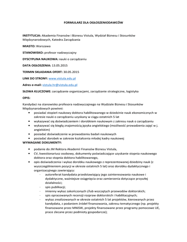FORMULARZ DLA OGŁOSZENIODAWCÓW INSTYTUCJA: Akademia Finansów i Biznesu Vistula, Wydział Biznesu i Stosunków Międzynarodowych, Katedra Zarządzania MIASTO: Warszawa STANOWISKO: profesor nadzwyczajny DYSCYPLINA NAUKOWA: nauki o zarządzaniu DATA OGŁOSZENIA: 13.05.2015 TERMIN SKŁADANIA OFERT: 30.05.2015 LINK DO STRONY: www.vistula.edu.pl Adres e-mail: [email protected] SŁOWA KLUCZOWE: zarządzanie organizacjami, zarządzanie strategiczne, logistyka OPIS: Kandydaci na stanowisko profesora nadzwyczajnego na Wydziale Biznesu i Stosunków Międzynarodowych powinni: • posiadać stopień naukowy doktora habilitowanego w dziedzinie nauk ekonomicznych w zakresie nauki o zarządzaniu uzyskany w ciągu ostatnich 5 lat • wykazywać się doświadczeniem i dorobkiem naukowym z zakresu nauk o zarządzaniu • wykazywać się biegłą znajomością języka angielskiego (możliwość prowadzenia zajęć w j. angielskim) • posiadać doświadczenie w prowadzeniu badań naukowych • posiadać dorobek w zakresie kształcenia młodej kadry naukowej WYMAGANE DOKUMENTY: • • • podanie do JM Rektora Akademii Finansów Biznesu Vistula, CV, kwestionariusz osobowy, dokumenty poświadczające uzyskanie stopnia naukowego doktora oraz stopnia doktora habilitowanego, opis doświadczenia i wykaz dorobku naukowego z reprezentowanej dziedziny nauk (z wyszczególnieniem pozycji w okresie ostatnich 5 lat) oraz dorobku dydaktycznego i organizacyjnego zawierający: · autoreferat kandydata przedstawiający jego zainteresowania naukowe i dydaktyczne, ważniejsze osiągnięcia oraz zamierzenia dotyczące przyszłej działalności; · spis publikacji; · imienny wykaz zakończonych i/lub wszczętych przewodów doktorskich; · spis opracowanych recenzji rozpraw doktorskich i habilitacyjnych; · wykaz zrealizowanych w okresie ostatnich 5 lat projektów, kierowanych przez kandydata, z podaniem źródeł finansowania, zakresu tematycznego (np. projekty finansowane przez MNiSW, projekty finansowane przez programy pomocowe UE, prace zlecane przez podmioty gospodarcze); · • wykaz towarzystw i komitetów, których członkiem był lub jest kandydat, pełnione w nich funkcje oraz wykaz funkcji pełnionych w przeszłości i obecnie w uczelni i poza uczelnią); · recenzję samodzielnego pracownika naukowego; oświadczenie o wyrażeniu zgody na przetwarzanie danych osobowych zawartych w ofercie pracy dla potrzeb niezbędnych do realizacji procesu rekrutacji zgodnie z ustawą z dnia 29.08.1997 r. o ochronie danych osobowych (t.j. Dz. U. z 2002 r. Nr101, poz. 926 ze zm.). Dokumenty należy składać w terminie do 30.05.2015 r. w Rektoracie, ul. Stokłosy 3, 02-787 Warszawa, pok. 44, tel. +224572370 I na adres mailowy: [email protected] Rozstrzygnięcie konkursu nastąpi nie później niż w ciągu 3 miesięcy od jego ogłoszenia. Informacje dotyczące konkursu można uzyskać w Rektoracie, ul. Stokłosy 3, 02-787 Warszawa, pok. 44, tel. +224572370 Akademia Finansów i Biznesu Vistula zastrzega sobie prawo zamknięcia konkursu bez wyłaniania Kandydata. Niepoinformowanie kandydata o wynikach konkursu jest równoznaczne z odrzuceniem jego oferty. Dokumenty osób nieprzyjętych zostaną zniszczone.