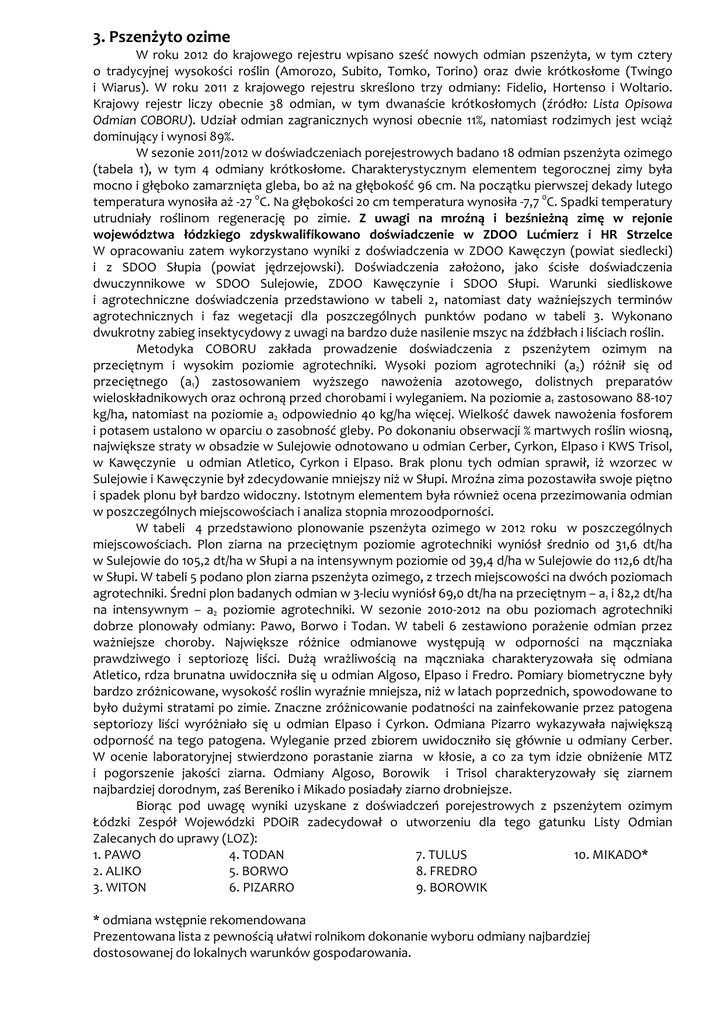 3. Pszenżyto ozime W roku 2012 do krajowego rejestru wpisano sześć nowych odmian pszenżyta, w tym cztery o tradycyjnej wysokości roślin (Amorozo, Subito, Tomko, Torino) oraz dwie krótkosłome (Twingo i Wiarus). W roku 2011 z krajowego rejestru skreślono trzy odmiany: Fidelio, Hortenso i Woltario. Krajowy rejestr liczy obecnie 38 odmian, w tym dwanaście krótkosłomych (źródło: Lista Opisowa Odmian COBORU). Udział odmian zagranicznych wynosi obecnie 11%, natomiast rodzimych jest wciąż dominujący i wynosi 89%. W sezonie 2011/2012 w doświadczeniach porejestrowych badano 18 odmian pszenżyta ozimego (tabela 1), w tym 4 odmiany krótkosłome. Charakterystycznym elementem tegorocznej zimy była mocno i głęboko zamarznięta gleba, bo aż na głębokość 96 cm. Na początku pierwszej dekady lutego temperatura wynosiła aż -27 0C. Na głębokości 20 cm temperatura wynosiła -7,7 0C. Spadki temperatury utrudniały roślinom regenerację po zimie. Z uwagi na mroźną i bezśnieżną zimę w rejonie województwa łódzkiego zdyskwalifikowano doświadczenie w ZDOO Lućmierz i HR Strzelce W opracowaniu zatem wykorzystano wyniki z doświadczenia w ZDOO Kawęczyn (powiat siedlecki) i z SDOO Słupia (powiat jędrzejowski). Doświadczenia założono, jako ścisłe doświadczenia dwuczynnikowe w SDOO Sulejowie, ZDOO Kawęczynie i SDOO Słupi. Warunki siedliskowe i agrotechniczne doświadczenia przedstawiono w tabeli 2, natomiast daty ważniejszych terminów agrotechnicznych i faz wegetacji dla poszczególnych punktów podano w tabeli 3. Wykonano dwukrotny zabieg insektycydowy z uwagi na bardzo duże nasilenie mszyc na źdźbłach i liściach roślin. Metodyka COBORU zakłada prowadzenie doświadczenia z pszenżytem ozimym na przeciętnym i wysokim poziomie agrotechniki. Wysoki poziom agrotechniki (a2) różnił się od przeciętnego (a1) zastosowaniem wyższego nawożenia azotowego, dolistnych preparatów wieloskładnikowych oraz ochroną przed chorobami i wyleganiem. Na poziomie a1 zastosowano 88-107 kg/ha, natomiast na poziomie a2 odpowiednio 40 kg/ha więcej. Wielkość dawek nawożenia fosforem i potasem ustalono w oparciu o zasobność gleby. Po dokonaniu obserwacji % martwych roślin wiosną, największe straty w obsadzie w Sulejowie odnotowano u odmian Cerber, Cyrkon, Elpaso i KWS Trisol, w Kawęczynie u odmian Atletico, Cyrkon i Elpaso. Brak plonu tych odmian sprawił, iż wzorzec w Sulejowie i Kawęczynie był zdecydowanie mniejszy niż w Słupi. Mroźna zima pozostawiła swoje piętno i spadek plonu był bardzo widoczny. Istotnym elementem była również ocena przezimowania odmian w poszczególnych miejscowościach i analiza stopnia mrozoodporności. W tabeli 4 przedstawiono plonowanie pszenżyta ozimego w 2012 roku w poszczególnych miejscowościach. Plon ziarna na przeciętnym poziomie agrotechniki wyniósł średnio od 31,6 dt/ha w Sulejowie do 105,2 dt/ha w Słupi a na intensywnym poziomie od 39,4 d/ha w Sulejowie do 112,6 dt/ha w Słupi. W tabeli 5 podano plon ziarna pszenżyta ozimego, z trzech miejscowości na dwóch poziomach agrotechniki. Średni plon badanych odmian w 3-leciu wyniósł 69,0 dt/ha na przeciętnym – a1 i 82,2 dt/ha na intensywnym – a2 poziomie agrotechniki. W sezonie 2010-2012 na obu poziomach agrotechniki dobrze plonowały odmiany: Pawo, Borwo i Todan. W tabeli 6 zestawiono porażenie odmian przez ważniejsze choroby. Największe różnice odmianowe występują w odporności na mączniaka prawdziwego i septoriozę liści. Dużą wrażliwością na mączniaka charakteryzowała się odmiana Atletico, rdza brunatna uwidoczniła się u odmian Algoso, Elpaso i Fredro. Pomiary biometryczne były bardzo zróżnicowane, wysokość roślin wyraźnie mniejsza, niż w latach poprzednich, spowodowane to było dużymi stratami po zimie. Znaczne zróżnicowanie podatności na zainfekowanie przez patogena septoriozy liści wyróżniało się u odmian Elpaso i Cyrkon. Odmiana Pizarro wykazywała największą odporność na tego patogena. Wyleganie przed zbiorem uwidoczniło się głównie u odmiany Cerber. W ocenie laboratoryjnej stwierdzono porastanie ziarna w kłosie, a co za tym idzie obniżenie MTZ i pogorszenie jakości ziarna. Odmiany Algoso, Borowik i Trisol charakteryzowały się ziarnem najbardziej dorodnym, zaś Bereniko i Mikado posiadały ziarno drobniejsze. Biorąc pod uwagę wyniki uzyskane z doświadczeń porejestrowych z pszenżytem ozimym Łódzki Zespół Wojewódzki PDOiR zadecydował o utworzeniu dla tego gatunku Listy Odmian Zalecanych do uprawy (LOZ): 1. PAWO 4. TODAN 7. TULUS 10. MIKADO* 2. ALIKO 5. BORWO 8. FREDRO 3. WITON 6. PIZARRO 9. BOROWIK * odmiana wstępnie rekomendowana Prezentowana lista z pewnością ułatwi rolnikom dokonanie wyboru odmiany najbardziej dostosowanej do lokalnych warunków gospodarowania. Lp. Odmiana Rok wpisania do Krajowego Rejestru Odmian w Polsce Rok włączenia do LOZ 1 2 3 Kod kraju pochodzenia Tabela 1. Pszenżyto ozime. Odmiany badane. Rok zbioru: 2012 Adres jednostki zachowującej odmianę, a w przypadku odmiany zagranicznej - pełnomocnika w Polsce 1 Pawo 2002 2006 4 PL 2 Todan 2003 2006 PL Hodowla Roślin Strzelce sp. z o.o. Grupa IHAR, ul. Główna 20, 99 – 307 Strzelce 3 Algoso 2007 PL DANKO Hodowla Roślin sp. z o.o. Choryń 27, 64 – 000 Kościan 4 Borwo (ks) 2008 2010 PL Hodowla Roślin Strzelce sp. z o.o. Grupa IHAR, ul. Główna 20, 99 – 307 Strzelce 5 Leontino 2008 2010 PL DANKO Hodowla Roślin sp. z o.o. Choryń 27, 64 – 000 Kościan 6 Atletico (ks) 2009 PL DANKO Hodowla Roślin sp. z o.o. Choryń 27, 64 – 000 Kościan 7 Tulus 2009 2012 PL Saaten - Union Polska sp. z o.o. ul. Straszewska 70, 62 – 100 Węgrowiec 8 Pizarro 2008 2011 PL DANKO Hodowla Roślin sp. z o.o. Choryń 27, 64 – 000 Kościan 9 Cerber 2010 PL Hodowla Roślin Strzelce sp. z o.o. Grupa IHAR, ul. Główna 20, 99 – 307 Strzelce 10 Cyrkon 2010 PL Hodowla Roślin Strzelce sp. z o.o. Grupa IHAR, ul. Główna 20, 9