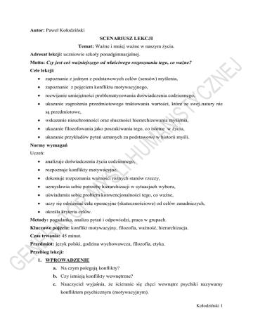 Autor: Paweł Kołodziński SCENARIUSZ LEKCJI Temat: Ważne i mniej ważne w naszym życiu. Adresat lekcji: uczniowie szkoły ponadgimnazjalnej. Motto: Czy jest coś ważniejszego od właściwego rozpoznania tego, co ważne? Cele lekcji: zapoznanie z jednym z podstawowych celów (sensów) myślenia, zapoznanie z pojęciem konfliktu motywacyjnego, rozwijanie umiejętności problematyzowania doświadczenia codziennego, ukazanie zagrożenia przedmiotowego traktowania wartości, które ze swej natury nie są przedmiotowe, wskazanie nieuchronności oraz słuszności hierarchizowania myślenia, ukazanie filozofowania jako poszukiwania tego, co istotne w życiu, ukazanie przykładów pytań uznanych za podstawowe w historii myśli. Normy wymagań Uczeń: analizuje doświadczenia życia codziennego, rozpoznaje konflikty motywacyjne, dokonuje rozpoznania ważności różnych stanów rzeczy, uzmysławia sobie potrzebę hierarchizacji w sytuacjach wyboru, uświadamia sobie problem konwencjonalności tego, co ważne, uczy się odróżniać cele operacyjne (skutecznościowe) od celów zasadniczych, określa kryteria celów. Metody: pogadanka, analiza pytań i odpowiedzi, praca w grupach. Kluczowe pojęcia: konflikt motywacyjny, filozofia, ważność, hierarchizacja. Czas trwania: 45 minut. Przedmiot: język polski, godzina wychowawcza, filozofia, etyka. Przebieg lekcji: 1. WPROWADZENIE a. Na czym polegają konflikty? b. Czy istnieją konflikty wewnętrzne? c. Nauczyciel wyjaśnia, że ścieranie się chęci wewnątrz psychiki nazywamy konfliktem psychicznym (motywacyjnym). Kołodziński 1 2. ĆWICZENIE: ANALIZA KONFLIKTÓW MOTYWACYJNYCH a. Nauczyciel dzieli uczniów na pary i rozdaje im zestawy przykładów różnych sytuacji związanych z koniecznością wyboru (ZAŁĄCZNIK 1). b. Uczniowie mają zadanie określić, jakie motywy są w konflikcie w każdej z sytuacji oraz dokonać wyboru, który z motywów uznają za ważniejszy i uzasadnić swój wybór. c. Nauczyciel omawia poszczególne przykłady w dialogu sokratejskim z uczniami (KOMENTARZ 1). d. W trakcie analizy nauczyciel podaje uczniom treść zasady przyjemności i zasady rzeczywistości (ZAŁĄCZNIK 2). e. W trakcie ćwiczenia nauczyciel dokonuje ćwiczenia analizowania motywacji, hierarchizacji wagi decyzji, porównuje ważność praktyczną (utylitarną) z zasadami etycznymi lub określoną wizją tego, co jest prawdziwym człowieczeństwem [UWAGA: dla uczniów może nie być jasne rozróżnienie między tym co: przyjemne, użyteczne, korzystne a tym, co dobre, słuszne, domagające się realizacji. Może właśnie ta niejasność wyzwoli zapotrzebowanie na dokonanie metaetycznej analizy na lekcjach kolejnych.] 3. REFLEKSJA: TO, CO NAJWAŻNIEJSZE W ŻYCIU N: Dochodzimy do kwestii fundamentalnej – jakie człowieczeństwo wydaje nam się prawdziwe i słuszne, czyli takie, które należy realizować? Jak sądzicie: co współcześnie wydaje się ludziom najważniejsze w życiu? U: Sukces, zamożność, popularność, ładne ciało, władza, szczęście w miłości. N: Czy sądzicie, że wszyscy ludzie mają w tej kwestii rację? U: Nie, niektórzy nie mają racji. Nie wydaje się, żeby dobrym było życie polegające na ciągłym upijaniu się albo pracoholizm prowadzący do wyniszczenia fizycznego i psychicznego. 4. KOMENTARZ DO WSPÓŁCZESNOŚCI a. Nauczyciel czyta uczniom fragment utworu Postmodernizm Jacka Kaczmarskiego: Zachwyt tyle wart co wzgarda, Stryczek tyle co kokarda/ Prawda tyle co jej brak, Smaku brak – tyle, co smak. b. Jak rozumieć tę wypowiedź? Czy możemy traktować ją dosłownie? [UWAGA: warto w razie potrzeby wskazać ironię Kaczmarskiego. Przede wszystkim trzeba zapytać uczniów, czy zgadzają się z wizją świata, w którym wszystko jest tak samo ważne lub wszystko jest nieważne] Kołodziński 2 c. Nauczyciel uzyskuje odpowiedź od uczniów albo sam stwierdza, że życie wymaga hierarchizacji. 5. ĆWICZENIE: ANALIZA PRZYPOWIEŚCI a. Nauczyciel rozdaje uczniom ZAŁĄCZNIK 3. b. Uczniowie czytają tekst i zgłaszają swoje komentarze dotyczące tego, co w życiu ważne i konsekwencji niewłaściwego wyboru priorytetów. 6. PODSUMOWANIE LEKCJI a. N: Żyjemy w czasach, które już pół wieku temu nazwano czasami technokracji albo skuteczności. Posiadamy ogromną wiedzę o tym, jak dążyć do celu: wyleczyć chorobę czy zbudować dom. Jednak wiedza i umiejętności nie wystarczą do właściwego wyznaczania celu. Skoro nie wszystko jest tak samo ważne, to trzeba pytać: co jest ważne? Odpowiedzi na to pytanie można szukać także w filozofii. b. Czy jest coś ważniejszego od właściwego rozpoznania tego, co ważne? c. Zadanie domowe: napisz wypracowanie na temat, czy rację miał John Stuart Mill, twierdząc, że lepiej być nieszczęśliwym Sokratesem, niż zadowolonym głupcem. Kołodziński 3 ZAŁĄCZNIK 1 1) Jurek ociężale wstaje z łóżka przed szkołą powtarzając zwyczajowe: … nie chce mi się! 2) Rafał spędza sesję egzaminacyjną na różnych uciechach nie przygotowując się do egzaminu rozstrzygającego o jego pozostaniu na studiach. 3) Ryszard kończy naprawę dachu mimo szarpiącego głodu, ponieważ nadchodzi ulewny deszcz. 4) Anna ma niewiele pieniędzy. Potrzebuje kupić żywność, ale nęci ją efektowna bransoletka. 5) Pali się dom. Irena mimo zagrożenia gorączkowo poszukuje pamiątek z wakacji. 6) Janek waha się, czy iść z pociągającą go dziewczyną do kina, czy obejrzeć finał Euro 2016 w telewizji. 7) Maurycy zrozpaczony terminalną chorobą swego dziecka zgadza się na zbrodnię w celu dokonania bezcennego przeszczepu ratującego jego dziecko. 8) Jadwiga cierpi na chorobę psychiczną (historia z czasów kiedy stosowano leki starszej generacji, mające silne działanie otępiające). Nie chce przyjmować leków, bo chce być świadoma mimo, że to grozi napadami straszliwego lęku. 9) Krzysztof rezygnuje z wykonania niegodnego polecenia, wiedząc, że przyniesi