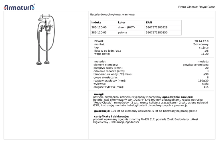 Retro Classic: Royal Class Bateria dwuuchwytowa, wannowa Indeks kolor EAN 385-120-00 chrom (HOT) 5907571380928 385-120-05 patyna 5907571380850 PKWiU: montaż: typ: ilosc w op jedn / zb.: waga netto: materiał: element sterujący: przepływ wody [l/min]: ciśnienie robocze [atm]: temperatura wody [°C] maks.: grupa akustyczna: rozstaw przyłączy [mm]: wylewka: długość wylewki [mm]: 28.14.12.0 2-otworowy stojąca 1/6 11.20 mosiądz głowica ceramiczna 20 3 ≤90 II 150±20 stała 115 uwagi: natrysk, przełącznik natrysku wykonany z porcelany opakowanie zawiera: bateria, wąż chromowany WM 1/2x3/4" L=1400 mm z uszczelkami, rączka natrysku "Retro Classic", mimośrody - 2 szt., rozety kuliste z uszczelkami - 2 szt., osłona nakrętki G3/4, instrukcję montażu i obsługi baterii dwuuchwytowych z gwarancją gwarancja: 100 lat na elementy odlewane, 5 lat na bezawaryjną pracę głowic certyfikaty i deklaracje: produkt wykonany zgodnie z normą PN-EN 817, posiada Znak Budowlany , Atest Higieniczny , Deklarację Zgodności Retro Classic: Royal Class Retro Classic: Royal Class