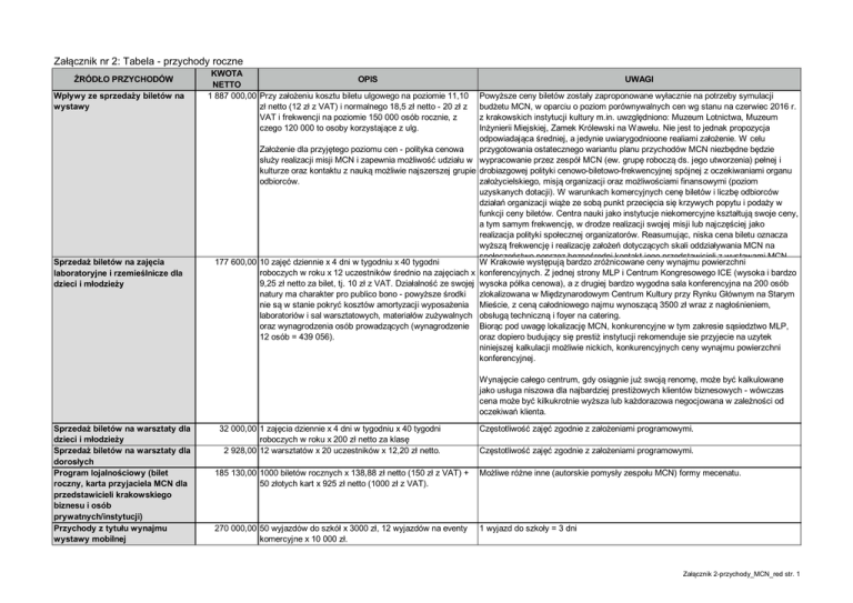 Załącznik nr 2: Tabela - przychody roczne ŹRÓDŁO PRZYCHODÓW Wpływy ze sprzedaży biletów na wystawy KWOTA OPIS NETTO 1 887 000,00 Przy założeniu kosztu biletu ulgowego na poziomie 11,10 zł netto (12 zł z VAT) i normalnego 18,5 zł netto - 20 zł z VAT i frekwencji na poziomie 150 000 osób rocznie, z czego 120 000 to osoby korzystające z ulg. Założenie dla przyjętego poziomu cen - polityka cenowa służy realizacji misji MCN i zapewnia możliwość udziału w kulturze oraz kontaktu z nauką możliwie najszerszej grupie odbiorców. Sprzedaż biletów na zajęcia laboratoryjne i rzemieślnicze dla dzieci i młodzieży 177 600,00 10 zajęć dziennie x 4 dni w tygodniu x 40 tygodni roboczych w roku x 12 uczestników średnio na zajęciach x 9,25 zł netto za bilet, tj. 10 zł z VAT. Działalność ze swojej natury ma charakter pro publico bono - powyższe środki nie są w stanie pokryć kosztów amortyzacji wyposażenia laboratoriów i sal warsztatowych, materiałów zużywalnych oraz wynagrodzenia osób prowadzących (wynagrodzenie 12 osób = 439 056). UWAGI Powyższe ceny biletów zostały zaproponowane wyłacznie na potrzeby symulacji budżetu MCN, w oparciu o poziom porównywalnych cen wg stanu na czerwiec 2016 r. z krakowskich instytucji kultury m.in. uwzględniono: Muzeum Lotnictwa, Muzeum Inżynierii Miejskiej, Zamek Królewski na Wawelu. Nie jest to jednak propozycja odpowiadająca średniej, a jedynie uwiarygodnioone realiami założenie. W celu przygotowania ostatecznego wariantu planu przychodów MCN niezbędne będzie wypracowanie przez zespół MCN (ew. grupę roboczą ds. jego utworzenia) pełnej i drobiazgowej polityki cenowo-biletowo-frekwencyjnej spójnej z oczekiwaniami organu założycielskiego, misją organizacji oraz możliwościami finansowymi (poziom uzyskanych dotacji). W warunkach komercyjnych cenę biletów i liczbę odbiorców działań organizacji wiąże ze sobą punkt przecięcia się krzywych popytu i podaży w funkcji ceny biletów. Centra nauki jako instytucje niekomercyjne kształtują swoje ceny, a tym samym frekwencję, w drodze realizacji swojej misji lub najczęściej jako realizacja polityki społecznej organizatorów. Reasumując, niska cena biletu oznacza wyższą frekwencję i realizację założeń dotyczących skali oddziaływania MCN na społeczeństwo poprzez bezpośredni kontakt jego przedstawicieli z wystawami MCN, W Krakowie występują bardzo zróżnicowane ceny wynajmu powierzchni konferencyjnych. Z jednej strony MLP i Centrum Kongresowego ICE (wysoka i bardzo wysoka półka cenowa), a z drugiej bardzo wygodna sala konferencyjna na 200 osób zlokalizowana w Międzynarodowym Centrum Kultury przy Rynku Głównym na Starym Mieście, z ceną całodniowego najmu wynoszącą 3500 zł wraz z nagłośnieniem, obsługą techniczną i foyer na catering. Biorąc pod uwagę lokalizację MCN, konkurencyjne w tym zakresie sąsiedztwo MLP, oraz dopiero budujący się prestiż instytucji rekomenduje sie przyjecie na uzytek niniejszej kalkulacji możliwie nickich, konkurencyjnych ceny wynajmu powierzchni konferencyjnej. Wynajęcie całego centrum, gdy osiągnie już swoją renomę, może być kalkulowane jako usługa niszowa dla najbardziej prestiżowych klientów biznesowych - wówczas cena może być kilkukrotnie wyższa lub każdorazowa negocjowana w zależności od oczekiwań klienta. Sprzedaż biletów na warsztaty dla dzieci i młodzieży Sprzedaż biletów na warsztaty dla dorosłych Program lojalnościowy (bilet roczny, karta przyjaciela MCN dla przedstawicieli krakowskiego biznesu i osób prywatnych/instytucji) Przychody z tytułu wynajmu wystawy mobilnej 32 000,00 1 zajęcia dziennie x 4 dni w tygodniu x 40 tygodni roboczych w roku x 200 zł netto za klasę 2 928,00 12 warsztatów x 20 uczestników x 12,20 zł netto. Częstotliwość zajęć zgodnie z założeniami programowymi. Częstotliwość zajęć zgodnie z założeniami programowymi. 185 130,00 1000 biletów rocznych x 138,88 zł netto (150 zł z VAT) + 50 złotych kart x 925 zł netto (1000 zł z VAT). Możliwe różne inne (autorskie pomysły zespołu MCN) formy mecenatu. 270 000,00 50 wyjazdów do szkół x 3000 zł, 12 wyjazdów na eventy komercyjne x 10 000 zł. 1 wyjazd do szkoły = 3 dni Załącznik 2-przychody_MCN_red str. 1 Czynsze z tytułu najmu Wynajem przestrzeni (sala konferencyjna, całe centrum) na imprezy o charakterze komercyjnym Umowy ze sponsorami Patronat tytularny nad strefami tematycznymi / laboratoriami Darowizny Imprezy na zamówienie (np. urodziny) Przychody z tytułu pikniku Dotacja miejska na organizację Pikniku 156 000,00 Założenie: uzupełnienie przestrzeni o sklepik z pamiątkami Rozliczenie z tytułu zużywanych przez najemców mediów nie zostało ujęte ani po - w dobrze zaplanowanym muzeum/centrum nauki stronie przychodów, ani wydatków. Założone jest pełne refakturowanie i bilansowanie odwiedzający zostawia statystycznie równowartość się kwot. dodatkowego biletu. Zakładane powierzchnie do wynajęcia: restauracyjna z kuchnią (10 000 zł netto miesięcznie), sklepik (3000 zł netto miesięcznie). Osobno pełen zwrot kosztów zużywanych mediów. 90 000,00 20 dni x 3000 zł netto (sala konferencyjna) + 2 duże eventy komercyjne rocznie (całe centrum) x 15 000 zł netto 250 000,00 Od drugiego roku działalności - sponsor generalny - 150 000, stali partnerzy wydarzeń, sponsor techniczny - 100 000 łącznie. 80 000,00 3 laboratoria + 5 stref tematycznych wystaw x 1/2 (należy założyć, że uda się sprzedać max. 50% możliwych patronatów) x 20.000 zł. 5 000,00 Jedna do dwóch rocznie od drugiego lub trzeciego roku z perspektyw działalności fundraisingowej. 50 000,00 50 tygodni roboczych x 1000 zł netto (pokaz/zajęcia warsztatowe + zwiedzanie) 10 000,00 Opłata za 2 stanowiska gastronomiczne oraz stanowiska sponsorskie 50 000,00 założenie uzyskania dotacji na flagową imprezę organizowaną w Mieście przez MCN - nie m