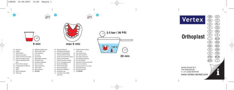 128546 31-05-2007 13:00 Pagina 1 ➎ ➍ ➏ GB Orthoplast max 6 min 9 min GB NL D F E P I M DK N S FIN EST Dough time Deegtijd Teiganmischzeit Temps de fermentation Tiempo de formación de la masa Tempo de formação da pasta Tempo di solidificazione della pasta – H in biex tifforma l-gh̄aġna Forberedningstid for dejmasse Deigtid Degtid Taikinan käsittelyaika Täidise aeg LV LT PL CZ SK H SLO Mais¥juma sting‰anas laiks Mi‰inio stingimo laikas Czas utwardzania âas tvrzení âas tvrdnutia Masszaállapot idŒtartama âas gnetne mase GB реме на смесване DK RUS J F E P I N GR TR D M RO BG NL Hamur Süresi ремя смешивания S FIN EST LV Manual handling time Handmatige verwerkingstijd Manuelle Verarbeitungszeit Temps de traitement manuel Tiempo de procesamiento manual Tempo de manuseamento Tempo di lavorazione manuale – H in ta’ l-immaniġġjar manwali Manuel behandlingstid Manuell håndteringstid Manuell hanteringstid Manuaalinen käsittelyaika Käsilaadimise aeg Uzraudz¥bas rokas vad¥bas reÏ¥mÇ laiks LT PL CZ SK H SLO PrieÏiros rankinio valdymo reÏimu laikas Czas obróbki r´cznej âas ruãního zpracování âas ruãného spracovania Kézi feldolgozás idŒtartama âas roãne obdelave 20 min RO BG реме на ръчна обработка GR TR RUS J Elle çalıfltırma süresi ремя ручной обработки Vertex-Dental B.V. The Netherlands ✆ +31 (0)30 6976749 www.vertex-dental.com LV NL LT D PL F CZ E SK P H I SLO M RO DK BG N GR S TR FIN RUS EST J 128546 31-05-2007 13:00 Pagina 2 ➊ ➋ ➊ METHOD A B max 9 min GB NL D F E P I M DK N S FIN EST LV Manual handling time Handmatige verwerkingstijd Manuelle Verarbeitungszeit Temps de traitement manuel Tiempo de procesamiento manual Tempo de manuseamento Tempo di lavorazione manuale – H in ta’ l-immaniġġjar manwali Manuel behandlingstid Manuell håndteringstid Manuell hanteringstid Manuaalinen käsittelyaika Käsilaadimise aeg Uzraudz¥bas rokas vad¥bas reÏ¥mÇ laiks LT PL CZ SK H SLO PrieÏiros rankinio valdymo reÏimu laikas Czas obróbki r´cznej âas ruãního zpracování âas ruãného spracovania Kézi feldolgozás idŒtartama âas roãne obdelave 1 ml : 2,1 g GB NL D 20 min F E P I RO M BG реме на ръчна обработка DK GR N TR RUS Elle çalıfltırma süresi ремя ручной обработки ➋ S FIN J EST Mix ratio Mengverhouding Mischverhältnis Taux de mixage Proporción de la mezcla Proporção de mistura Rapporto di dosaggio Proporzjon tat-tah̄lita Mix ratio Blandingsforhold Blandningsförhållande Sekoitussuhde Segu vahekord LV LT PL CZ SK H SLO Mais¥juma sastÇvda∫u attiec¥ba Mi‰inio komponent˜ santykis Proporcje mieszanki Smû‰ovací pomûr Pomer mie‰ania Keverési arány Me‰alno razmerje ➌ RO BG месителна пропорция GR TR RUS J Karıflım Oranı ропорция смешивания 20 sec