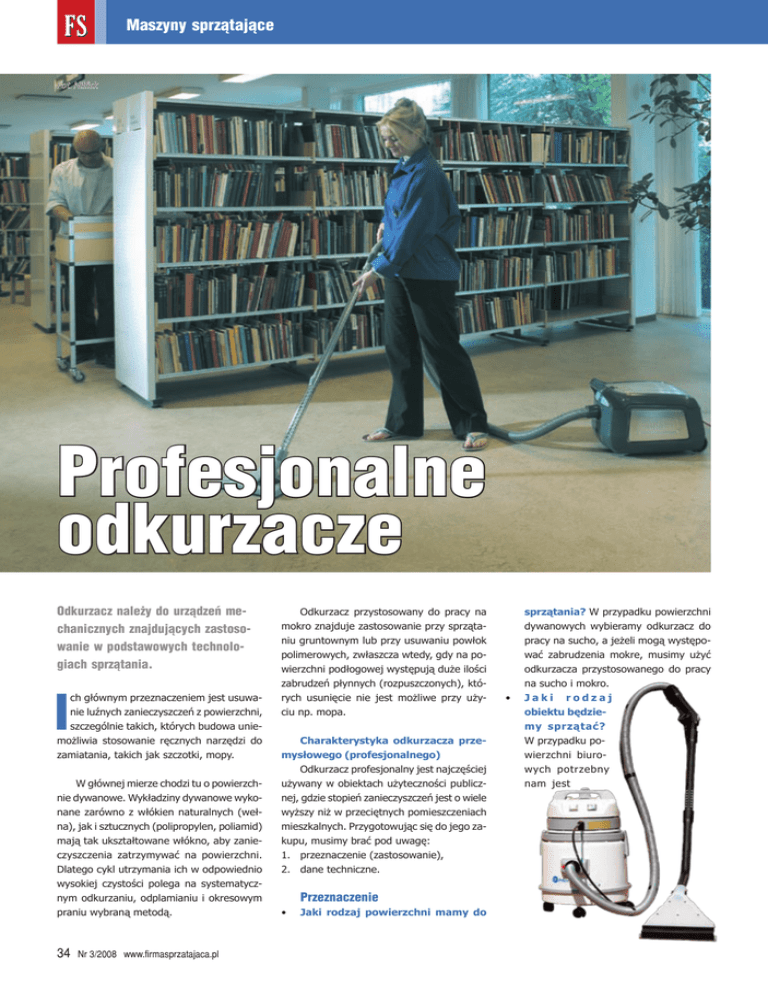 Maszyny sprzątające Fot. Nilfisk Profesjonalne odkurzacze Odkurzacz należy do urządzeń mechanicznych znajdujących zastosowanie w podstawowych technologiach sprzątania. I ch głównym przeznaczeniem jest usuwanie luźnych zanieczyszczeń z powierzchni, szczególnie takich, których budowa uniemożliwia stosowanie ręcznych narzędzi do zamiatania, takich jak szczotki, mopy. W głównej mierze chodzi tu o powierzchnie dywanowe. Wykładziny dywanowe wykonane zarówno z włókien naturalnych (wełna), jak i sztucznych (polipropylen, poliamid) mają tak ukształtowane włókno, aby zanieczyszczenia zatrzymywać na powierzchni. Dlatego cykl utrzymania ich w odpowiednio wysokiej czystości polega na systematycznym odkurzaniu, odplamianiu i okresowym praniu wybraną metodą. 34 Nr 3/2008 www.firmasprzatajaca.pl Odkurzacz przystosowany do pracy na mokro znajduje zastosowanie przy sprzątaniu gruntownym lub przy usuwaniu powłok polimerowych, zwłaszcza wtedy, gdy na powierzchni podłogowej występują duże ilości zabrudzeń płynnych (rozpuszczonych), których usunięcie nie jest możliwe przy użyciu np. mopa. Charakterystyka odkurzacza przemysłowego (profesjonalnego) Odkurzacz profesjonalny jest najczęściej używany w obiektach użyteczności publicznej, gdzie stopień zanieczyszczeń jest o wiele wyższy niż w przeciętnych pomieszczeniach mieszkalnych. Przygotowując się do jego zakupu, musimy brać pod uwagę: 1. przeznaczenie (zastosowanie), 2. dane techniczne. Przeznaczenie • Jaki rodzaj powierzchni mamy do • sprzątania? W przypadku powierzchni dywanowych wybieramy odkurzacz do pracy na sucho, a jeżeli mogą występować zabrudzenia mokre, musimy użyć odkurzacza przystosowanego do pracy na sucho i mokro. Jaki rodzaj obiektu będziemy sprzątać? W przypadku powierzchni biurowych potrzebny nam jest Maszyny sprzątające Montaż filtra HEPA • Oczyszczenie: • pływak • siatka • obudowa Przygotować: • filtr HEPA (SV149) • zapinkę SV150 Na głowicę założyć filtr Zwracając uwagę na otwór w głowicy zamontować zapinkę Dociskając zapinkę do filtra przekręcić pokrętło zapinki mniejszy odkurzacz, który umożliwi pracę w każdym pomieszczeniu. Ważną sprawą przy wyborze odkurzacza jest jego waga, zwłaszcza, jeżeli obiekt o kilku piętrach nie posiada systemów windowych (i trzeba przenosić odkurzacz po schodach). Należy także zwrócić uwagę na głośność pracy oraz systemy filtrów. Pomieszczenia biurowe oraz obiekty o wyższym standardzie czystości zmuszają do użycia odkurzacza z minimum dwoma systemami filtrów (papierowy i poliestrowo-bawełniany). Częstotliwość i czas pracy. W obiektach użyteczności publicznej, ze względu na najczęściej duża powierzchnię, wysoki stopień zabrudzeń i wydłużony czas prowadzonych operacji, stosowanie odkurzaczy domowych to strata czasu (niedokładne sprzątanie) i nakładów • W odkurzaczach 3 silnikowych S/M filtr HEPA może wspó łpracować z filtrem poliestrowym. W odkurzaczach 1 silnikow yc h S/M mamy do w yb o ry filtr poliestrowy lub filtr HEPA (jedna opcja) finansowych (duża awaryjność – odkurzacze domowe nie są przystosowane do tak długiego okresu pracy). Wielofunkcyjność. Niektóre z odkurzaczy do pracy na sucho/mokro posiadają funkcję prania wykładzin w systemie ekstrakcyjnym. Są wyposażone w dodatkowy silnik zasilający pompę natryskową. W przypadku mniejszych obiektów (np. przedszkola, hotele) pozwalają na wykonanie wielu czynności związanych z utrzymaniem czystości. Umożliwiają odkurzanie na sucho, zbieranie wody, pranie wykładzin i tapicerki, a także dezynfekcję materacy łóżkowych. Dane techniczne Wybierając odkurzacz, należy również zapoznać się z podanymi przez producenta (dystrybutora) danymi technicznymi. Pamiętajmy, że brak informacji świadczy najczęściej o braku profesjonalizmu sprzedawcy. Nie wszystkie dane handlowiec musi znać na pamięć, ale powinny one być zapisane w sposób czytelny w katalogu wyrobów • Napięcie zasilania – 230-240 V, 50 Hz – musimy pamiętać, że część tego typu wyrobów jest produkowana poza Polską. • Maksymalna moc silnika (silników) – ta informacja nie jest równoznaczna z wydajnością odkurzacza. Podana moc silnika np. 1000 W nie jest zgodna z wytwarzanym przez niego podciśnieniem (siłą ssania). Czyli mocniejszy silnik to większe zużycie energii elektrycznej. • Podciśnienie robocze (podawane w mm H20) – informuje o sile ssania, • • opr. Merida Demontaż głowicy: • przekręcić w prawo czyli „mocy” usuwania zanieczyszczeń. Odkurzacze domowe posiadają podciśnienie w granicach 800-1000 mm H 20, odkurzacze profesjonalne od 1500-2600 mm H2O. Wydajność (podawana w m3/h) – czyli ilość powietrza, które odkurzacz wciąga i usuwa. Szczególnie jest to ważne przy odkurzaczach do pracy na mokro. Większa wydajność to zwiększona ilość wody, którą w ciągu godziny odkurzacz jest w stanie „połknąć”. Pojemność zbiornika (podawana w litrach). www.firmasprzatajaca.pl Nr 3/2008 35 Maszyny sprzątające Fot. Kärcher • • • 36 Odkurzacz o pojemności 9-10 l można przenosić. W przypadku wyższych pojemności przesuwamy go za pomocą systemu jezdnego. Waga (podawana w kg) określa sposób transportu. System filtrów – najczęściej odkurzacze przemysłowe posiadają dwa systemy filtrów: papierowy (popularny worek) oraz poliestrowo-bawełniany w kształcie „nakrycia głowy-kapelusza”. Ich stosowanie zwiększa czystość wydalanego powietrza z równoczesnym zabezpieczeniem najważniejszego elementu odkurzacza – silnika. Dodatkowy filtr to FILTR HEPA, tzw. filtr do- Nr 3/2008 www.firmasprzatajaca.pl opr. Merida Ustawienie defektora w odkurzaczu do pracy sucho/mokro Praca na sucho: • defektor ustawiamy poziomo Praca na mokro: • defektor ustawiamy pionowo kładnego czyszczenia. Jego budowa pozwala na zwiększenie powierzchni czyszczenia 