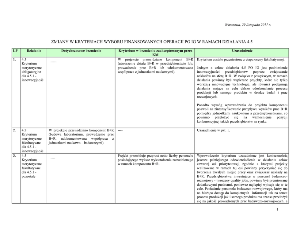 Warszawa, 29 listopada 2011 r. ZMIANY W KRYTERIACH WYBORU FINANSOWANYCH OPERACJI PO IG W RAMACH DZIAŁANIA 4.5 LP 1. Działanie 4.5 Kryterium merytoryczne obligatoryjne dla 4.5.1 innowacyjność Dotychczasowe brzmienie ----- Kryterium w brzmieniu zaakceptowanym przez KM W projekcie przewidziano komponent B+R (utworzenie działu B+R w przedsiębiorstwie lub, prowadzenie prac B+R lub udokumentowana współpraca z jednostkami naukowymi). Uzasadnienie Kryterium zostało przeniesione z etapu oceny fakultatywnej. Jednym z celów działania 4.5 PO IG jest podniesienie innowacyjności przedsiębiorstw poprzez zwiększanie nakładów na sferę B+R. W związku z powyższym, w ramach działania powinny być wspierane projekty, które nie tylko wdrażają innowacyjne technologie, ale również podejmują działania mające na celu dalsze udoskonalanie procesu produkcji lub samego produktu w drodze badań i prac rozwojowych. Ponadto wymóg wprowadzenia do projektu komponentu pozwoli na zintensyfikowanie przepływu wyników prac B+R pomiędzy jednostkami naukowymi a przedsiębiorstwami, co powinno przełożyć się na wzmocnienie pozycji konkurencyjnej takich przedsiębiorstw na rynku. 2. 3. 4.5 Kryterium merytoryczne fakultatywne dla 4.5.1 innowacyjność 4.5 Kryterium merytoryczne fakultatywne dla 4.5.1 pozostałe W projekcie przewidziano komponent B+R (budowa laboratorium, prowadzenie prac B+R, udokumentowana współpraca z jednostkami naukowo – badawczymi). ---- ---- Uzasadnienie w pkt. 1. Projekt przewiduje przyrost netto liczby personelu posiadającego wyższe wykształcenie zatrudnionego w ramach komponentu B+R. Wprowadzenie kryterium uzasadnione jest koniecznością jeszcze pełniejszego odzwierciedlenia w działaniu celów czwartej osi priorytetowej, zgodnie z którymi projekty realizowane w ramach tej osi powinny przyczyniać się do tworzenia trwałych miejsc pracy oraz zwiększać nakłady na B+R. Przedsiębiorstwa inwestujące w personel badawczorozwojowy - tworzący quality jobs, powinny być premiowane dodatkowymi punktami, ponieważ najlepiej wpisują się w te cele. Posiadanie personelu badawczo-rozwojowego, który ma na bieżąco dostęp do kompletnych informacji tak na temat procesu produkcji jak i samego produktu ma szanse przełożyć się na jakość prowadzonych prac badawczo-rozwojowych, a 1 Warszawa, 29 listopada 2011 r. także zapewnić stałe podnoszenie innowacyjności produkcji. 4. 4.5 Kryterium merytoryczne obligatoryjne dla 4.5.2 innowacyjność ---- Wnioskodawca posiada zdolność do realizacji prac badawczych (dotyczy projektów z zakresu utworzenia lub rozbudowy centrum badawczorozwojowego). Kryterium dotyczące inwestycji typu CBR. Kryterium zostało przeniesione z etapu oceny merytorycznej fakultatywnej. Głównym zadaniem Centrum badawczo-rozwojowego zgodnie z definicją zawartą w § 8 ust. 1 pkt 2 rozporządzenia Ministra Gospodarki z dnia 8 maja 2009 r. w sprawie udzielania pomocy finansowej dla inwestycji o dużym znaczeniu dla gospodarki w ramach Programu Operacyjnego Innowacyjna Gospodarka, 2007-2013 (Dz. U. Nr 75, poz. 638, z późn. zm.) jest prowadzenie badań naukowych i prac rozwojowych w wydzielonych i przystosowanych do tego typu działalności pomieszczeniach przy wykorzystaniu infrastruktury technicznej oraz wykwalifikowanej kadry. W świetle powyższego nie ma możliwości udzielenia wsparcia inwestycji określanej przez Wnioskodawcę jako CBR, a nie posiadającej zdolności do realizacji prac badawczych, ponieważ inwestycja taka nie mieści się w definicji CBR określonej w ww. rozporządzeniu. Przedmiotowe kryterium odnosi się wyłącznie do inwestycji typu centrum badawczo-rozwojowe. Ocena kryterium dotyczącego posiadania zdolności do realizacji prac badawczych dokonywana jest na podstawie opisu w pkt 18 i 19 wniosku o dofinansowanie, przy czym weryfikacji podlega w szczególności: adekwatność zaplecza infrastrukturalnego do zakresu projektu oraz zatrudnianie co najmniej 2 pracowników ze stopniem naukowym doktora, w dziedzinie której będą dotyczyć planowane prace badawczo rozwojowe. Dopuszczane są następujące formy zatrudnienia przewidziane art. 25 ustawy z dnia 26 czerwca 1974 r. - Kodeks pracy. (Dz. U. Nr 21, poz. 94, z późn. zm): - na okres próbny; - na czas nieokreślony; - na czas określony; - na czas wykonania określonej pracy; - „na zastępstwo”. 2 5. 4.5 Kryterium merytoryczne obligatoryjne dla 4.5.2 innowacyjność ----- Wnioskodawca posiada zdolność do komercjalizacji wyników prac badawczych (dotyczy projektów z zakresu utworzenia lub rozbudowy centrum badawczo-rozwojowego). Kryterium dotyczące inwestycji typu CBR. Warszawa, 29 listopada 2011 r. Kryterium zostało przeniesione z etapu oceny merytorycznej fakultatywnej ponieważ zdolność do komercjalizacji wyników prac badawczych jest w przypadku centrum badawczorozwojowego zagadnieniem kluczowym i warunkującym możliwość realnego wykorzystania osiągnięć CBR. Działalność B+R prowadzona w ramach projektów wspieranych w poddziałaniu 4.5.2 PO IG powinna zaowocować wynikami, które znajdą praktyczne zastosowanie w przedsiębiorstwach i przyczynią się do podniesienia ich innowacyjności i konkurencyjności tak na rynku krajowym jak i międzynarodowym, powyższe nie jest możliwe w przypadku centrum nie posiadającego zdolności do komercjalizacji wyników swoich prac. Jednocześnie należy podkreślić, iż komercjalizacja jest w przypadku poddziałania 4.5.2 PO IG rozumiana bardzo szeroko – jako wszelkiego rodzaju formy dyfuzji innowacji oraz edukacji technicznej. Proces komercjalizacji obejmuje kompleks działań mających na celu ulokowanie na rynku produktu/ów (w szerokim rozumieniu) wykorzystujących daną technologię, a więc uznanie tego kryterium za obligatoryjne dla wszystkich projektów dotyczących inwestycji typu CBR nie powinno wiązać się z dodatkową uciążliwością dla Wnioskodawców. Ocena kryterium dotyczącego posiad