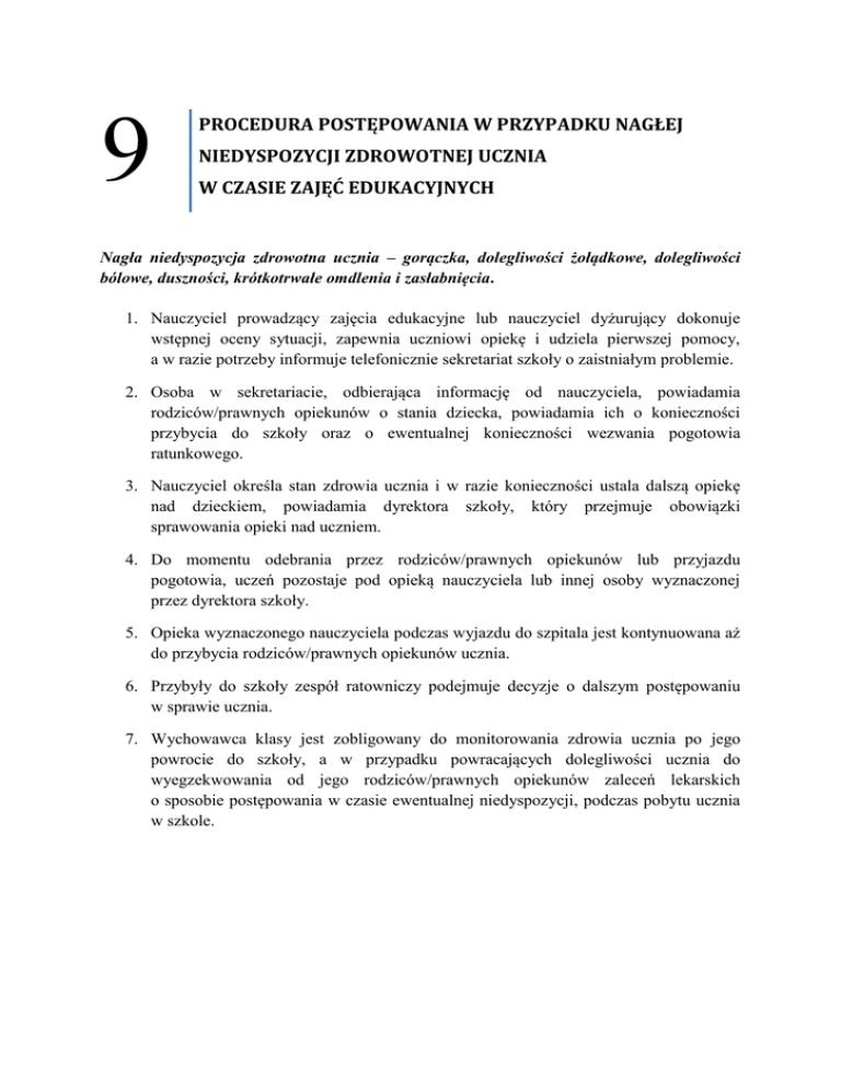 9 PROCEDURA POSTĘPOWANIA W PRZYPADKU NAGŁEJ NIEDYSPOZYCJI ZDROWOTNEJ UCZNIA W CZASIE ZAJĘĆ EDUKACYJNYCH Nagła niedyspozycja zdrowotna ucznia – gorączka, dolegliwości żołądkowe, dolegliwości bólowe, duszności, krótkotrwałe omdlenia i zasłabnięcia. 1. Nauczyciel prowadzący zajęcia edukacyjne lub nauczyciel dyżurujący dokonuje wstępnej oceny sytuacji, zapewnia uczniowi opiekę i udziela pierwszej pomocy, a w razie potrzeby informuje telefonicznie sekretariat szkoły o zaistniałym problemie. 2. Osoba w sekretariacie, odbierająca informację od nauczyciela, powiadamia rodziców/prawnych opiekunów o stania dziecka, powiadamia ich o konieczności przybycia do szkoły oraz o ewentualnej konieczności wezwania pogotowia ratunkowego. 3. Nauczyciel określa stan zdrowia ucznia i w razie konieczności ustala dalszą opiekę nad dzieckiem, powiadamia dyrektora szkoły, który przejmuje obowiązki sprawowania opieki nad uczniem. 4. Do momentu odebrania przez rodziców/prawnych opiekunów lub przyjazdu pogotowia, uczeń pozostaje pod opieką nauczyciela lub innej osoby wyznaczonej przez dyrektora szkoły. 5. Opieka wyznaczonego nauczyciela podczas wyjazdu do szpitala jest kontynuowana aż do przybycia rodziców/prawnych opiekunów ucznia. 6. Przybyły do szkoły zespół ratowniczy podejmuje decyzje o dalszym postępowaniu w sprawie ucznia. 7. Wychowawca klasy jest zobligowany do monitorowania zdrowia ucznia po jego powrocie do szkoły, a w przypadku powracających dolegliwości ucznia do wyegzekwowania od jego rodziców/prawnych opiekunów zaleceń lekarskich o sposobie postępowania w czasie ewentualnej niedyspozycji, podczas pobytu ucznia w szkole.