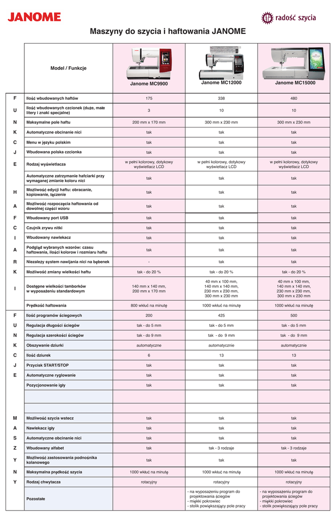 Maszyny do szycia i haftowania JANOME Model / Funkcje Janome MC9900 Janome MC12000 175 338 480 3 10 10 200 mm x 170 mm 300 mm x 230 mm 300 mm x 230 mm Janome MC15000 F Ilo U Ilo wbudowanych czcionek (du e, ma e litery i znaki specjalne) N Maksymalne pole haftu K Automatyczne obcinanie nici tak tak tak C Menu w j zyku polskim tak tak tak J Wbudowana polska czcionka tak tak tak E Rodzaj wy wietlacza w pe ni kolorowy, dotykowy wy wietlacz LCD w pe ni kolorowy, dotykowy wy wietlacz LCD w pe ni kolorowy, dotykowy wy wietlacz LCD Automatyczne zatrzymanie hafciarki przy wymaganej zmianie koloru nici tak tak tak H Mo liwo edycji haftu: obracanie, kopiowanie, czenie tak tak tak A Mo liwo rozpocz cia haftowania od dowolnej cz ci wzoru tak tak tak F Wbudowany port USB tak tak tak C Czujnik zrywu nitki tak tak tak I Wbudowany nawlekacz tak tak tak A Podgl d wybranych wzorów: czasu haftowania, ilo ci kolorow i rozmiaru haftu tak tak tak R Niezale y system nawijania nici na b benek - tak tak K Mo liwo tak - do 20 % tak - do 20 % tak - do 20 % I Dost pne wielko ci tamborków w wyposa eniu standardowym 140 mm x 140 mm, 200 mm x 170 mm 40 mm x 100 mm, 140 mm x 140 mm, 230 mm x 230 mm, 300 mm x 230 mm 40 mm x 100 mm, 140 mm x 140 mm, 230 mm x 230 mm, 300 mm x 230 mm Pr dko 800 wk u na minut 1000 wk u na minut 1000 wk u na minut 200 425 500 wbudowanych haftów zmiany wielko ci haftu haftowania F Ilo U Regulacja d ugo ci ciegów tak - do 5 mm tak - do 5 mm tak - do 5 mm N Regulacja szeroko ci ciegów tak - do 9 mm tak - do 9 mm tak - do 9 mm K Obszywanie dziurki automatyczne automatycznie automatycznie C Ilo 6 13 13 J Przycisk START/STOP tak tak tak E Automatyczne ryglowanie tak tak tak Pozycjonowanie ig y tak tak tak M Mo liwo tak tak tak A Nawlekacz ig y tak tak tak S Automatyczne obcinanie nici tak tak tak Z Wbudowany alfabet tak tak - 3 rodzaje tak - 3 rodzaje Y Mo liwo zastosowania podno nika kolanowego tak tak tak N Maksymalna pr dko 1000 wk u na minut 1000 wk u na minut 1000 wk u na minut Y Rodzaj chwytacza rotacyjny rotacyjny rotacyjny programów ciegowych dziurek Pozosta e szycia wstecz szycia - na wyposa eniu program do projektowania ciegów - mi kki pokrowiec - stolik powi kszaj cy pole pracy - na wyposa eniu program do projektowania ciegów - mi kki pokrowiec - stolik powi kszaj cy pole pracy