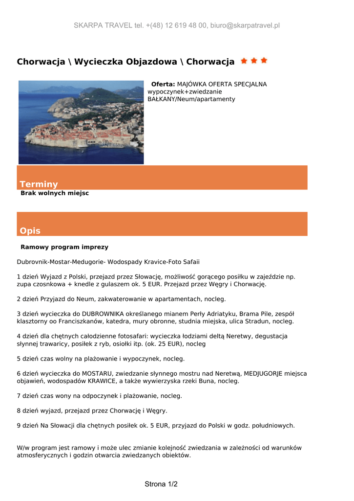 SKARPA TRAVEL tel. +(48) 12 619 48 00, [email protected] Chorwacja \ Wycieczka Objazdowa \ Chorwacja Oferta: MAJÓWKA OFERTA SPECJALNA wypoczynek+zwiedzanie BAŁKANY/Neum/apartamenty Terminy Brak wolnych miejsc Opis Ramowy program imprezy Dubrovnik-Mostar-Medugorie- Wodospady Kravice-Foto Safaii 1 dzień Wyjazd z Polski, przejazd przez Słowację, możliwość gorącego posiłku w zajeździe np. zupa czosnkowa + knedle z gulaszem ok. 5 EUR. Przejazd przez Węgry i Chorwację. 2 dzień Przyjazd do Neum, zakwaterowanie w apartamentach, nocleg. 3 dzień wycieczka do DUBROWNIKA określanego mianem Perły Adriatyku, Brama Pile, zespół klasztorny oo Franciszkanów, katedra, mury obronne, studnia miejska, ulica Stradun, nocleg. 4 dzień dla chętnych całodzienne fotosafari: wycieczka łodziami deltą Neretwy, degustacja słynnej trawaricy, posiłek z ryb, osiołki itp. (ok. 25 EUR), nocleg 5 dzień czas wolny na plażowanie i wypoczynek, nocleg. 6 dzień wycieczka do MOSTARU, zwiedzanie słynnego mostru nad Neretwą, MEDJUGORJE miejsca objawień, wodospadów KRAWICE, a także wywierzyska rzeki Buna, nocleg. 7 dzień czas wony na odpoczynek i plażowanie, nocleg. 8 dzień wyjazd, przejazd przez Chorwację i Węgry. 9 dzień Na Słowacji dla chętnych posiłek ok. 5 EUR, przyjazd do Polski w godz. południowych. W/w program jest ramowy i może ulec zmianie kolejność zwiedzania w zależności od warunków atmosferycznych i godzin otwarcia zwiedzanych obiektów. Strona 1/2 SKARPA TRAVEL tel. +(48) 12 619 48 00, [email protected] Uwagi 1.Na wstepy do zwiedzanych obiektow sugerujemy przeznaczyć ok. 30 EUR. Strona 2/2 Powered by TCPDF (www.tcpdf.org)