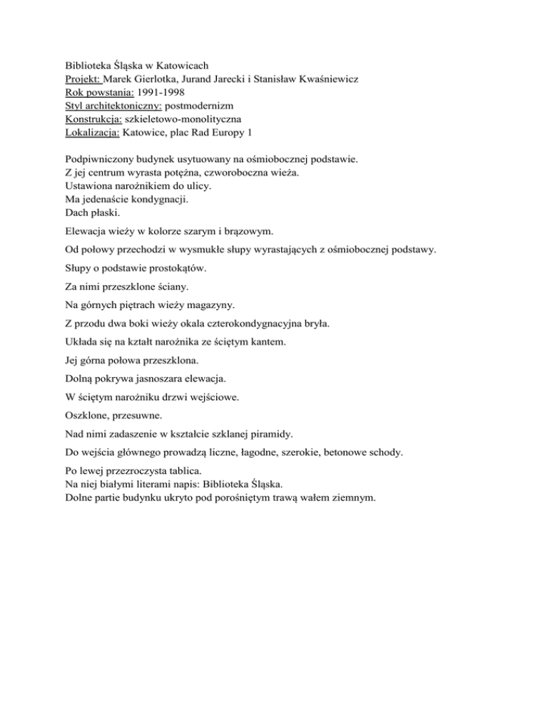 Biblioteka Śląska w Katowicach Projekt: Marek Gierlotka, Jurand Jarecki i Stanisław Kwaśniewicz Rok powstania: 1991-1998 Styl architektoniczny: postmodernizm Konstrukcja: szkieletowo-monolityczna Lokalizacja: Katowice, plac Rad Europy 1 Podpiwniczony budynek usytuowany na ośmiobocznej podstawie. Z jej centrum wyrasta potężna, czworoboczna wieża. Ustawiona narożnikiem do ulicy. Ma jedenaście kondygnacji. Dach płaski. Elewacja wieży w kolorze szarym i brązowym. Od połowy przechodzi w wysmukłe słupy wyrastających z ośmiobocznej podstawy. Słupy o podstawie prostokątów. Za nimi przeszklone ściany. Na górnych piętrach wieży magazyny. Z przodu dwa boki wieży okala czterokondygnacyjna bryła. Układa się na kztałt narożnika ze ściętym kantem. Jej górna połowa przeszklona. Dolną pokrywa jasnoszara elewacja. W ściętym narożniku drzwi wejściowe. Oszklone, przesuwne. Nad nimi zadaszenie w kształcie szklanej piramidy. Do wejścia głównego prowadzą liczne, łagodne, szerokie, betonowe schody. Po lewej przezroczysta tablica. Na niej białymi literami napis: Biblioteka Śląska. Dolne partie budynku ukryto pod porośniętym trawą wałem ziemnym.