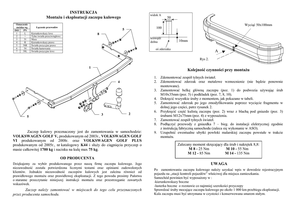 INSTRUKCJA MontaŜu i eksploatacji zaczepu kulowego Oznaczenie zacisku wg ISO PN 1 L 2 + 3 31 4 R 5 58R 6 54 7 58L Łączenie przewodów widok A Wyciąć 50x100mm 100 5 Kierunkowskazy lewe Tylne światła przeciwmgłowe Masa Kierunkowskazy prawe Światła pozycyjne prawe Światła hamowania Światła pozycyjne lewe 80 50 8 krawędź dolna 10mm oś zderzaka A Rys 2. 1 Kolejność czynności przy montaŜu 4 3 5 2 Zaczep kulowy przeznaczony jest do zamontowania w samochodzie: VOLKSWAGEN GOLF V, produkowanym od 2003r., VOLKSWAGEN GOLF VI produkowanym od 2008r. oraz VOLKSWAGEN GOLF PLUS produkowanym od 2005r., nr katalogowy K44 i słuŜy do ciągnięcia przyczep o masie całkowitej 1700 kg i nacisku na kulę max 75 kg. 1. Zdemontować zespół tylnych świateł. 2. Zdemontować zderzak oraz metalowe wzmocnienie (nie będzie ponownie montowane). 3. Zamontować belkę główną zaczepu (poz. 1) do podwozia uŜywając śrub M10x35mm (poz. 5) i podkładek (poz. 7, 8, 10). 4. Dokręcić wszystkie śruby z momentem, jak pokazano w tabeli. 5. Zamontować zderzak po jego zmodyfikowaniu poprzez wycięcie fragmentu w dolnej jego części, patrz rysunek 2. 6. Przykręcić część kulistą zaczepu (poz. 2) wraz z blachą pod gniazdo (poz. 3) śrubami M12x75mm (poz. 4) z wyposaŜenia. 7. Zamontować zespół tylnych świateł. 8. Podłączyć przewody z gniazdka 7 – bieg. do instalacji elektrycznej zgodnie z instrukcją fabryczną samochodu (zaleca się wykonanie w ASO). 9. Uzupełnić ewentualne ubytki powłoki malarskiej zaczepu powstałe w trakcie montaŜu. Zalecany moment skręcający dla śrub i nakrętek 8,8: M 8 - 25 Nm M 10 - 55 Nm M 12 - 85 Nm M 14 - 135 Nm OD PRODUCENTA Dziękujemy za wybór produkowanego przez naszą firmę zaczepu kulowego. Jego niezawodność została potwierdzona licznymi testami oraz opiniami zadowolonych klientów. JednakŜe niezawodność zaczepów kulowych jest zaleŜna równieŜ od prawidłowego montaŜu oraz prawidłowej eksploatacji. Z tego powodu prosimy Państwa o staranne przeczytanie niniejszej instrukcji montaŜu oraz przestrzeganie zawartych wskazówek. Zaczep naleŜy zamontować w miejscach do tego celu przeznaczonych przez producenta samochodu. UWAGA Po zamontowaniu zaczepu kulowego naleŜy uzyskać wpis w dowodzie rejestracyjnym pojazdu na „stacji kontroli pojazdów” właściwej dla miejsca zamieszkania. Samochód powinien być wyposaŜony w : -kierunkowskazy boczne -lusterka boczne o rozstawie co najmniej szerokości przyczepy Sprawdzać śruby mocujące zaczepu kulowego po około 1 000 km przebiegu eksploatacji. Kula zaczepu musi być utrzymana w czystości i konserwowana smarem stałym. WyposaŜenie zaczepu: PPUH AUTO-HAK S.J. Produkcja Zaczepów Kulowych Henryk & Zbigniew Nejman 76-200 SŁUPSK ul. Słoneczna 16K tel/fax (059) 8-414-414; 8-414-413 E-mail: [email protected] www. autohak.com.pl Zaczep kulowy bez wyposaŜenia elektrycznego K44 Klasa: A50-X Nr kat. Przeznaczony do zamontowania w samochodzie: Producent: VOLKSWAGEN Model: GOLF V produkowanym od 2003r. oraz Model: GOLF VI produkowanym od 2008r. oraz Model: GOLF PLUS produkowanym od 2005r. KARTA GWARANCYJNA Producent udziela gwarancji niniejszą kartą gwarancyjną na okres 24 miesięcy licząc od dnia zakupu zaczepu kulowego do samochodu: VOLKSWAGEN GOLF V produkowanego od 2003r. oraz VOLKSWAGEN GOLF VI produkowanego od 2008r. oraz VOLKSWAGEN GOLF PLUS produkowanego od 2005r. Data produkcji .............................. Data zakupu.................................. Zakres gwarancji obejmuje wyłącznie wady jakościowe wynikające z winy producenta. Gwarancja nie obejmuje natomiast uszkodzeń zawinionych przez nabywcę, wynikających z niewłaściwego montaŜu, uŜytkowania lub konserwacji, uszkodzeń mechanicznych, normalnego zuŜycia podczas eksploatacji itp. Gwarancja udzielona na zakupiony towar nie wyłącza, nie ogranicza ani nie zawiesza uprawnień kupującego wynikających z niezgodności towaru z umową. Reklamacje naleŜy zgłaszać w punkcie sprzedaŜy, składając jednocześnie kartę gwarancyjną. Usunięcie "wady" następuje po stwierdzeniu przez punkt sprzedaŜy wspólnie z producentem słuszności złoŜonej reklamacji. Reklamacja powinna być załatwiona w ciągu 14 dni od dnia uznania reklamacji. Karta gwarancyjna jest niewaŜna jeŜeli nie jest wypełniona i podpisana. Dane techniczne: Wartość siły D : 8,82 kN maksymalna masa przyczepy: 1700 kg maksymalny nacisk na kulę: 75 kg Numer homologacji zgodnie z wytycznymi regulaminu EKG/ONZ 55.01: E20-55R-01 1193 INFORMACJA WSTĘPNA Zaczep kulowy jest skonstruowany zgodnie z zasadami bezpieczeństwa ruchu drogowego. Zaczep kulowy jest elementem wpływającym na bezpieczeństwo jazdy i moŜe zostać zainstalowany wyłącznie przez personel wyspecjalizowany. Niedopuszczalne jest dokonywanie jakichkolwiek zmian w konstrukcji zaczepu. Powoduje to wygaśniecie dopuszczenia do stosowania. W przypadku obecności masy izolacyjnej lub osłony podwozia w miejscu przylegania zaczepu, naleŜy ją usunąć. Nieosłonięte miejsca karoserii oraz wywiercone otwory naleŜy pomalować farbą antykorozyjną. Informacjami wiąŜącymi odnośnie wartości obciąŜeń są dane podawane przez producenta samochodu, względnie wartości maksymalnej masy przyczepy oraz maksymalnego nacisku na kulę, przy czym wartości parametrów zaczepu kulowego nie mogą być przekroczone. Wzór do obliczania wartości siły D: Maks. masa przyczepy [kg] x Maks. masa samochodu [kg] Maks. masa przyczepy [kg] + Maks. masa samochodu [kg] Data zgłoszenia reklamacji: ................................................................... X 9,81 = 1000 D [kN]