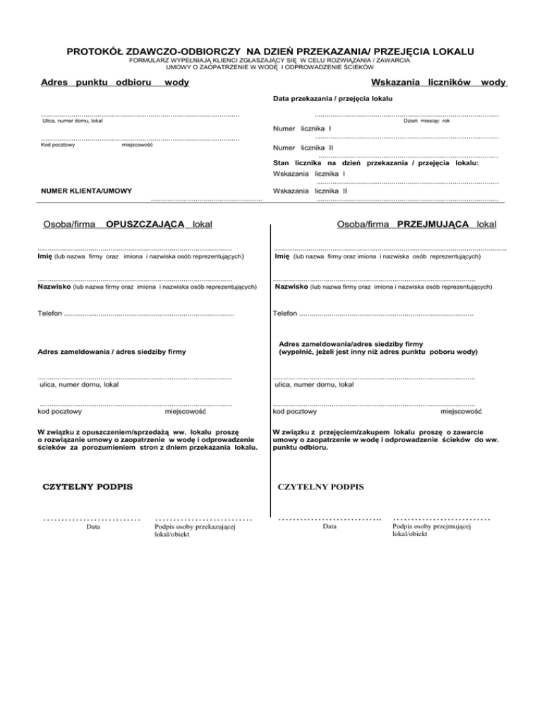 PROTOKÓŁ ZDAWCZO-ODBIORCZY NA DZIEŃ PRZEKAZANIA/ PRZEJĘCIA LOKALU FORMULARZ WYPEŁNIAJĄ KLIENCI ZGŁASZAJĄCY SIĘ W CELU ROZWIĄZANIA / ZAWARCIA UMOWY O ZAOPATRZENIE W WODĘ I ODPROWADZENIE ŚCIEKÓW Adres punktu odbioru wody Wskazania liczników wody Data przekazania / przejęcia lokalu .................................................................................................. ........................................................................................... Ulica, numer domu, lokal Dzień miesiąc rok .................................................................................................. Kod pocztowy miejscowość Numer licznika II ......................................................................................... Stan licznika na dzień przekazania / przejęcia lokalu: NUMER KLIENTA/UMOWY ....................................................... Osoba/firma Numer licznika I ........................................................................................... Wskazania licznika I .......................................................................................... Wskazania licznika II .......................................................................................... OPUSZCZAJĄCA lokal Osoba/firma PRZEJMUJĄCA lokal ................................................................................................ Imię (lub nazwa firmy oraz imiona i nazwiska osób reprezentujących) ................................................................................................................... Imię (lub nazwa firmy oraz imiona i nazwiska osób reprezentujących) ................................................................................................ Nazwisko (lub nazwa firmy oraz imiona i nazwiska osób reprezentujących) .................................................................................................... Nazwisko (lub nazwa firmy oraz imiona i nazwiska osób reprezentujących) Telefon .................................................................................... Telefon ...................................................................................... Adres zameldowania / adres siedziby firmy Adres zameldowania/adres siedziby firmy (wypełnić, jeżeli jest inny niż adres punktu poboru wody) ................................................................................................ ulica, numer domu, lokal .................................................................................................... ulica, numer domu, lokal ............................................................................................... kod pocztowy miejscowość .................................................................................................... kod pocztowy miejscowość W związku z opuszczeniem/sprzedażą ww. lokalu proszę o rozwiązanie umowy o zaopatrzenie w wodę i odprowadzenie ścieków za porozumieniem stron z dniem przekazania lokalu. W związku z przejęciem/zakupem lokalu proszę o zawarcie umowy o zaopatrzenie w wodę i odprowadzenie ścieków do ww. punktu odbioru. CZYTELNY PODPIS ……………………… Data CZYTELNY PODPIS ……………………… Podpis osoby przekazującej lokal/obiekt ……………………….. Data ……………………… Podpis osoby przejmującej lokal/obiekt